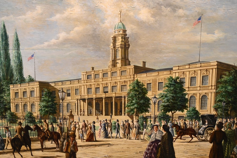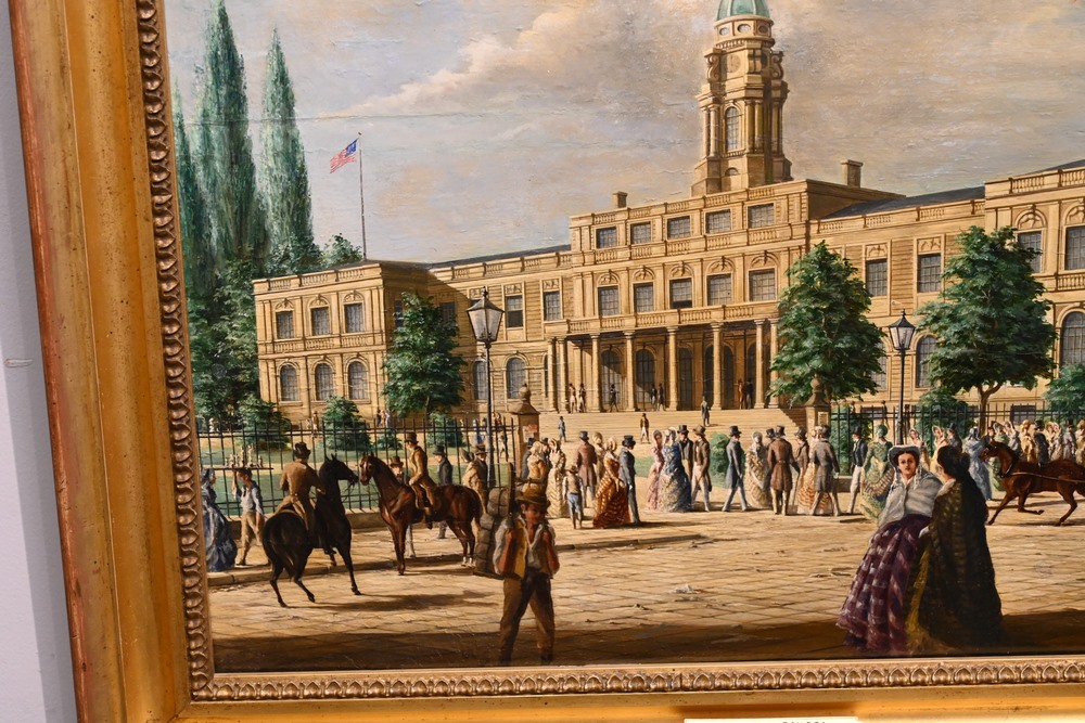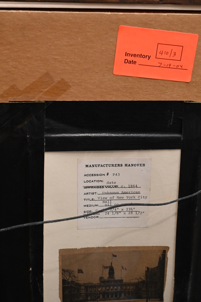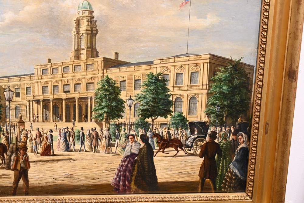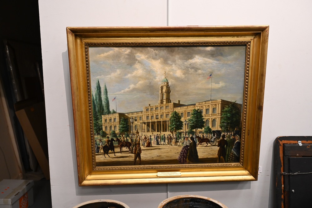 Lot 406: American School 19th century View of New York City Hall circa 1864 oil on panel unsigned 19 x 23 1/2 inches