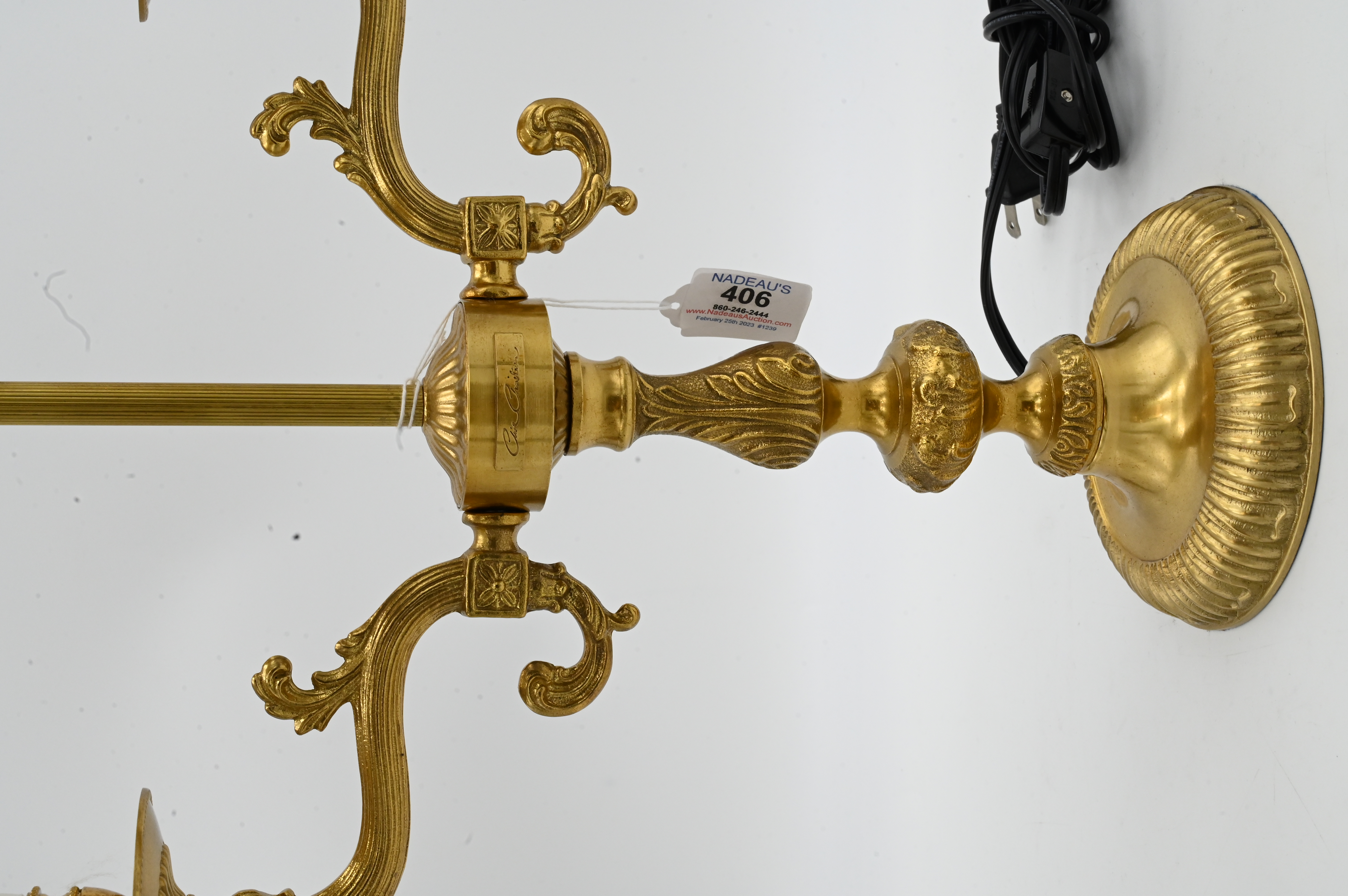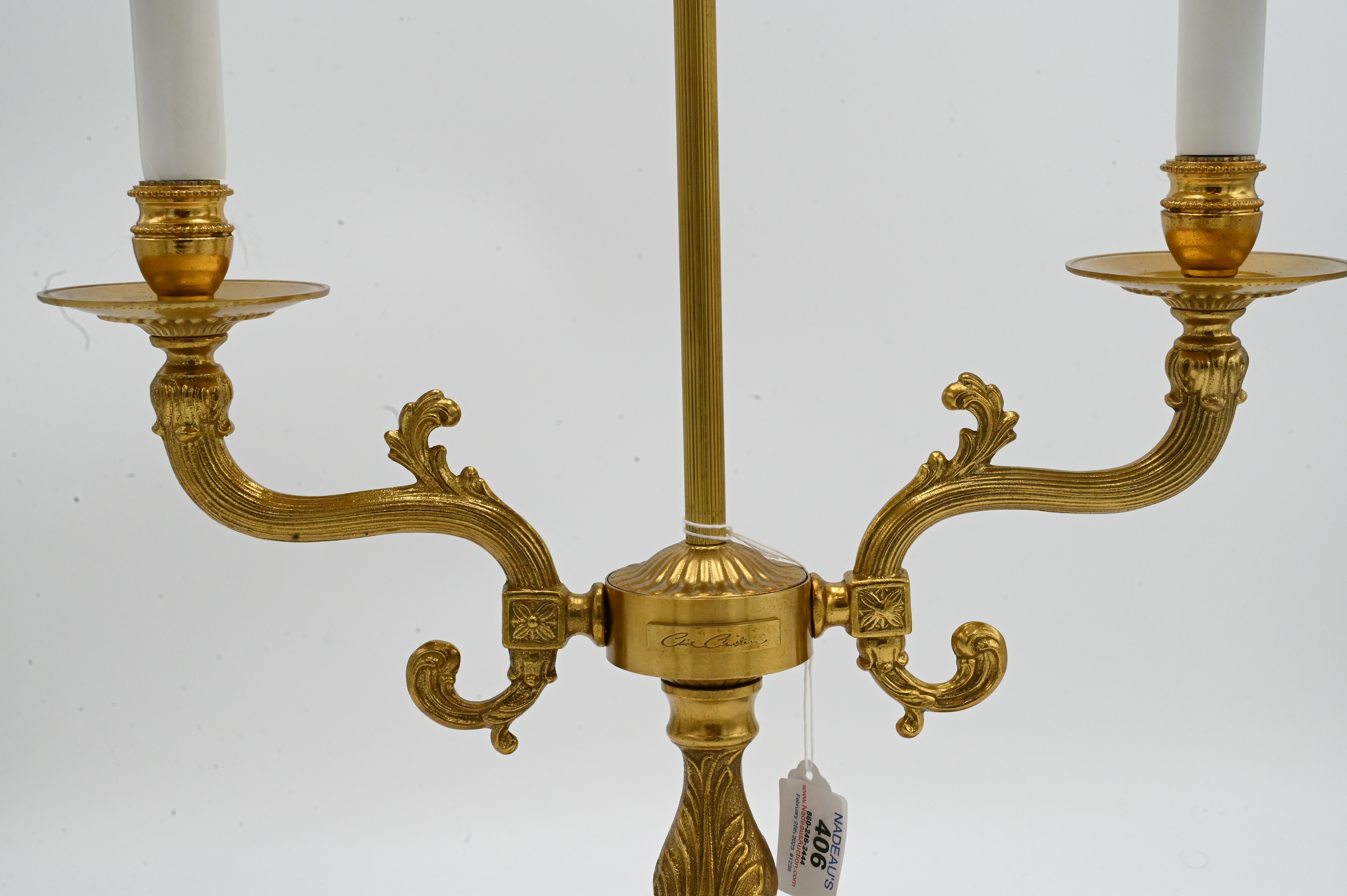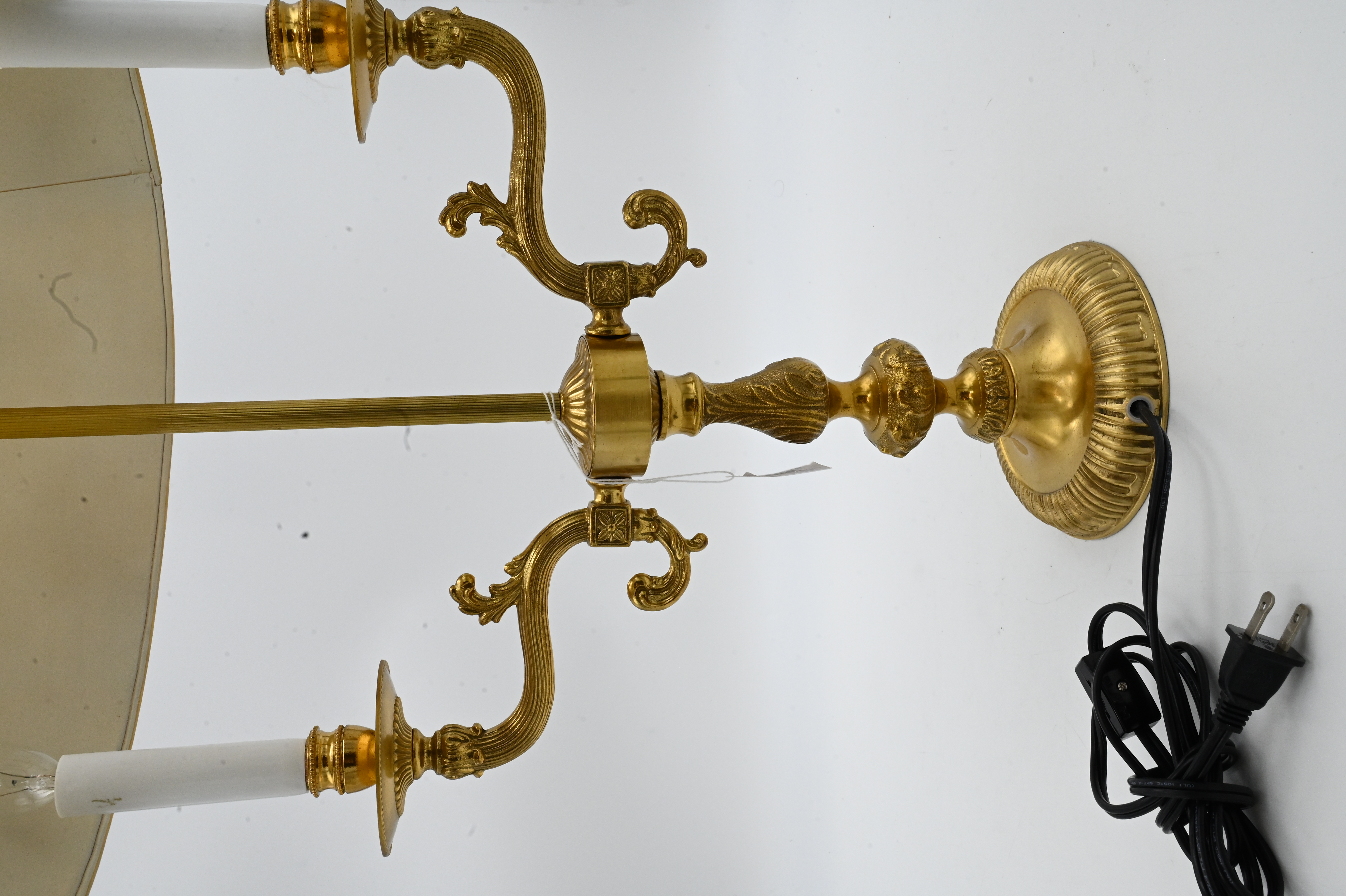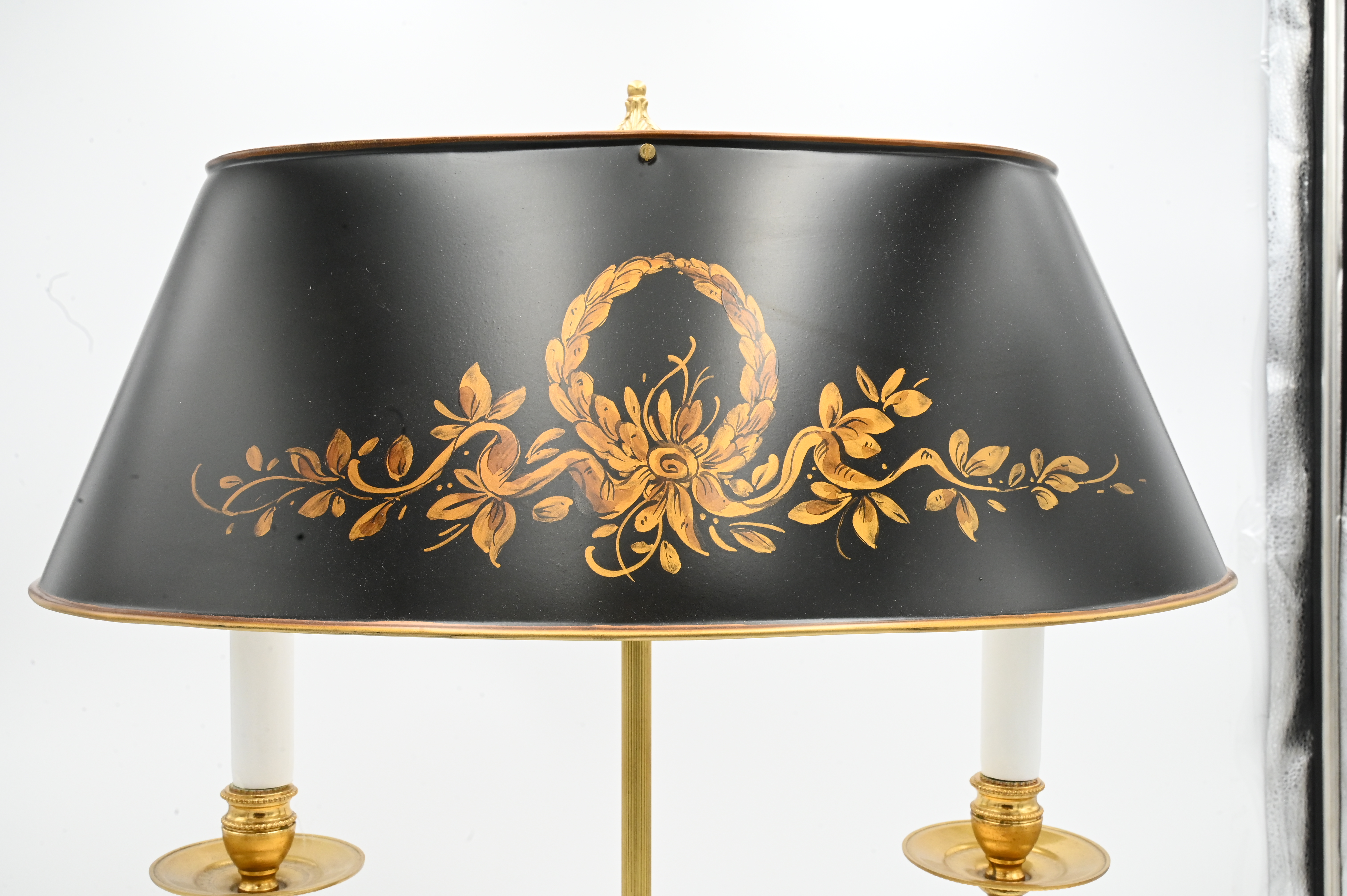 Contemporary Custom Large Brass Bouillotte Table Lamp, French style two light with tole shade, based possibly signed Chris Christian, height 24 inches