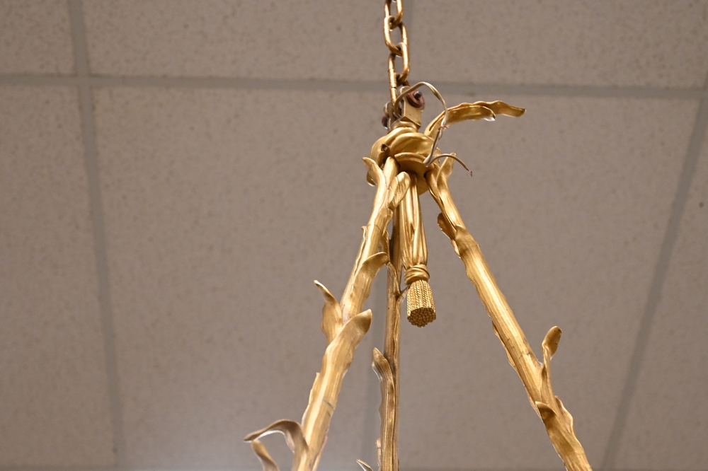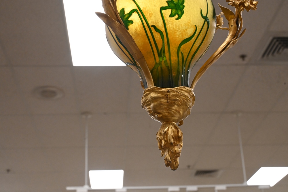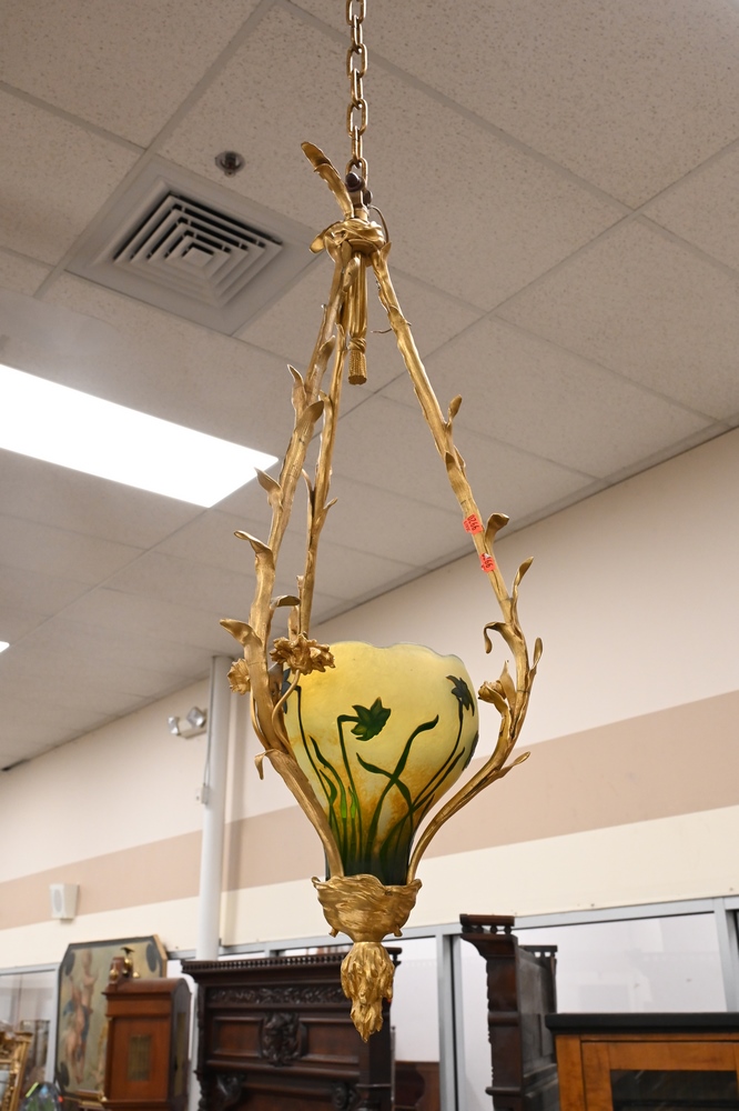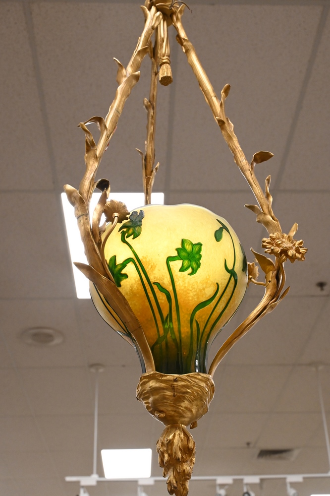 Lot 406: Daum Nancy Acid Etched Shade, in Art Nouveau gilt bronze, hanging light, height 37 inches plus chain.