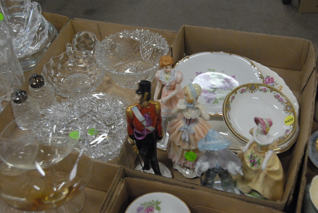 Five box lots crystal, stems, pitchers, porcelain figures, cups, and saucers.
