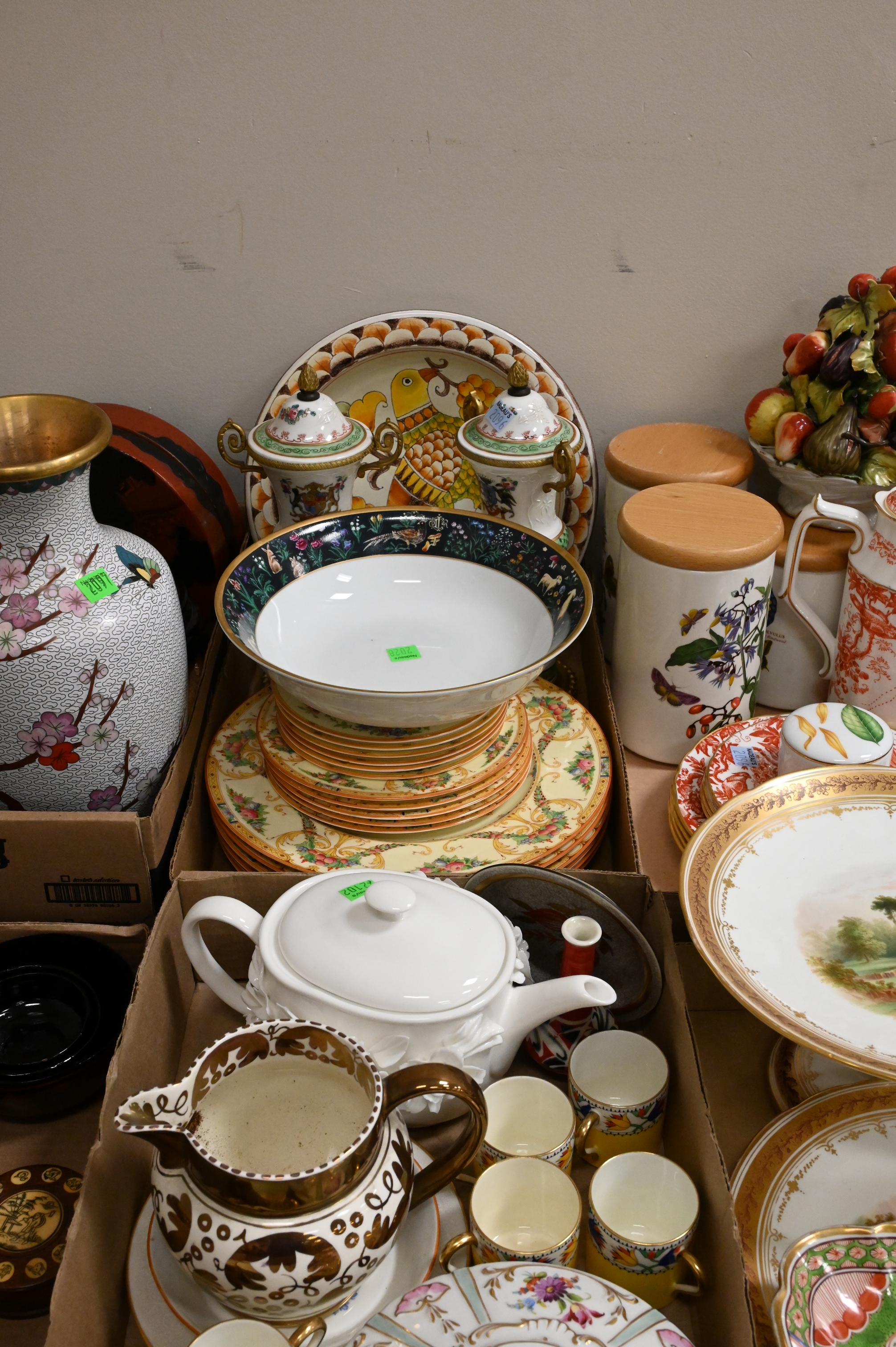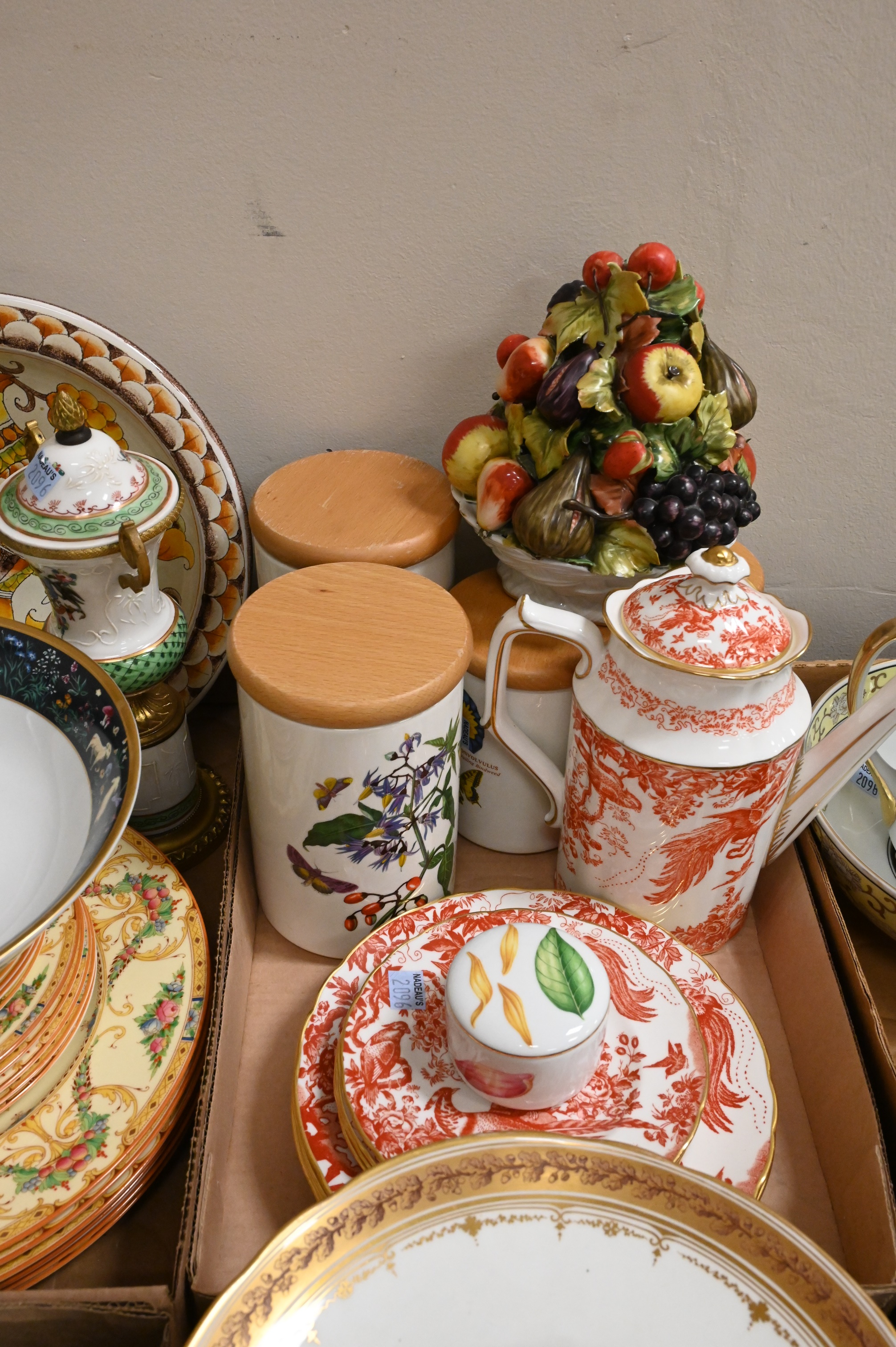 Four Tray Lots of European Porcelain Dishware, to include Royal Crown Derby “Red Ares” coffee pot, Royal Worcester “Riviera”, along with Samson urns, painted cake plates, etc.. tallest height 11 1/2 inches.