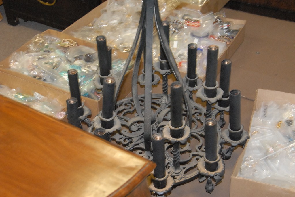 Group lot hanging light, iron hanging light, bombay small chest, and two andirons.