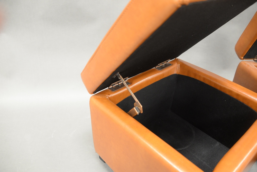 Pair of Brown Leather Ottomans, having lift top opening to storage, height 15 1/2 inches, width 18 inches, depth 17 1/2 inches.