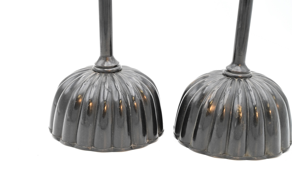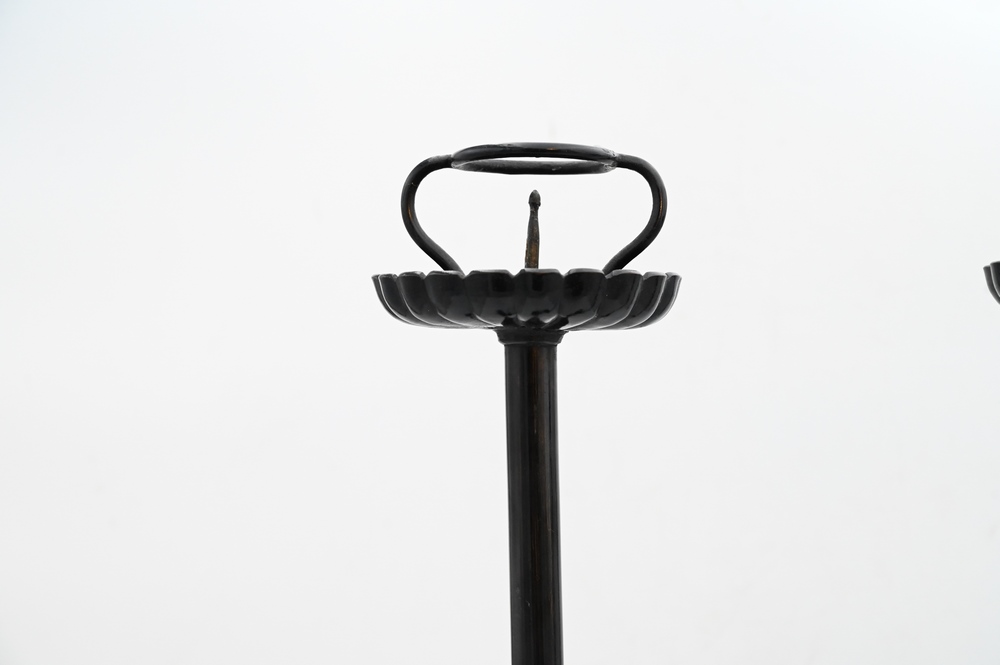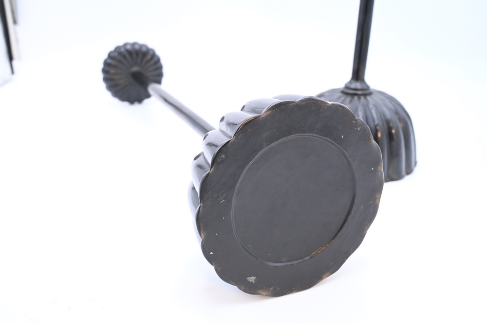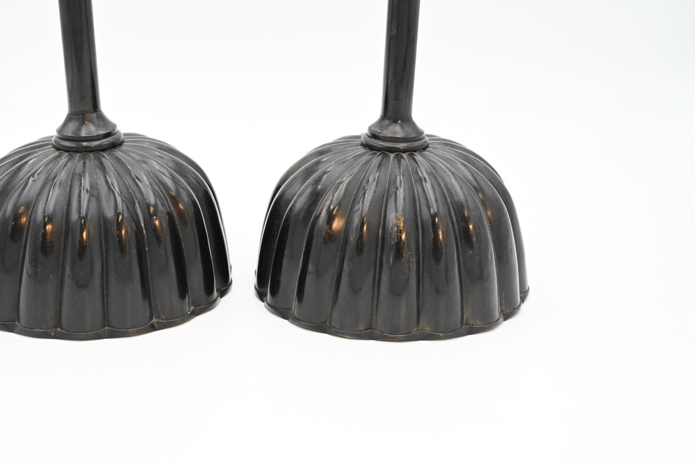 Lot 406: Pair of Japanese Brass Pricketts, painted black with scalloped bobeche, cylindrical body and ribbed base, height 26 inches,