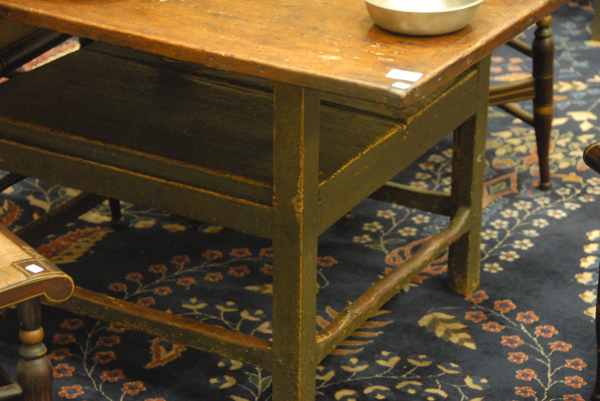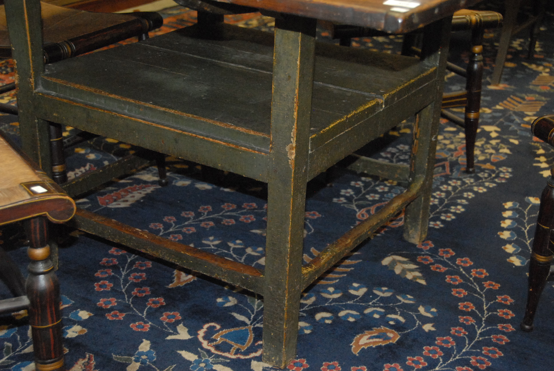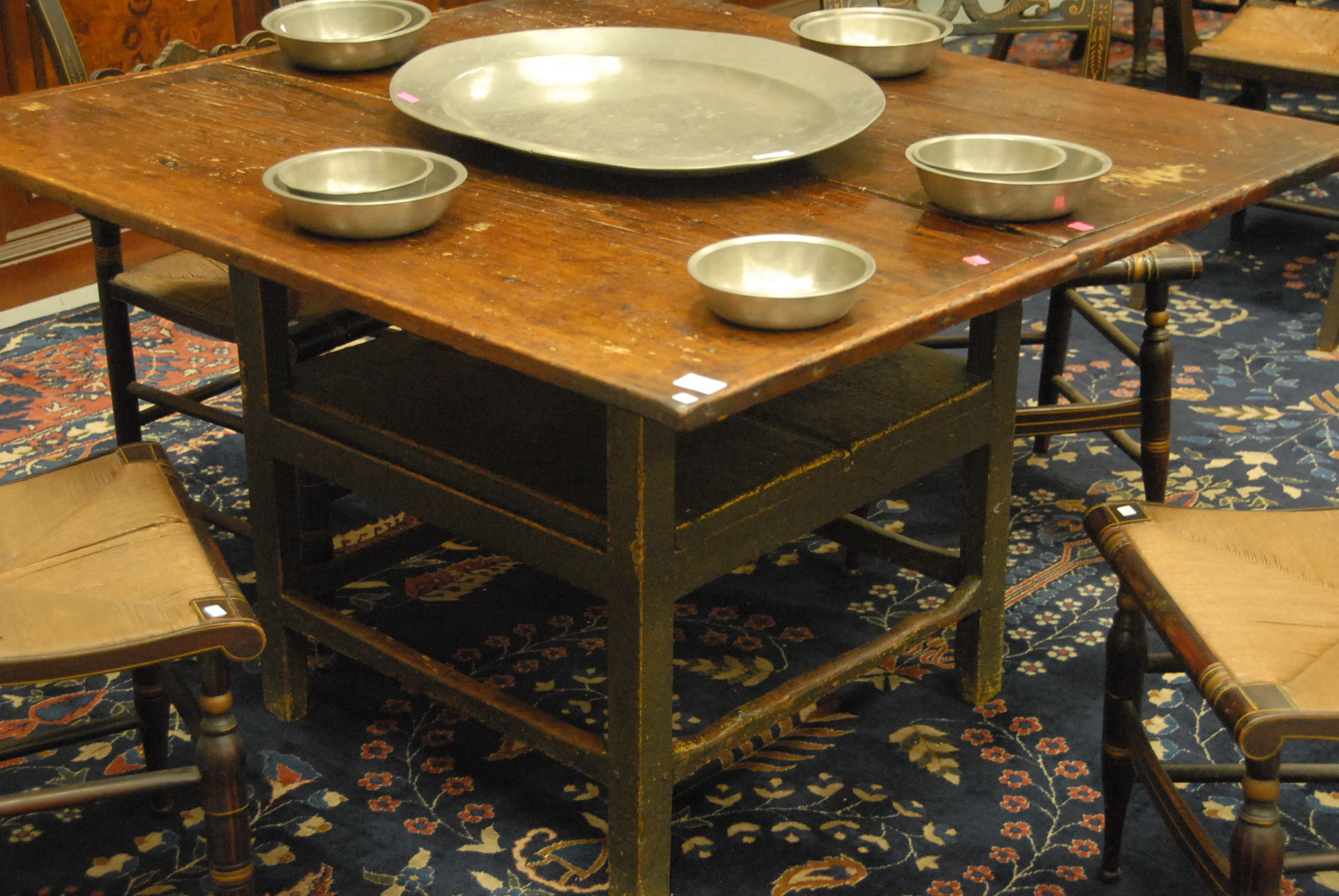 Lot 406: Primitive chair table, top with bread board ends set on base with squared legs. ht. 28 1/2 in. top: 43 x 47 1/2