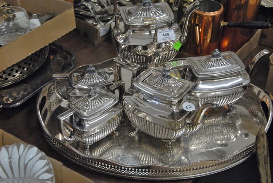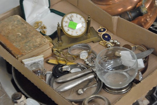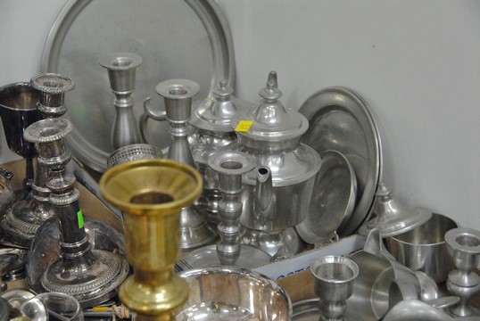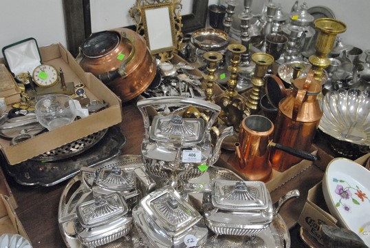 Lot 406: Six box lots to include silverplated tea set, silverplate, pewter, candlesticks, bowls, brass candlesticks, copper pots, costume jew…