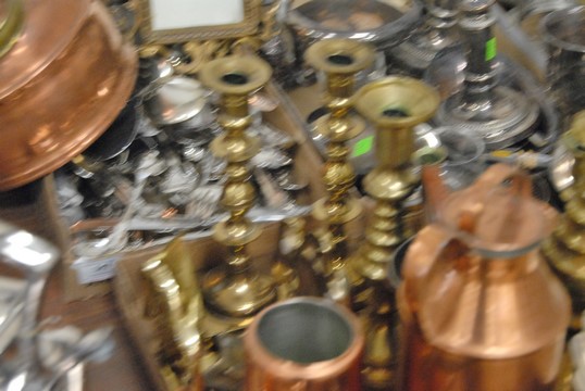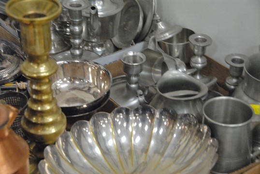 Six box lots to include silverplated tea set, silverplate, pewter, candlesticks, bowls, brass candlesticks, copper pots, costume jewelry etc.