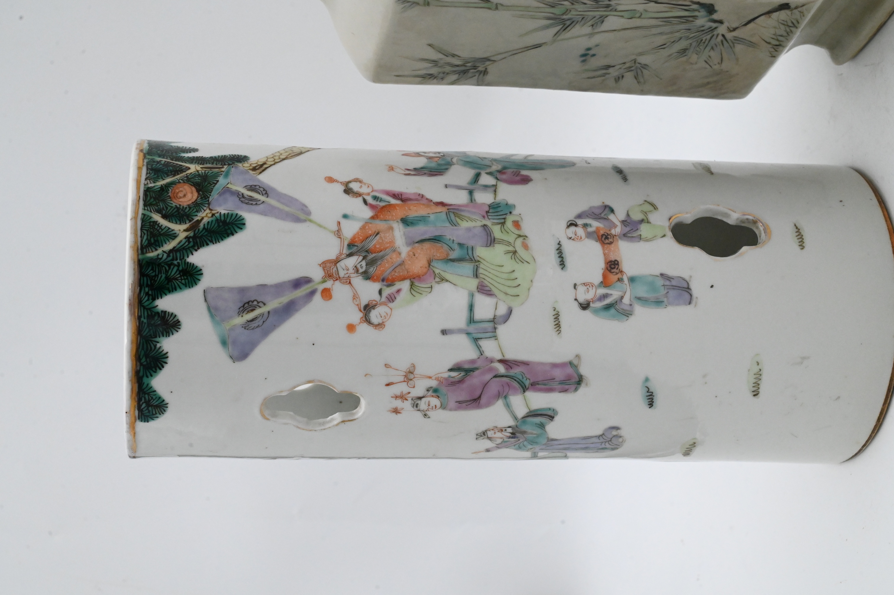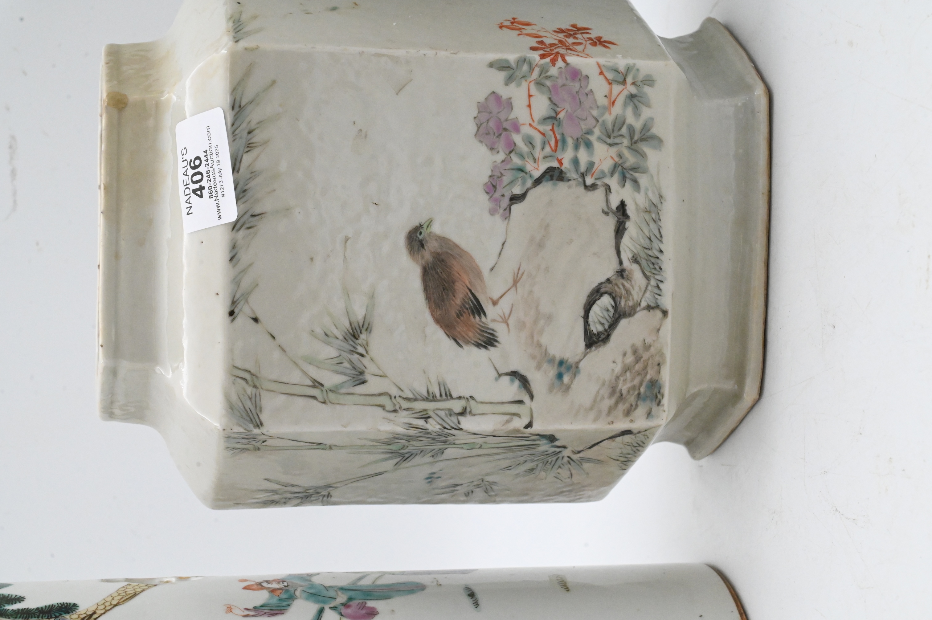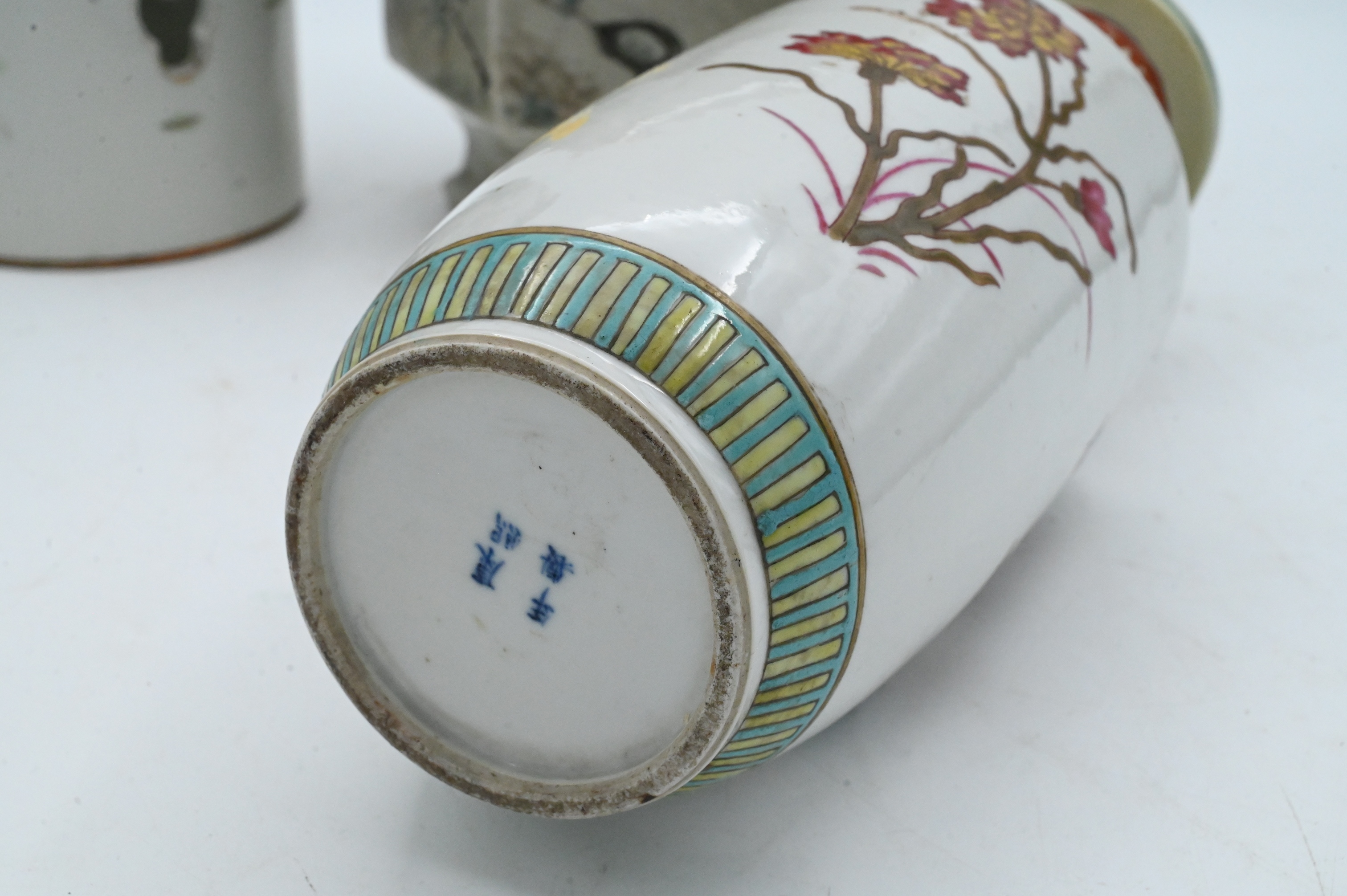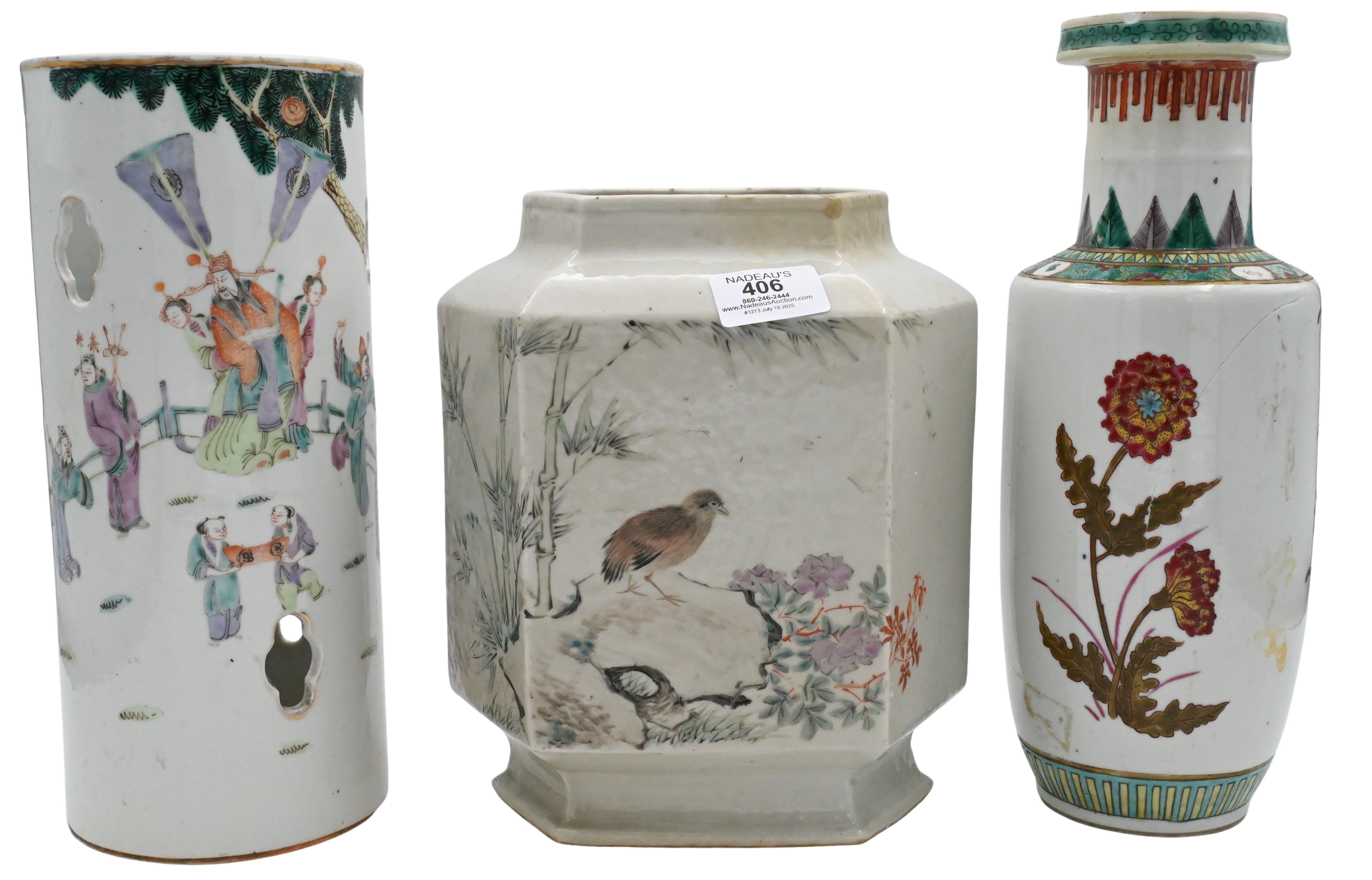 to include pieced cylinder vase with scholar motif, one hexagonal vase having bird in a landscape motif along with enameled floral vase