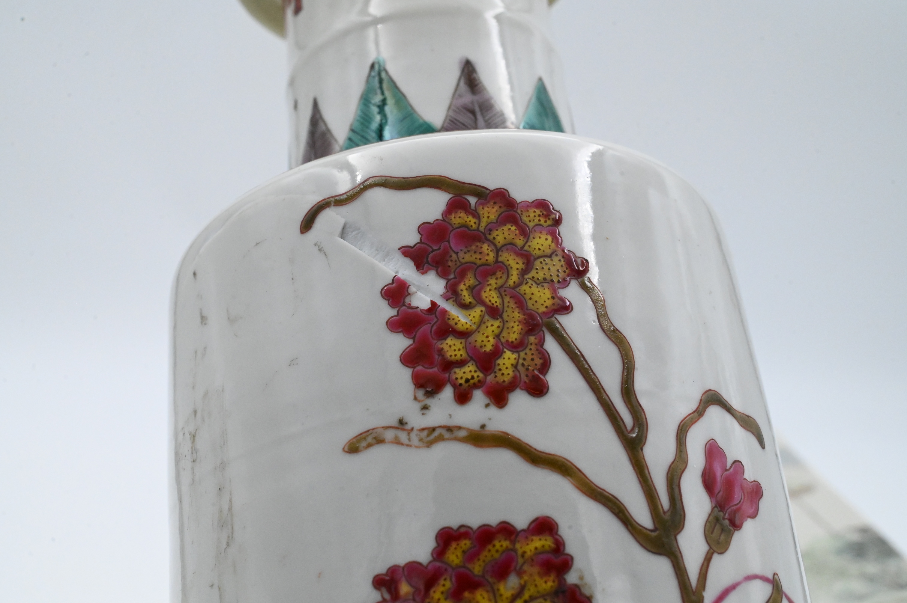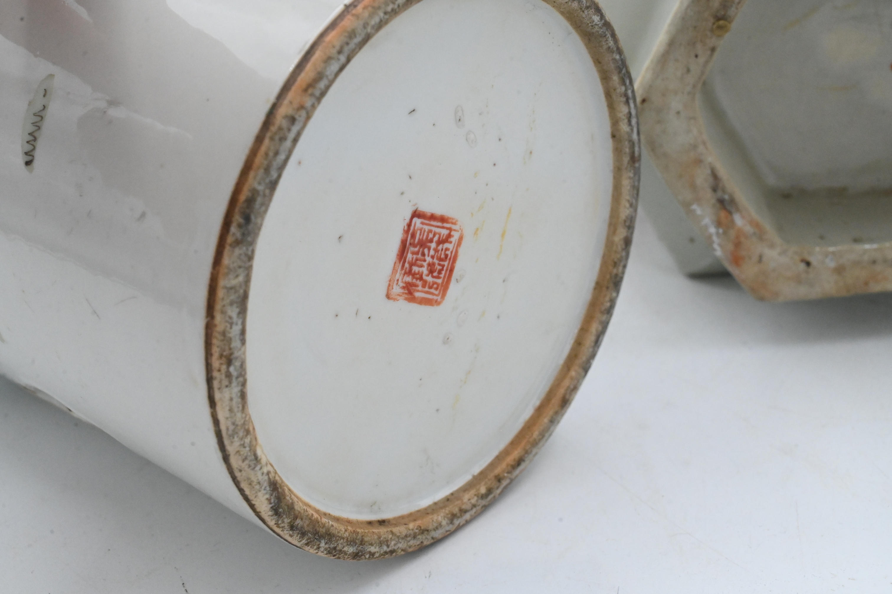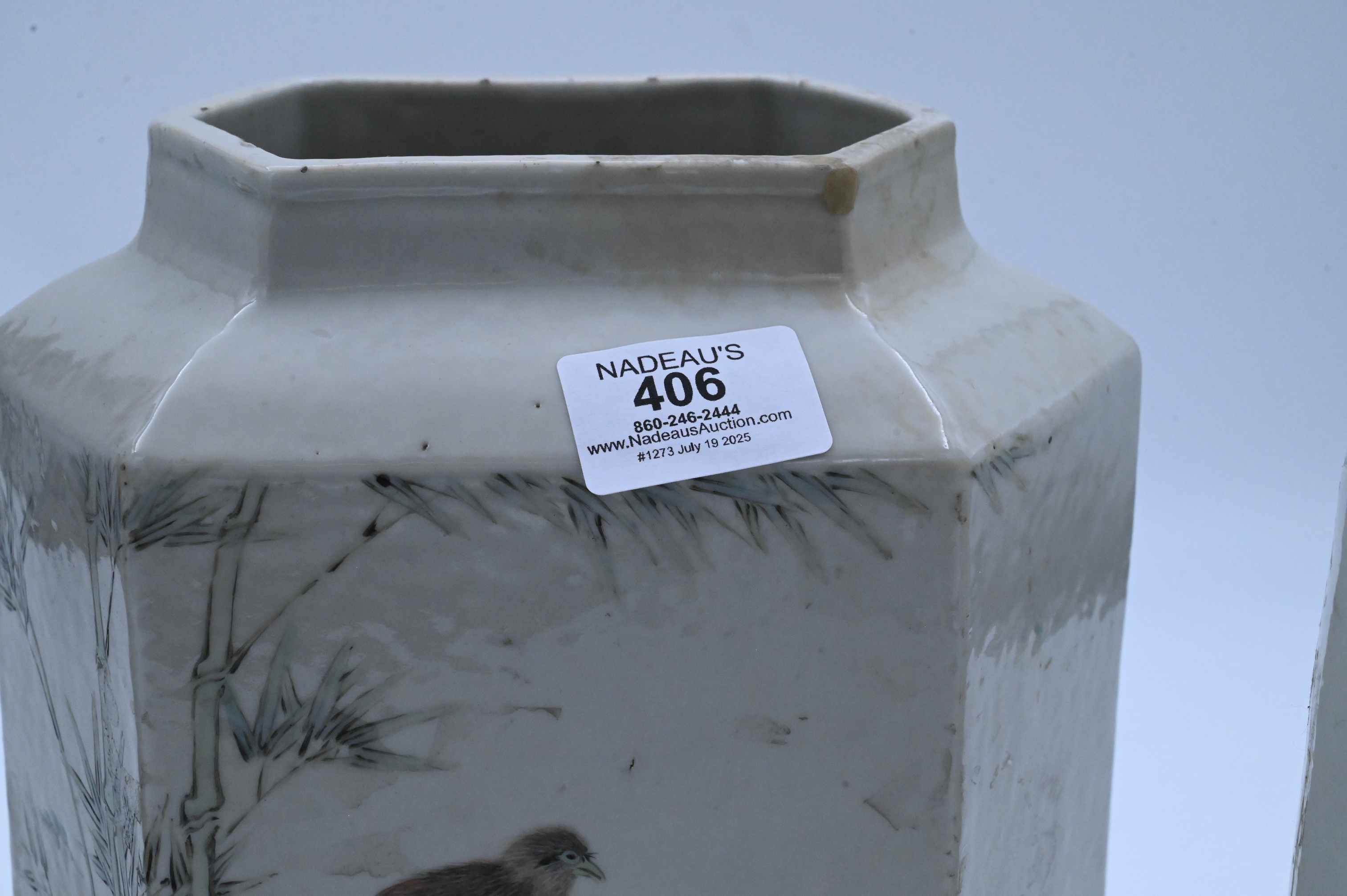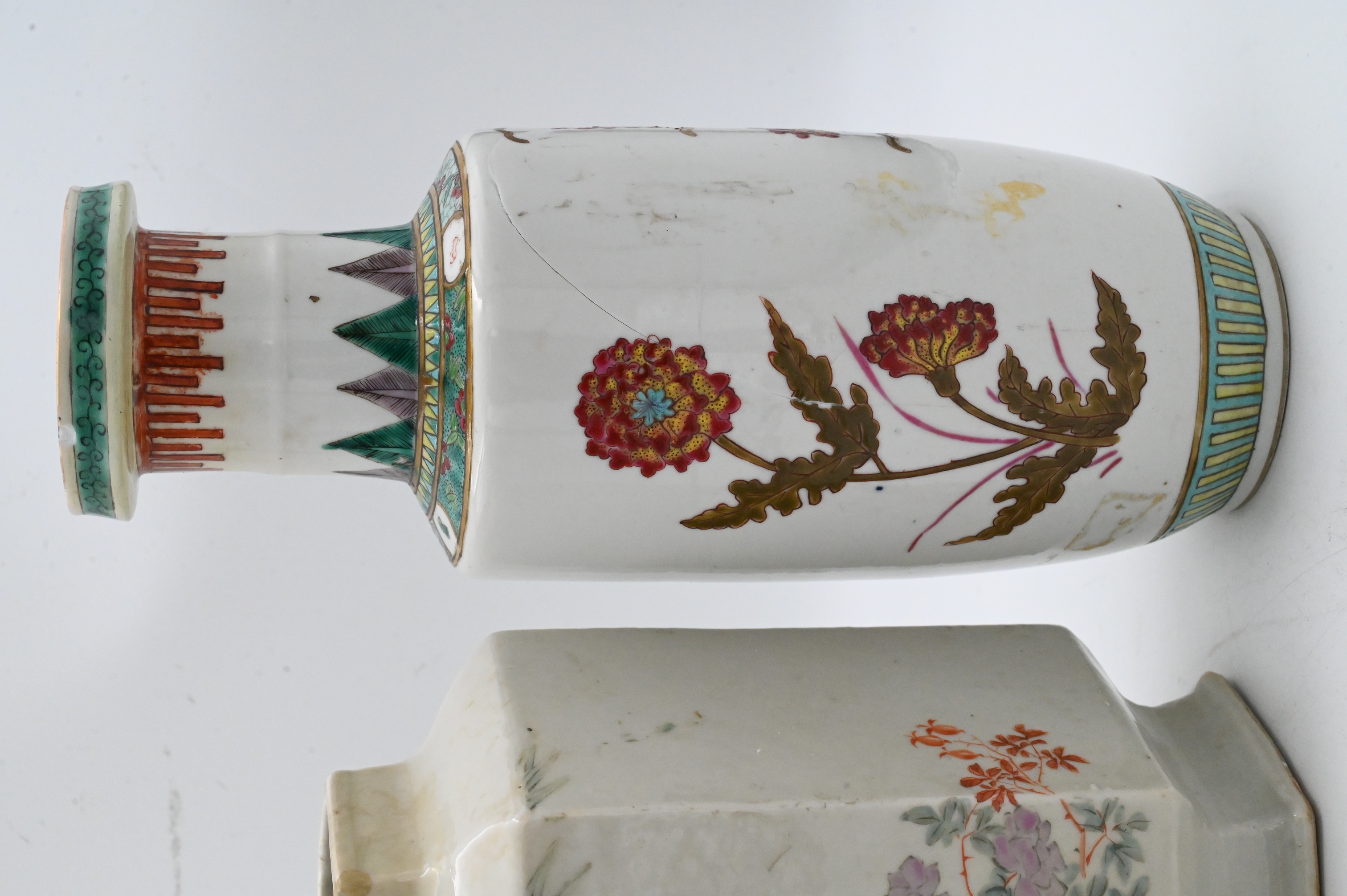 to include pieced cylinder vase with scholar motif, one hexagonal vase having bird in a landscape motif along with enameled floral vase