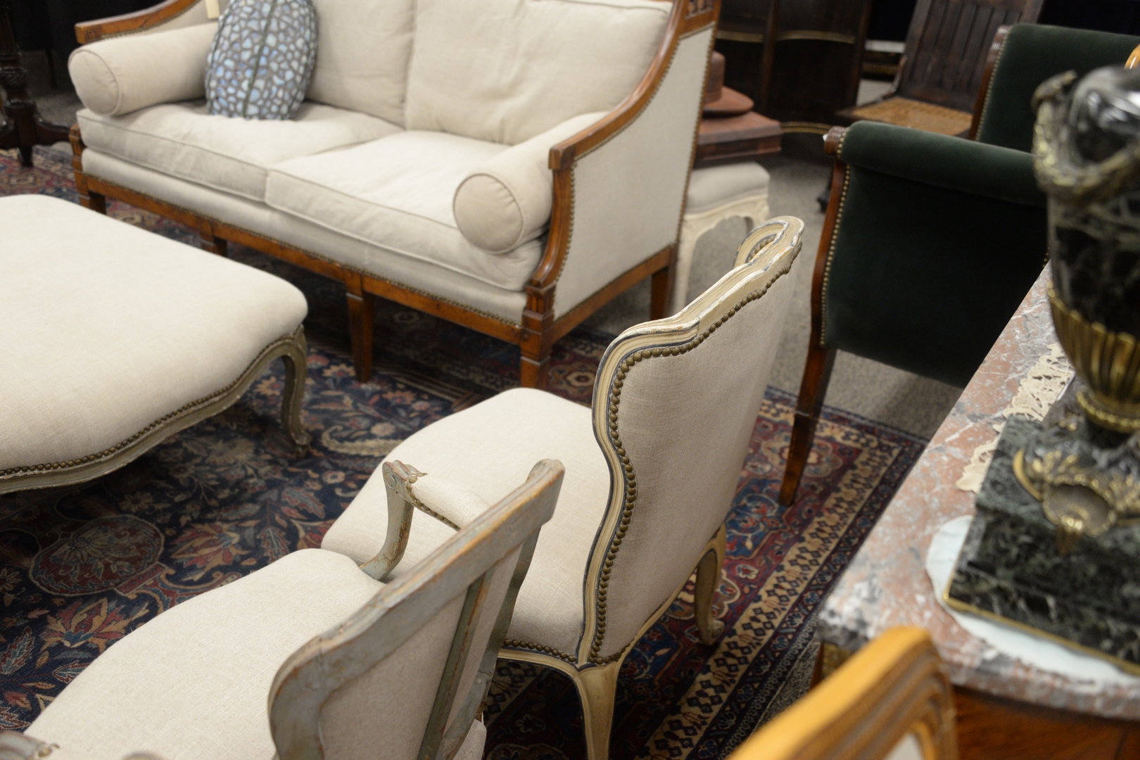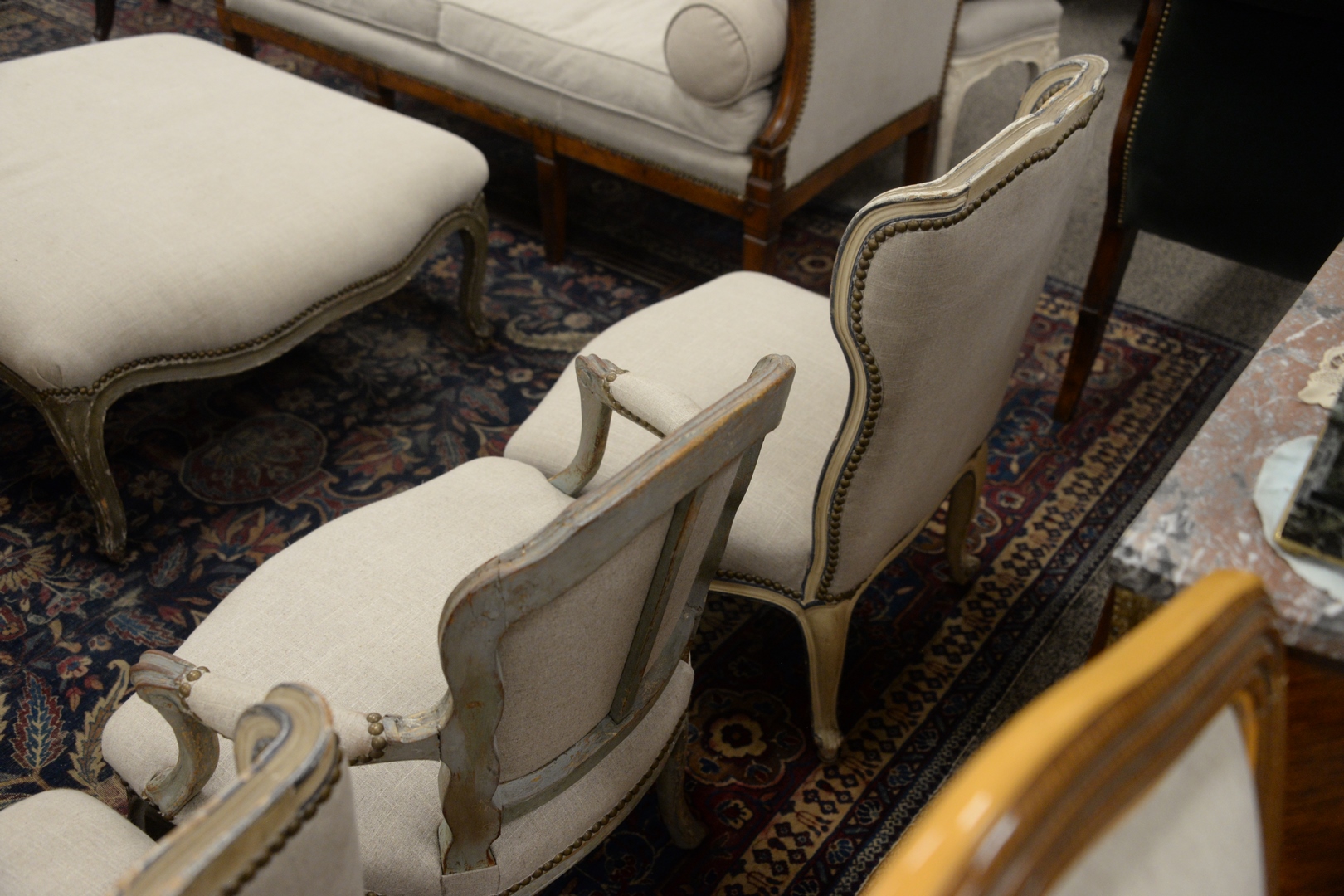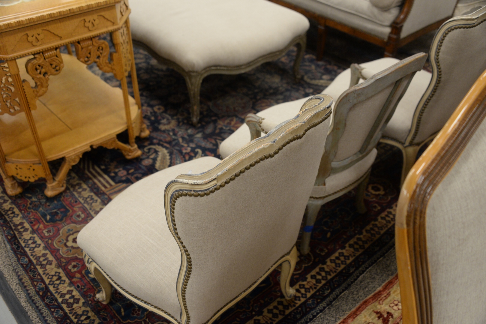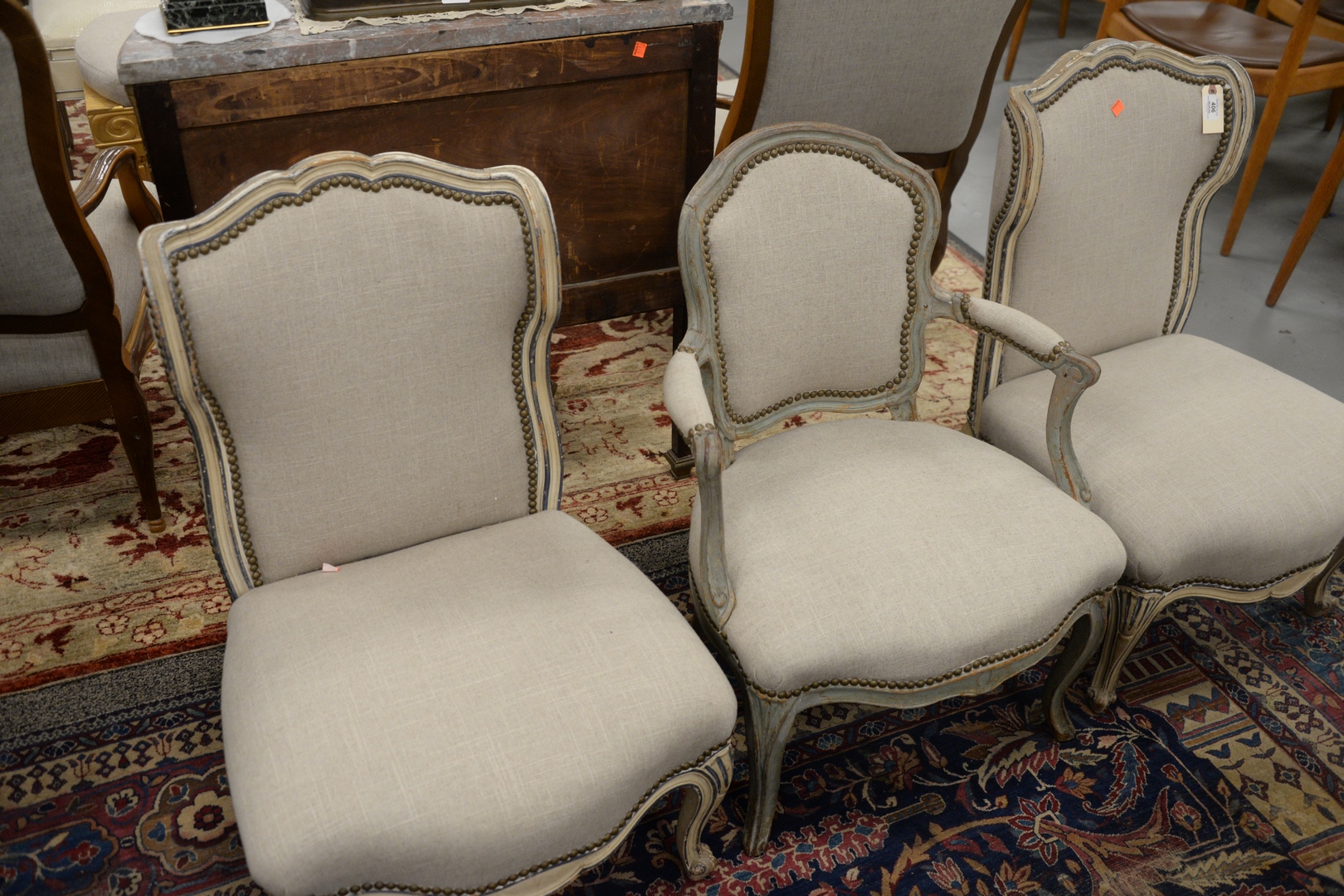 Lot 406: Three Piece Lot, to include pair of Louis XV style slipper chairs, newly upholstered along with a child’s size Louis XV style fauteuil, seat height 14 inches height 32 inches, width 21 inches.