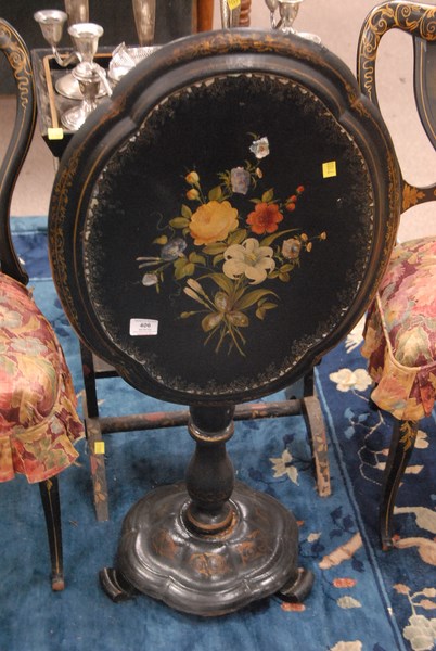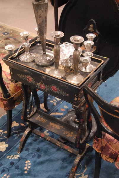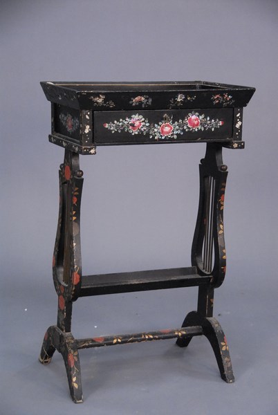 Two piece lot to include Victorian papier mache tip table and paint decorated sewing stand.