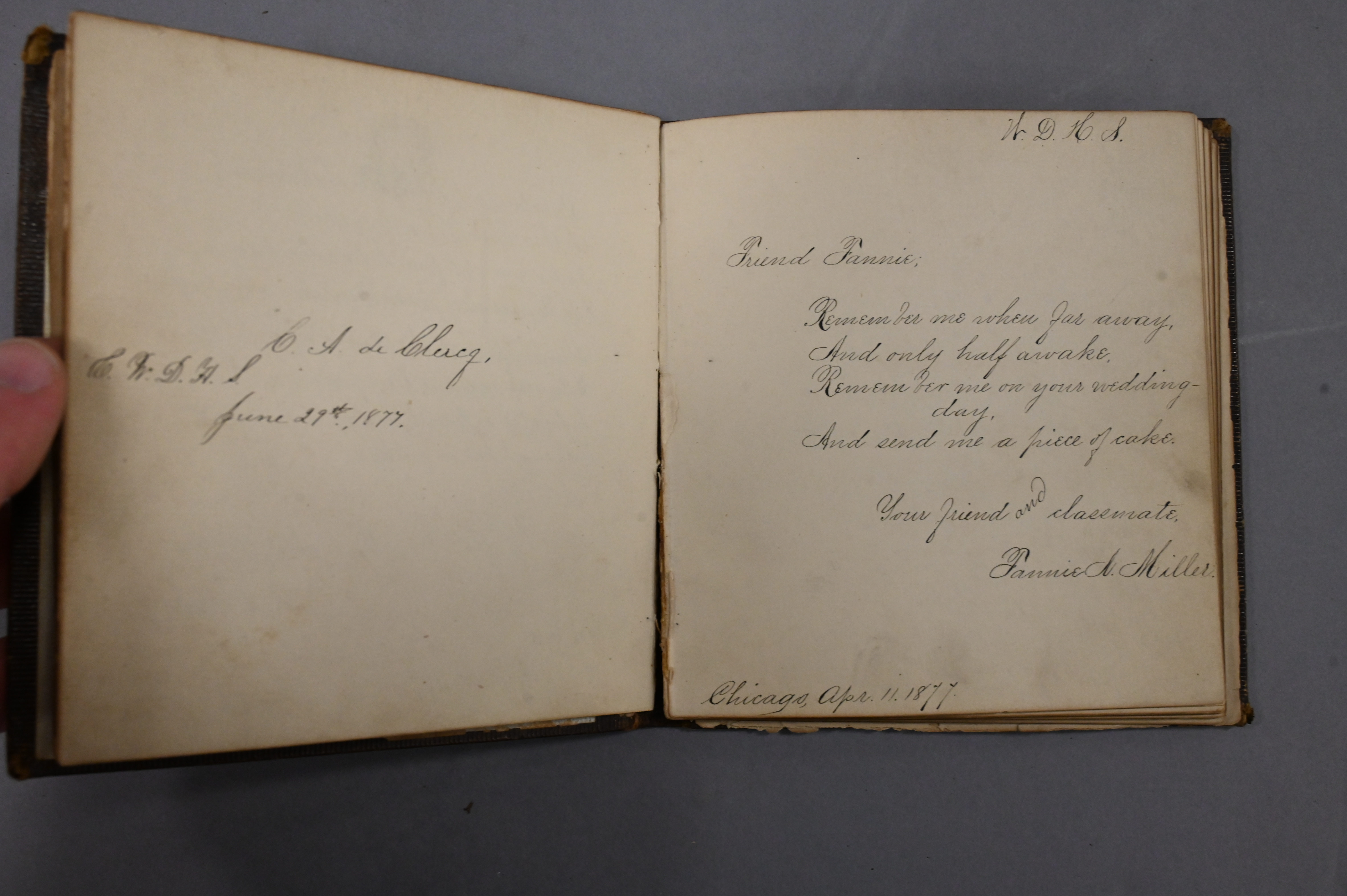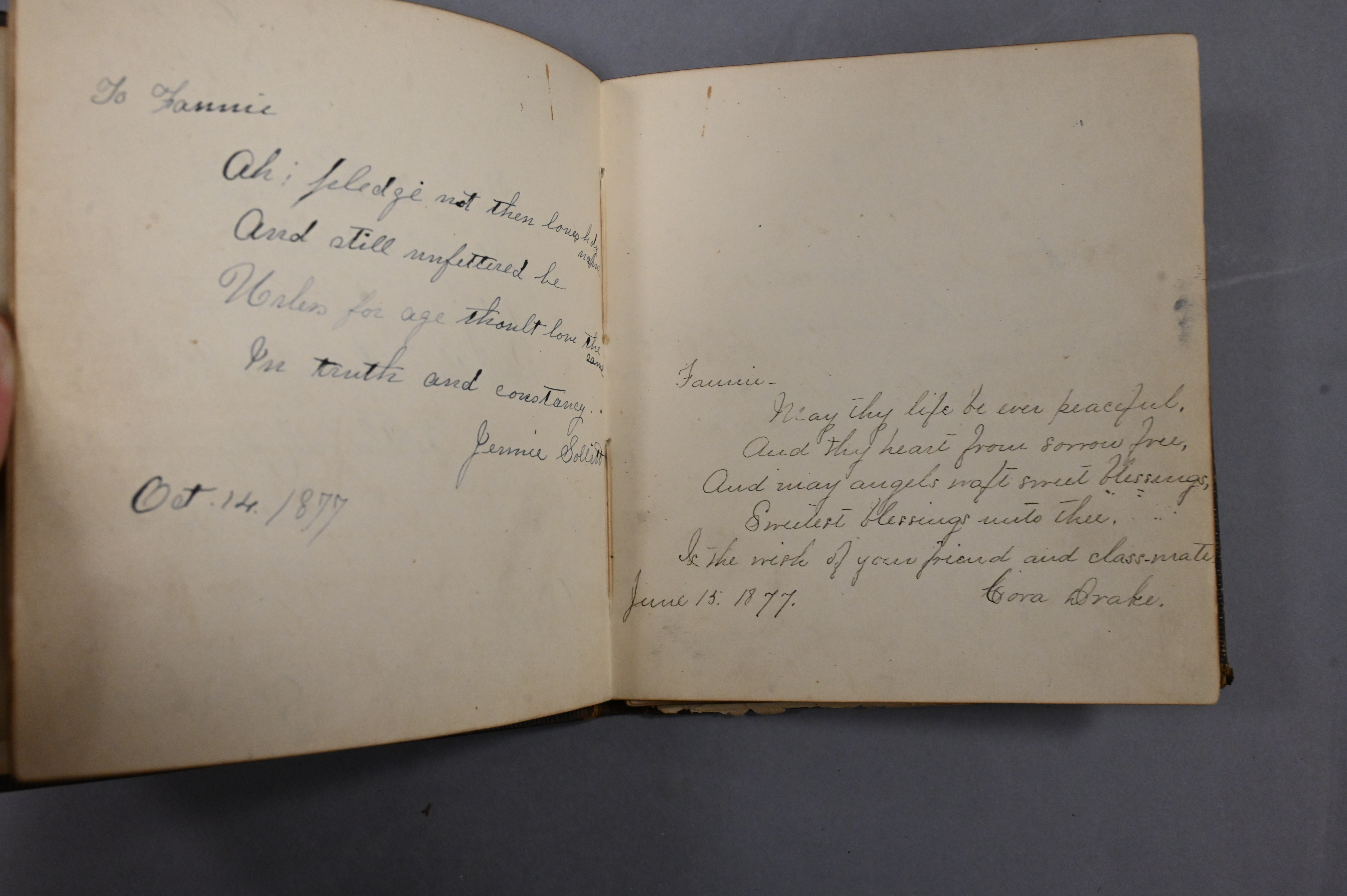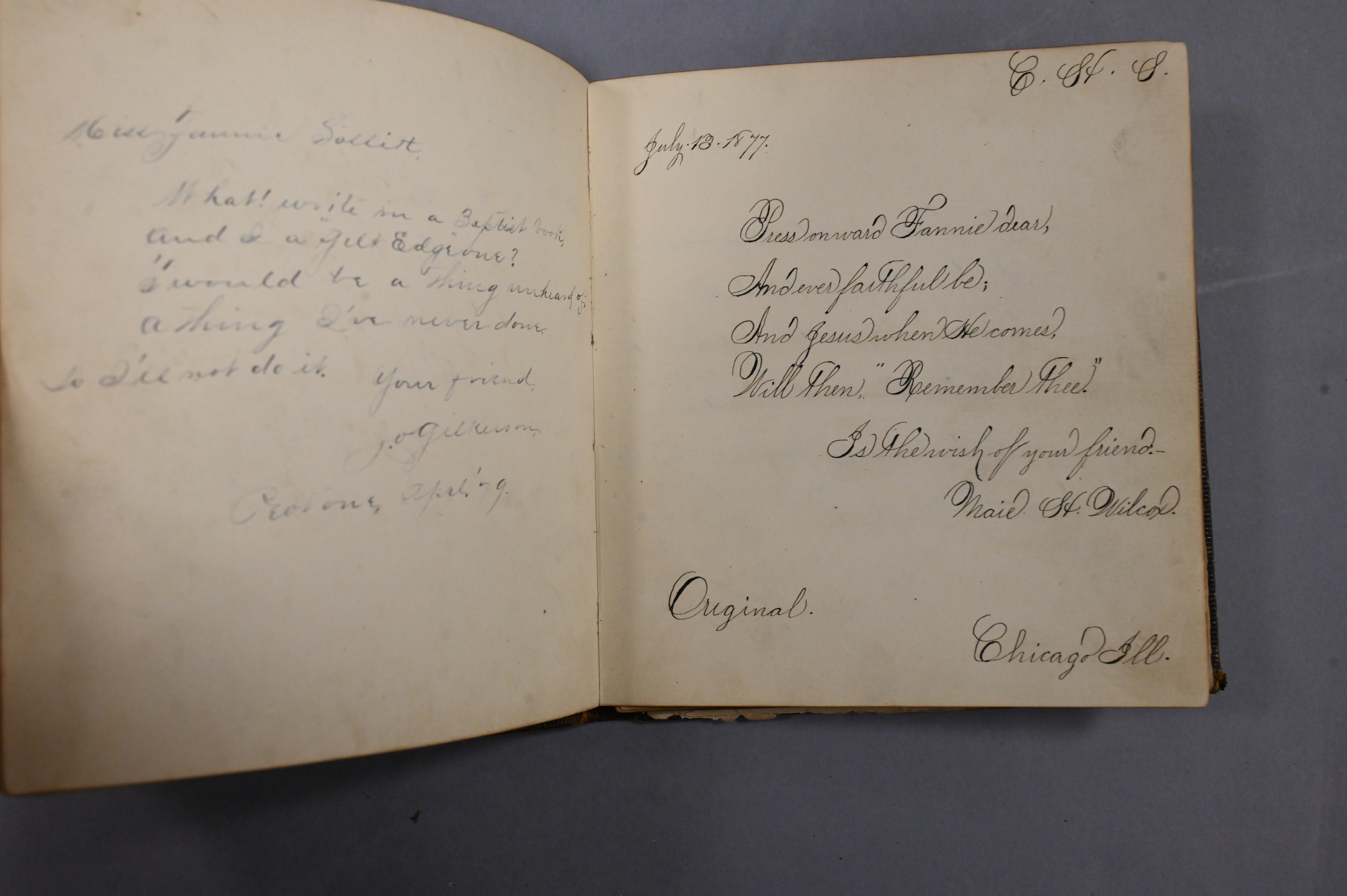 Leatherbound Autograph Album, belonging to Fannie E. Follitt, having many correscpondents, all dated 1877.