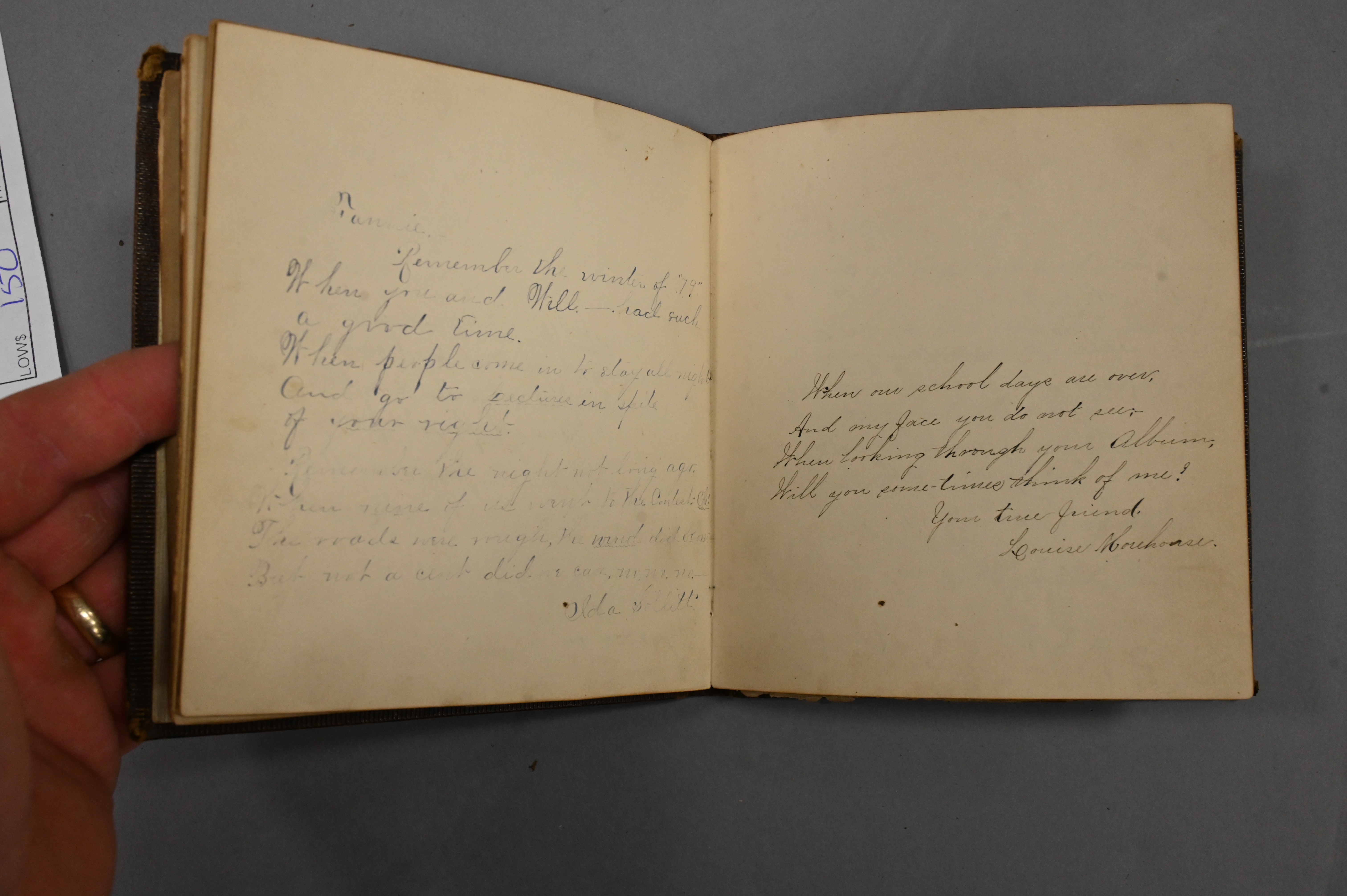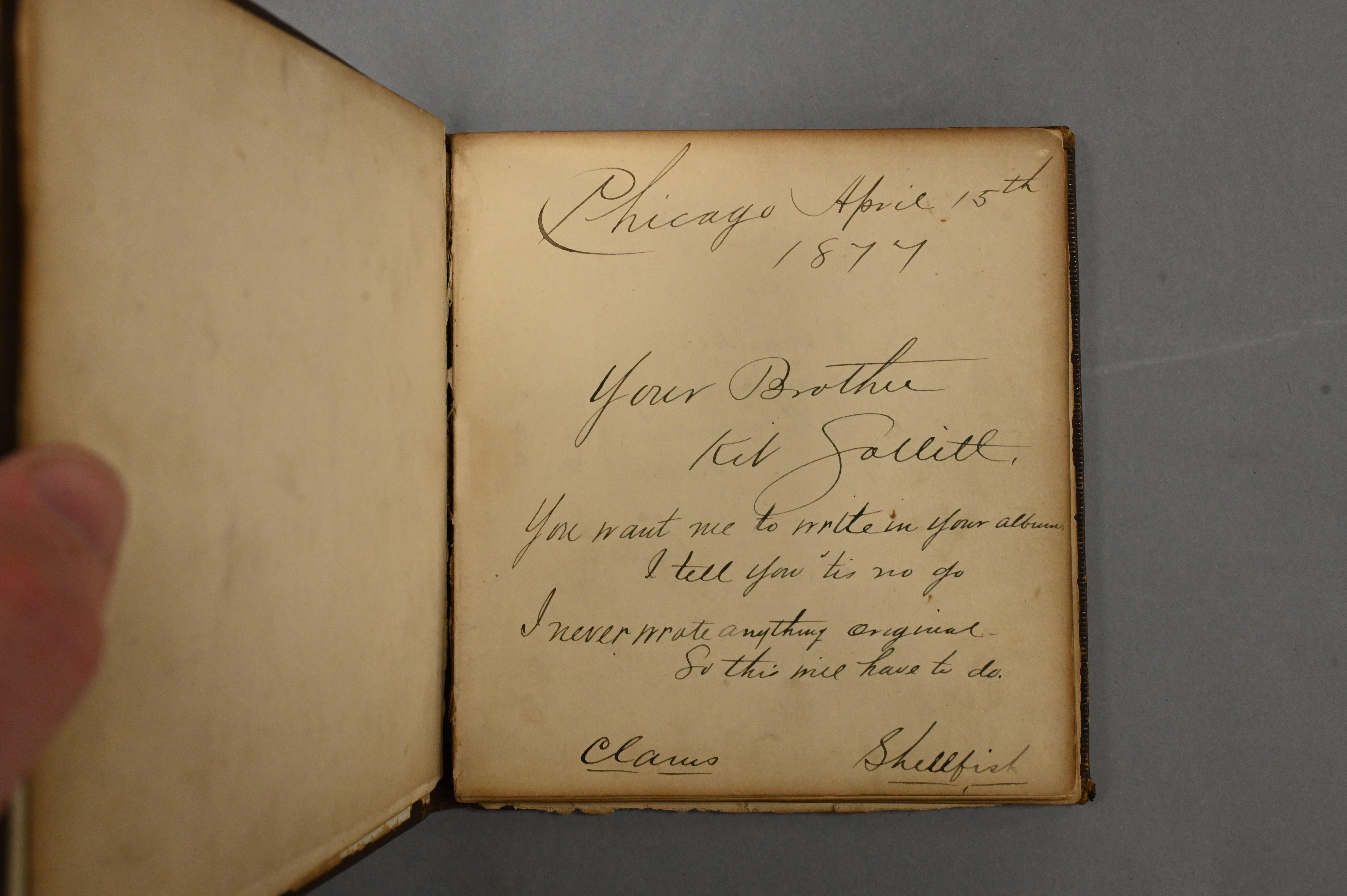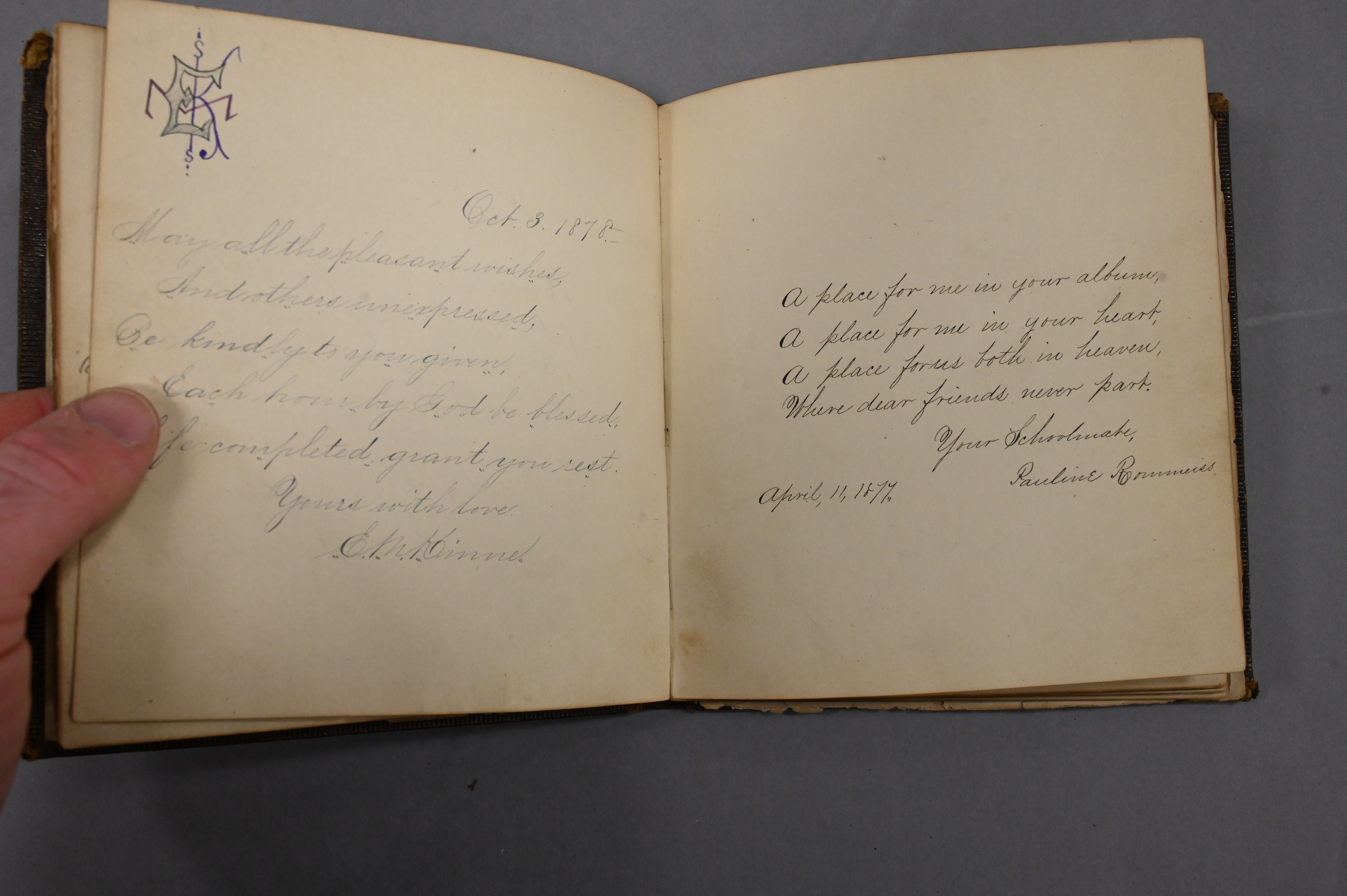 Leatherbound Autograph Album, belonging to Fannie E. Follitt, having many correscpondents, all dated 1877.