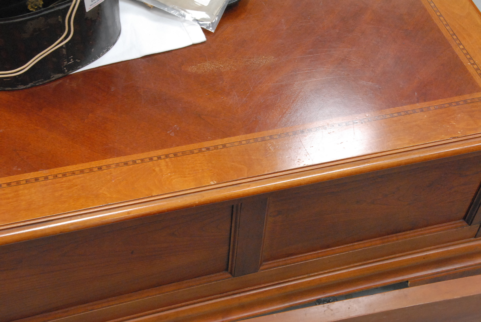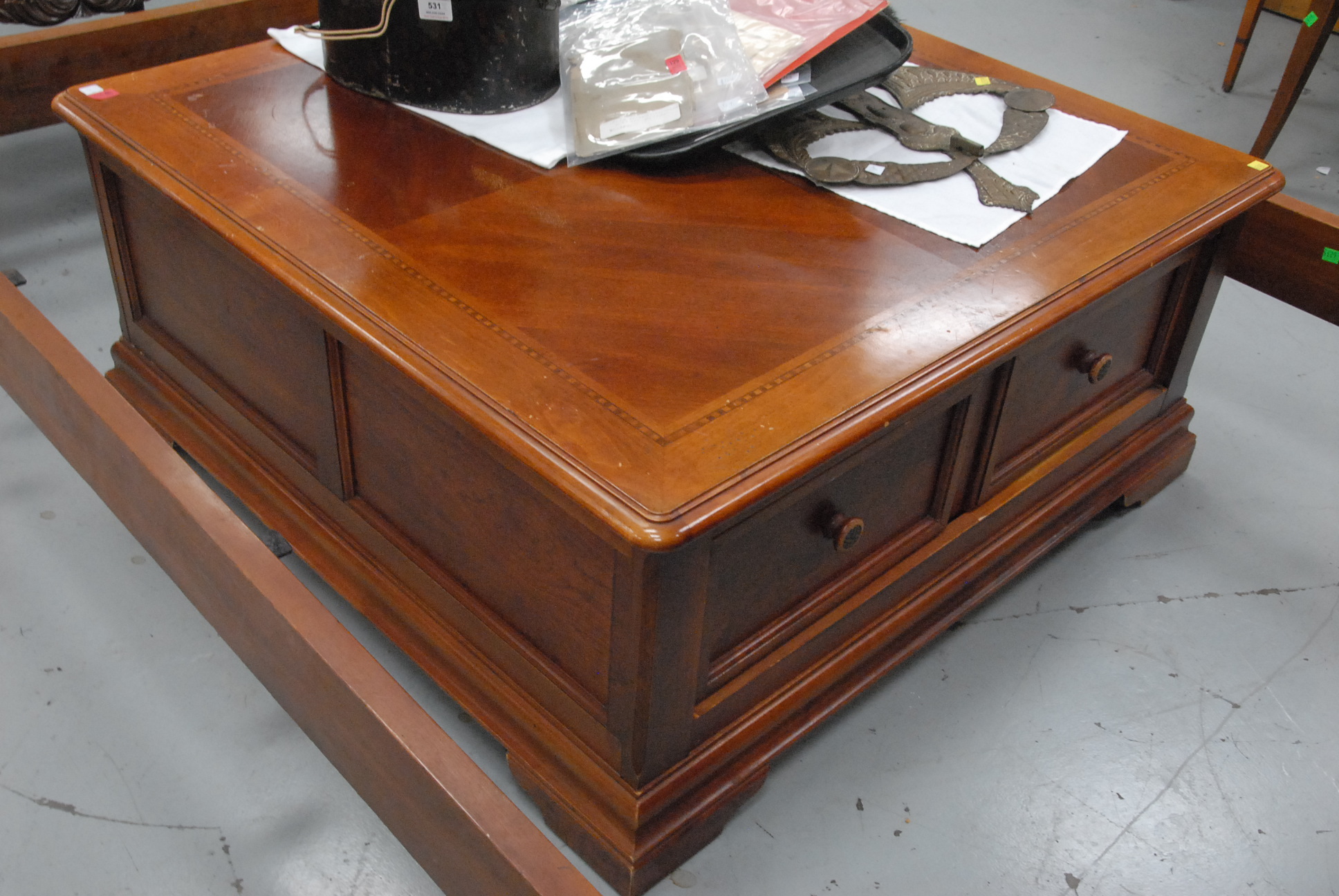 Contemporary inlaid Hammary coffee table with two sided drawer, ht. 18 wd. 40 dp. 40.