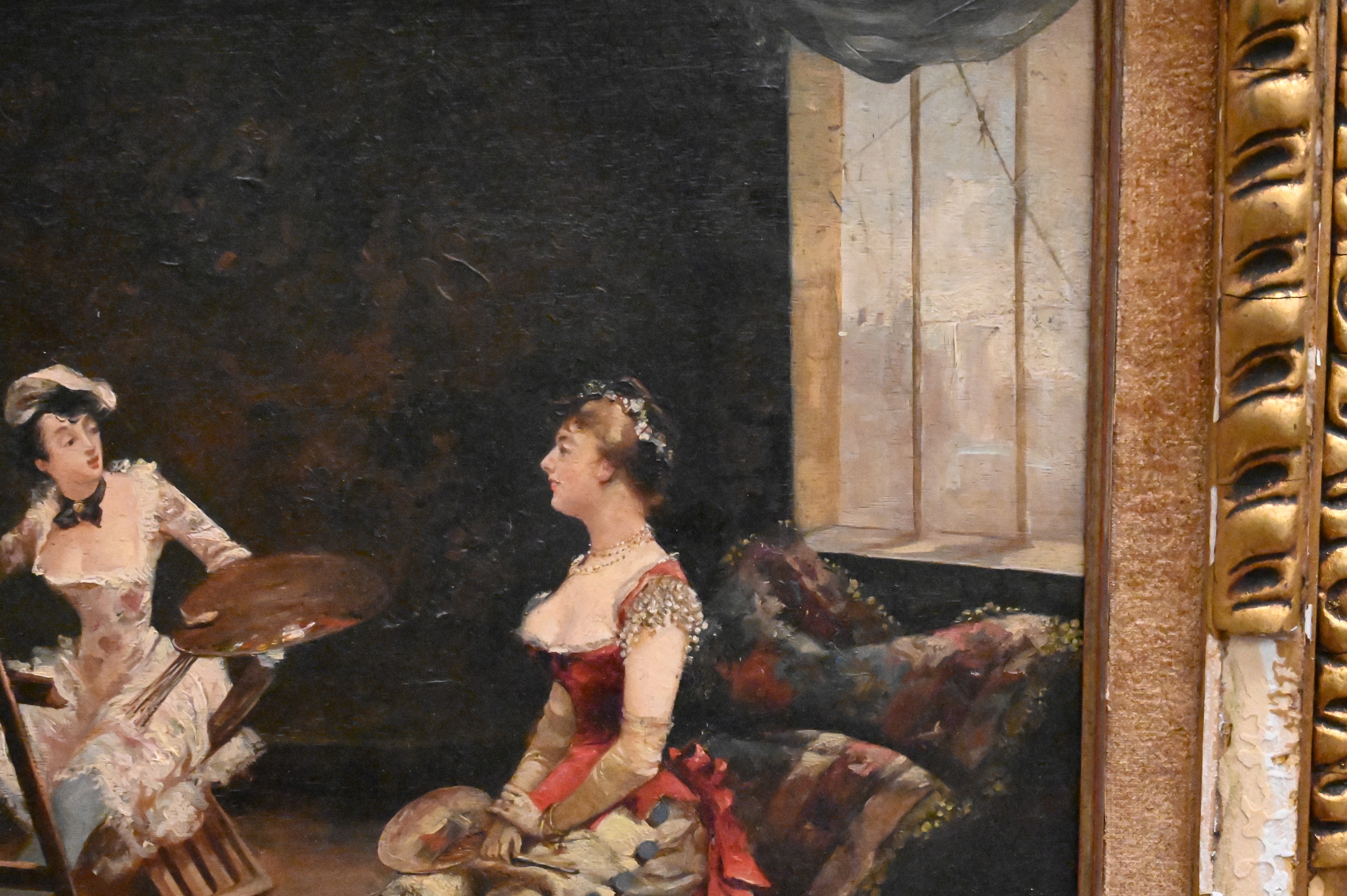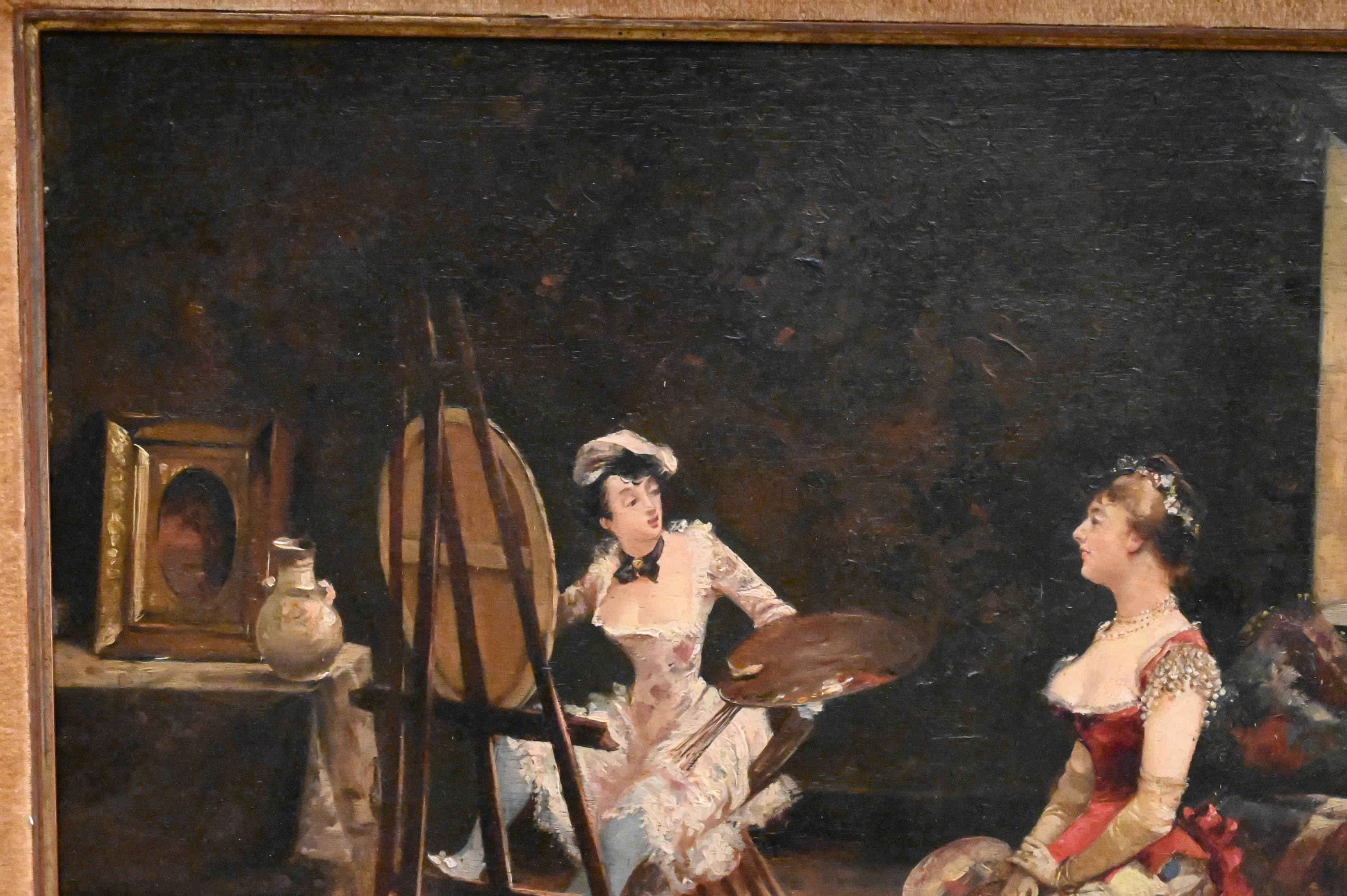 Interior scene with two women, one seated and posing for her portrait being painted by the other woman