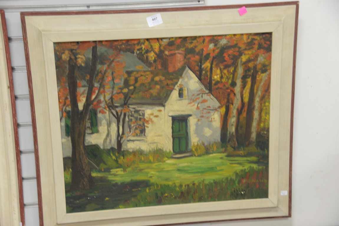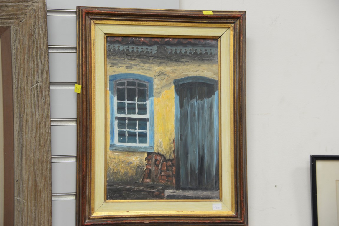 Lot 407: Five framed pieces including Ricard Filgueira oil on masonite of front door, an oil on canvas of a house signed Brand, oil on board …