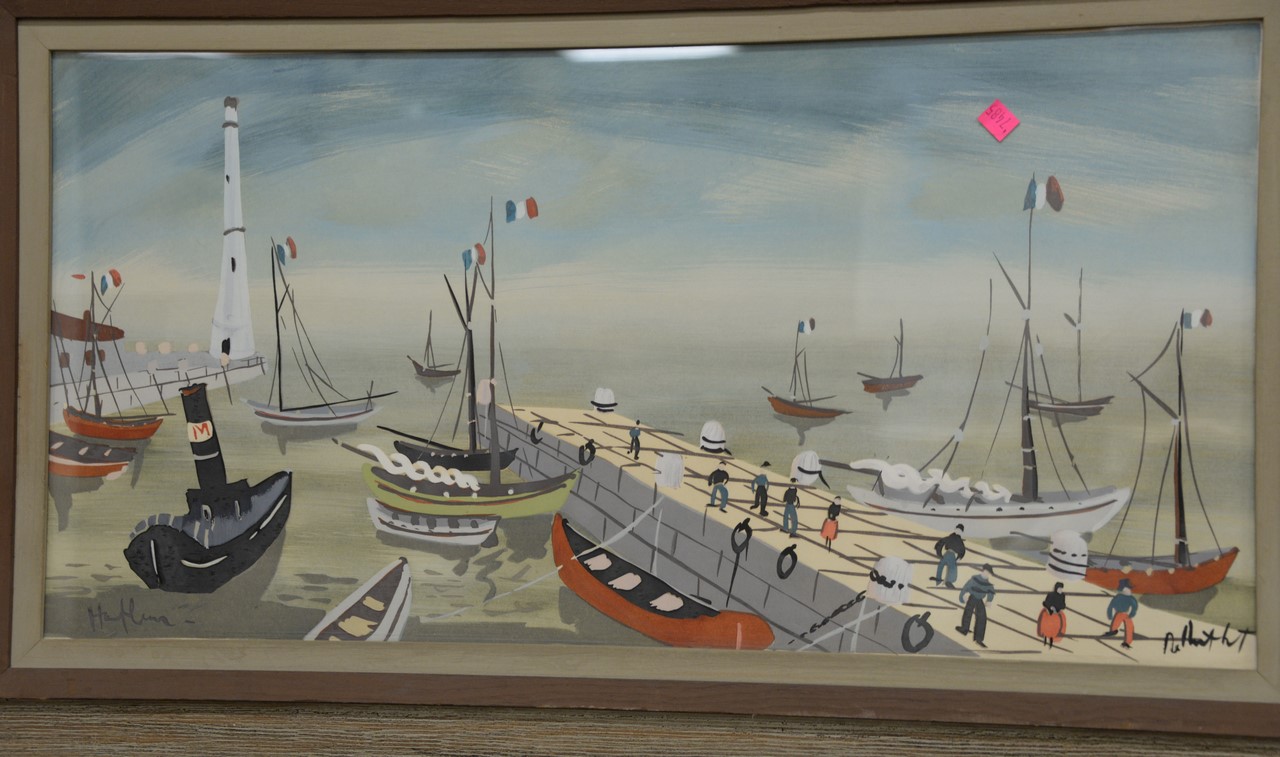 Five framed pieces including Ricard Filgueira oil on masonite of front door, an oil on canvas of a house signed Brand, oil on board with sailboats signed lower right Will Schwab, watercolor of dock with people, and an etching Winter.