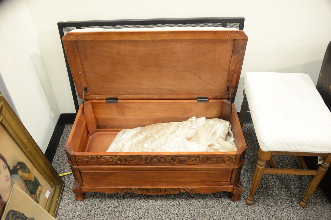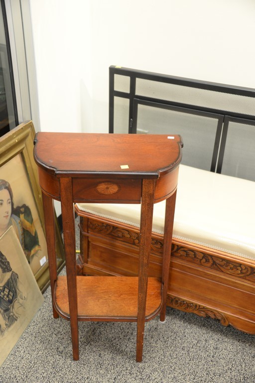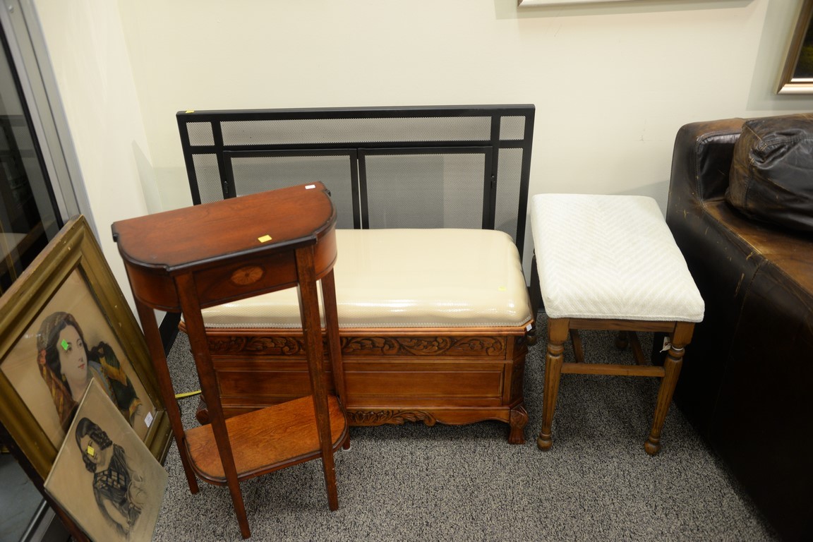 Five piece lot with two benches, fire screen lg. 39in., Ethan Allen table, and small stand.
