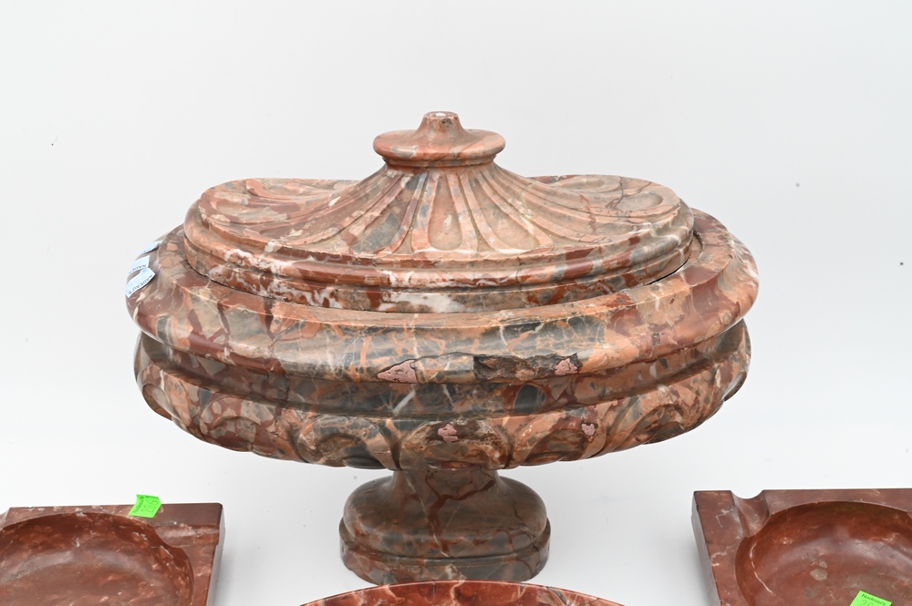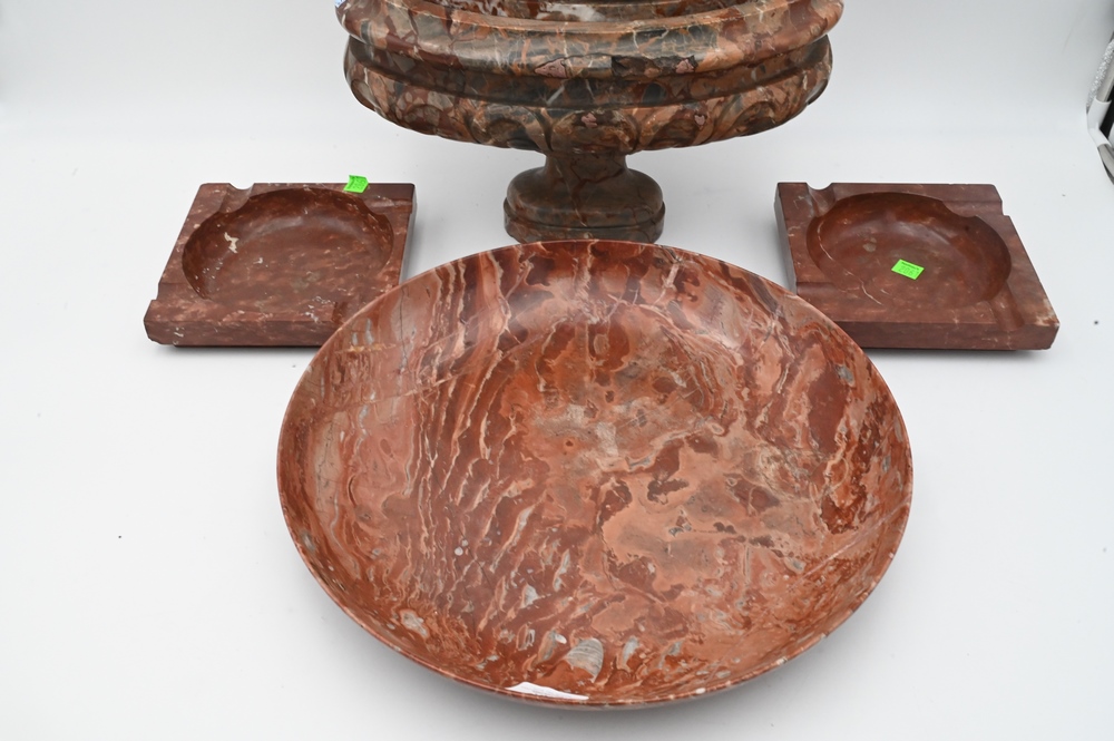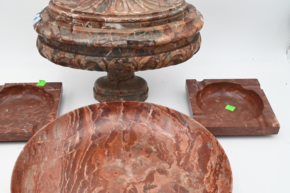 Four Piece Rouge Marble Group, to include a carved urn with cover, height 11 1/2 inches; a large charger, marked Jenkins, diameter 15 inches; along with a pair of square trays, 7″ x 7″.