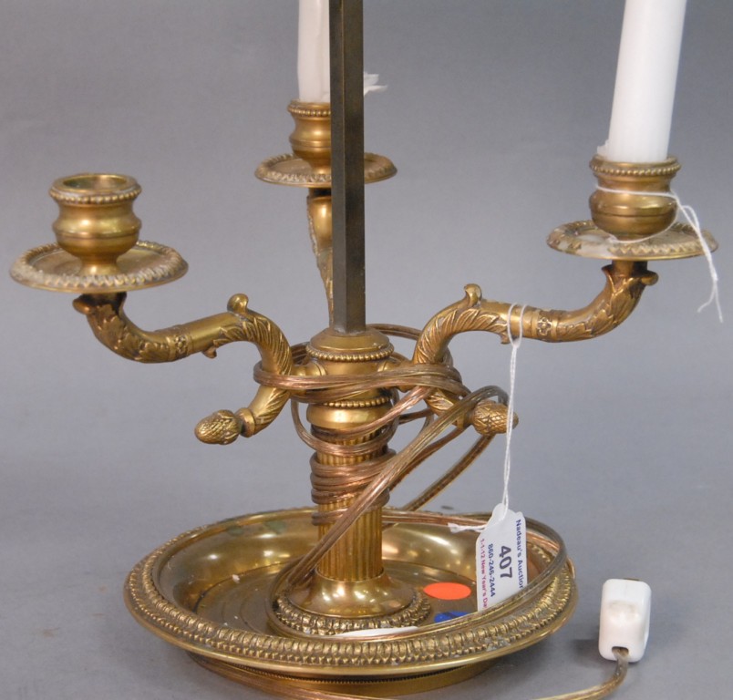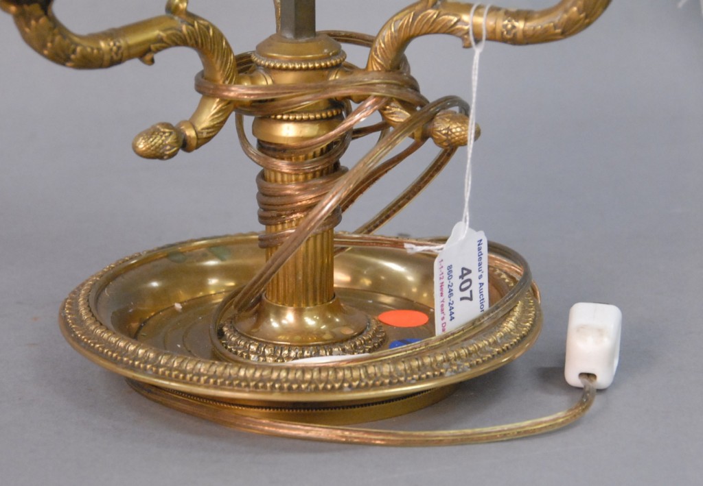 French bronze triple candle holder, electrified with adjustable metal shade, 19th century.