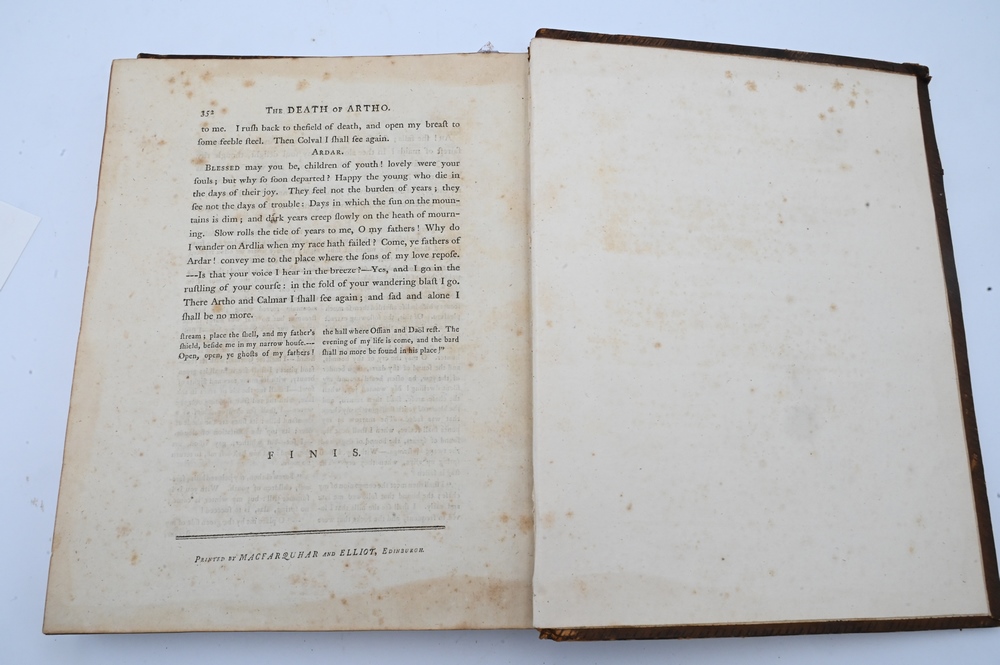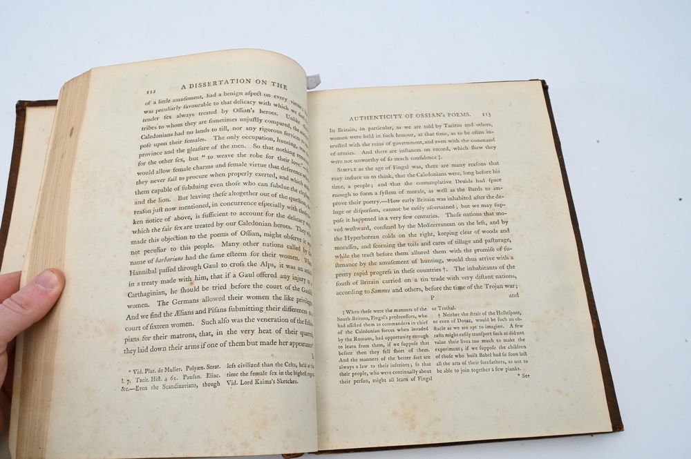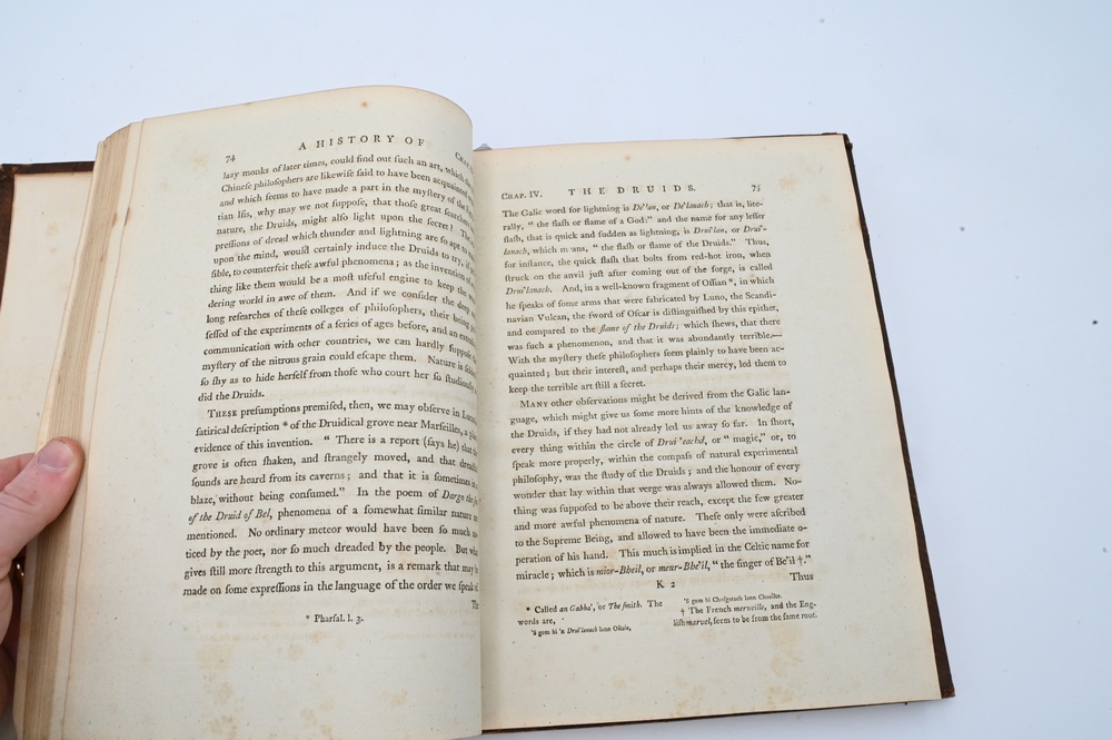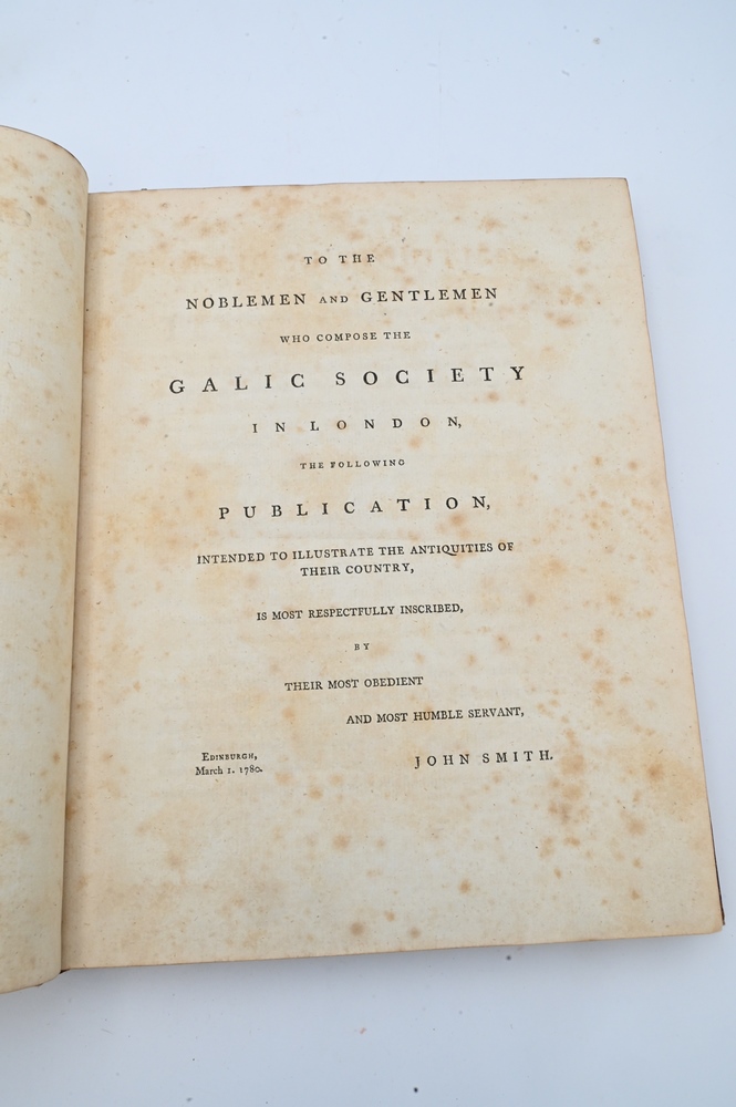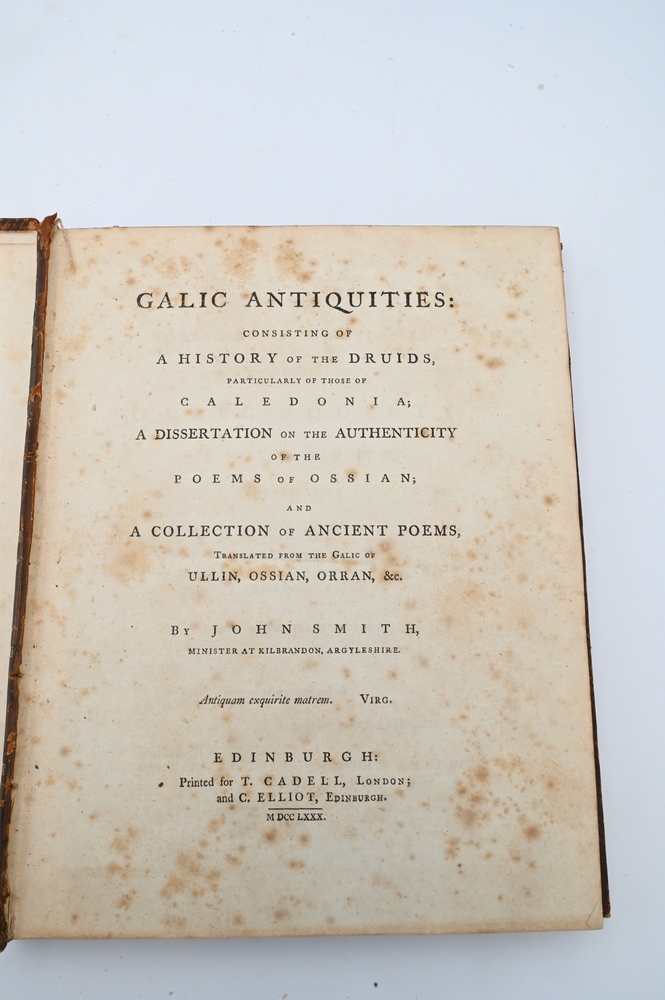 Galic Antiquities, consisting of A History of Druids, particularly of those of Caledonia; A Dissertation on the Authenticity of Poems of Ossian; along with a collection of ancient poems by John SMith, MDCCLXXX, London, binding as is, front is loose/off; book plate of Thomas Philip Earl De Grey, Wiest Park.