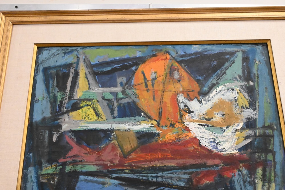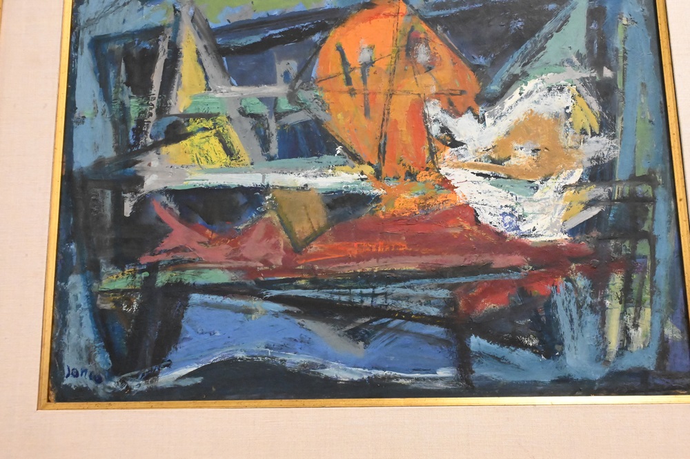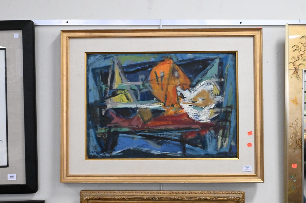 Lot 407: Marcel Janco (1895 – 1984), untitled abstract, oil on board, signed Janco lower left, 19″ x 27″.
