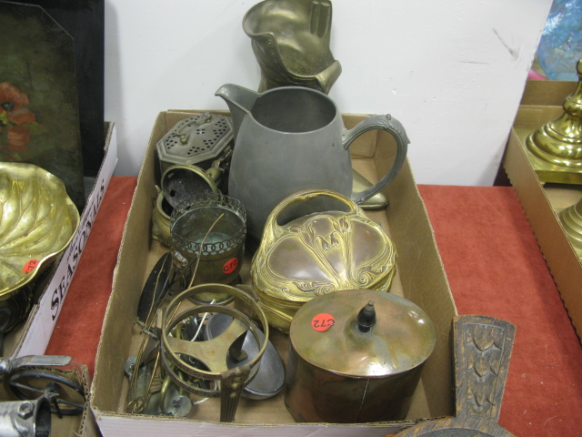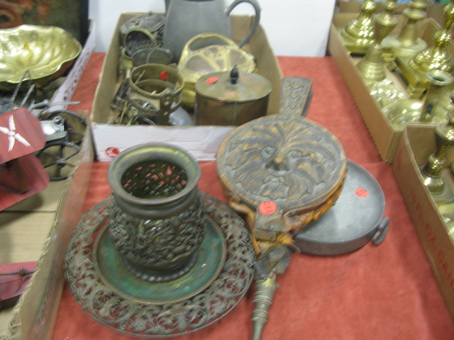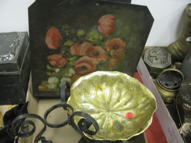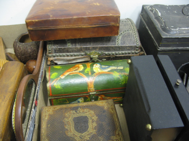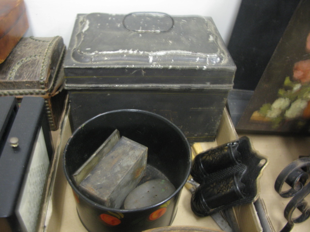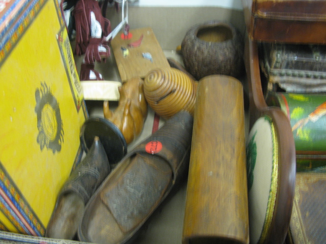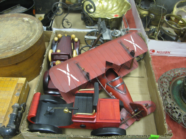 Nine box lots of miscellaneous including primitive pantry box, wooden ware, wooden shoes, wooden carvings, small lift top boxes, tole box, metal items, bellows, airplane and car models, bronze reticulated vase, misc.