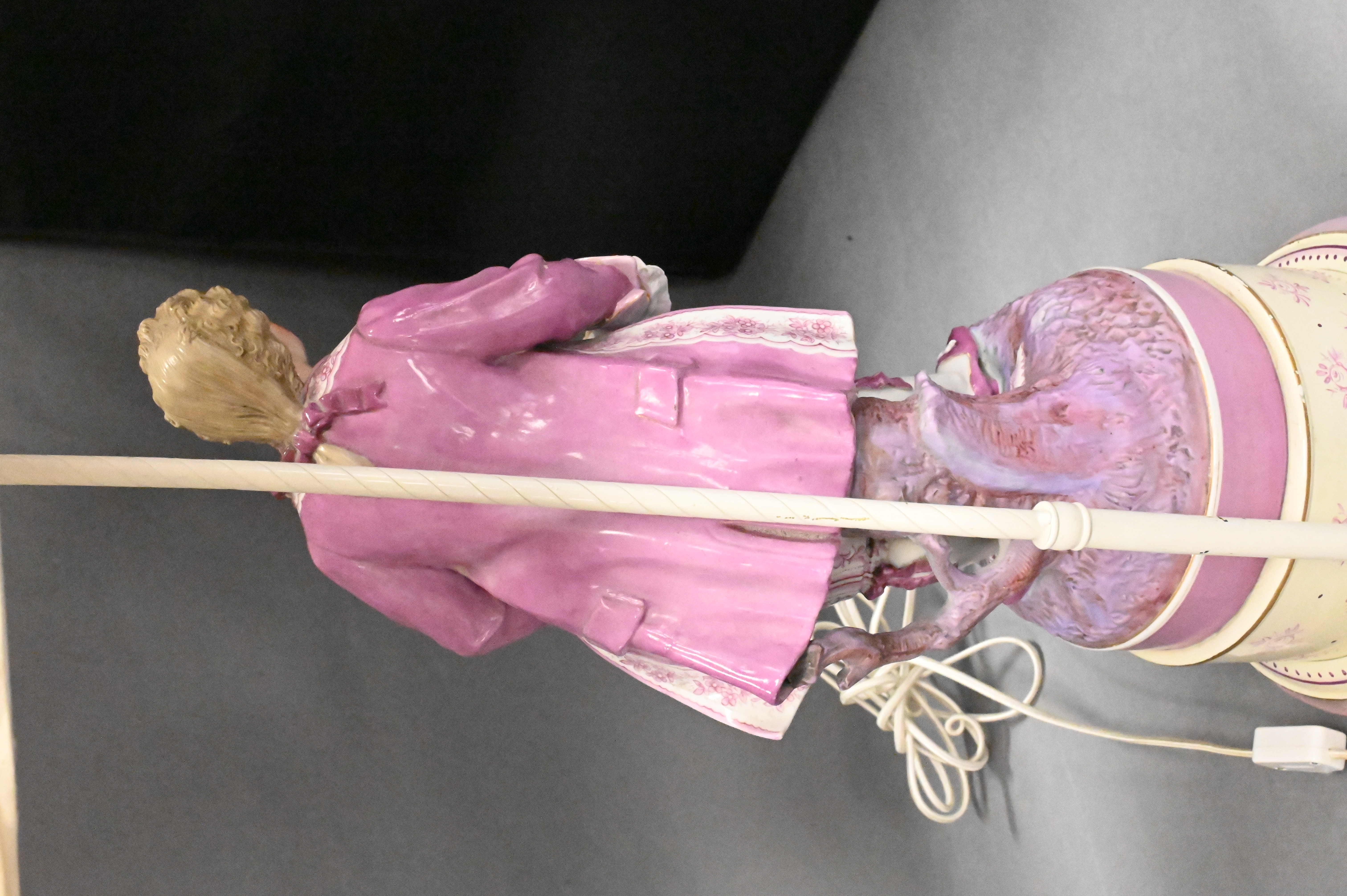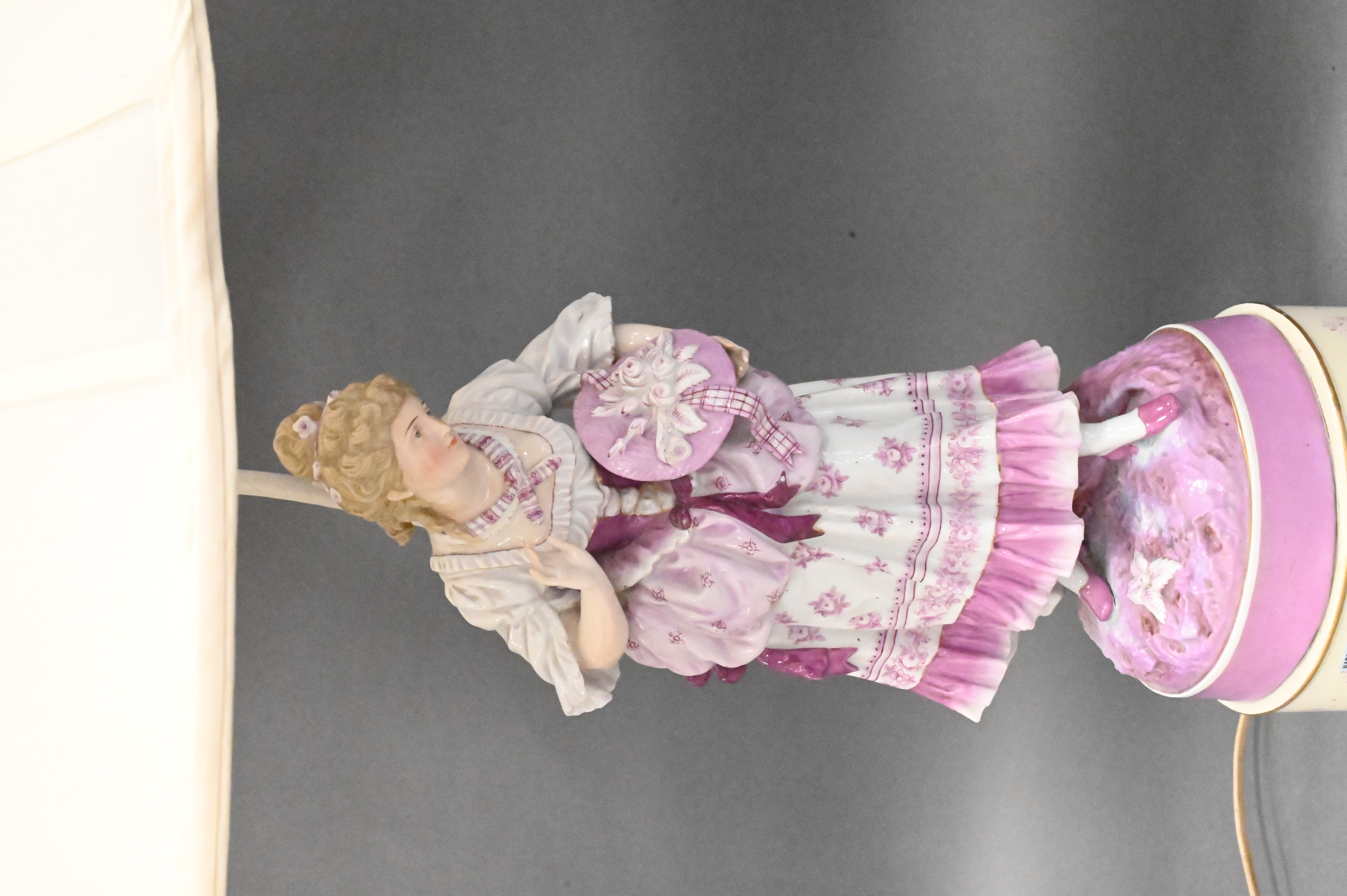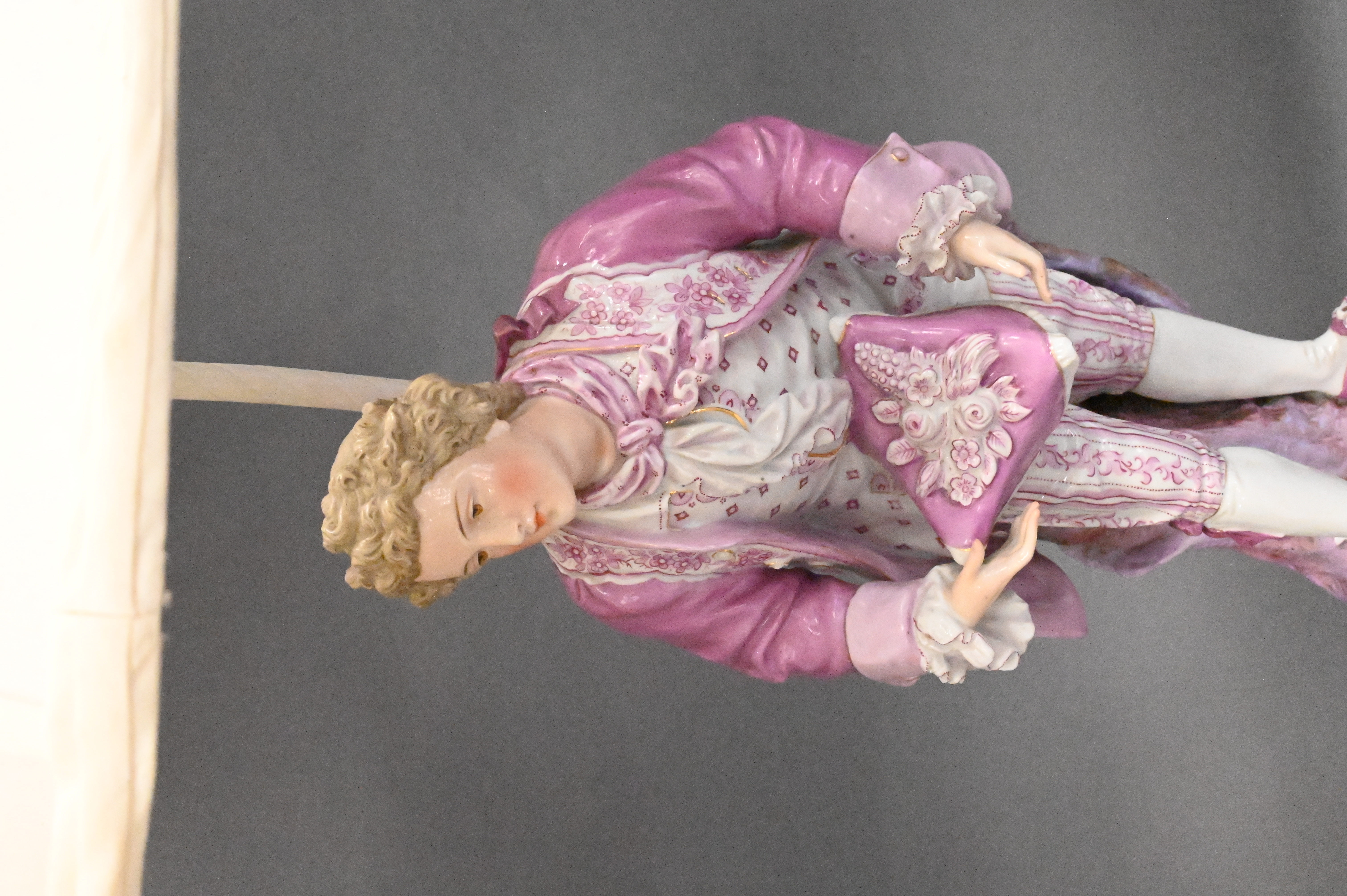 one of an 18th century gentleman the other of a lady in petticoats, in a white and pink glaze