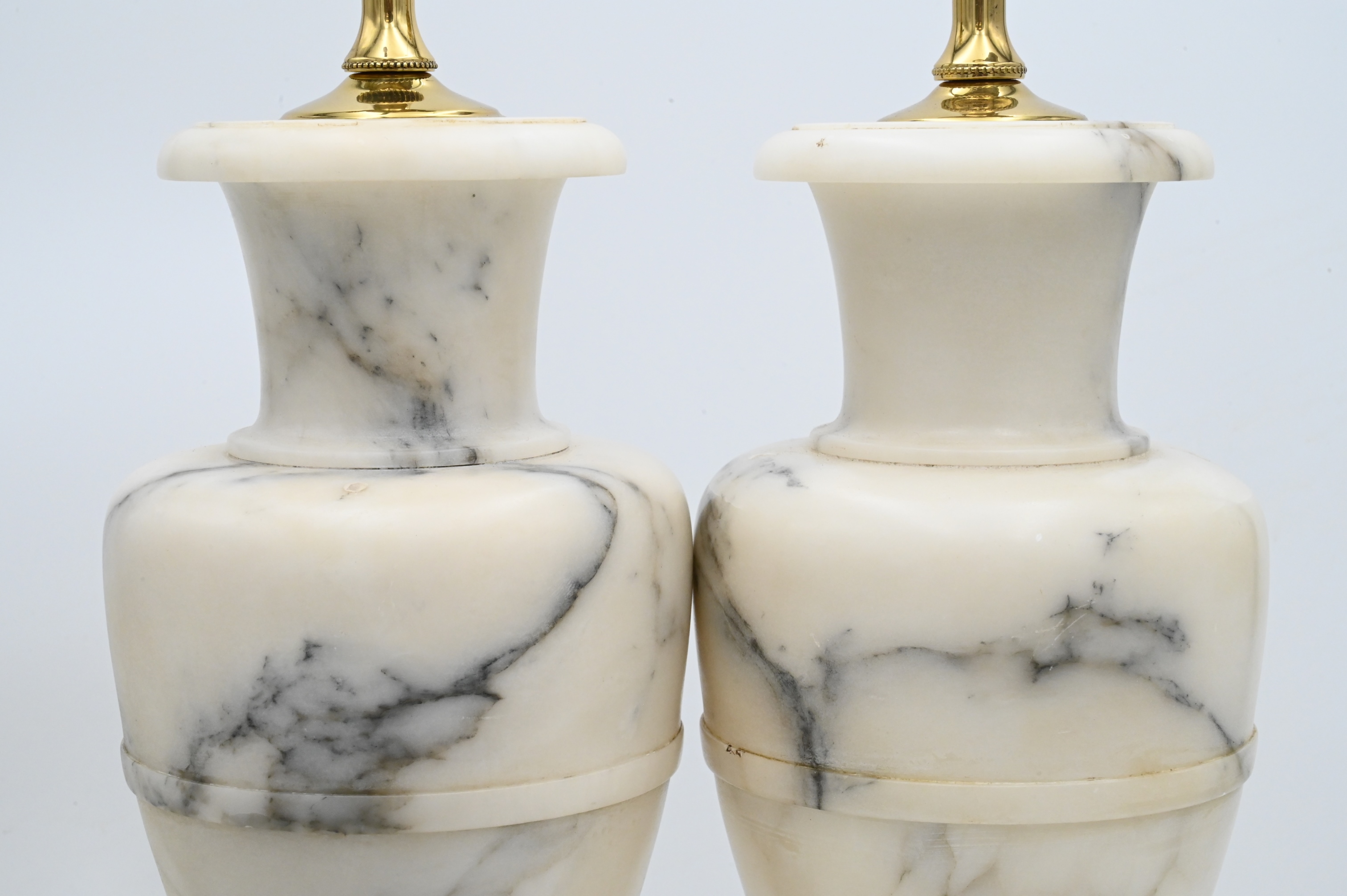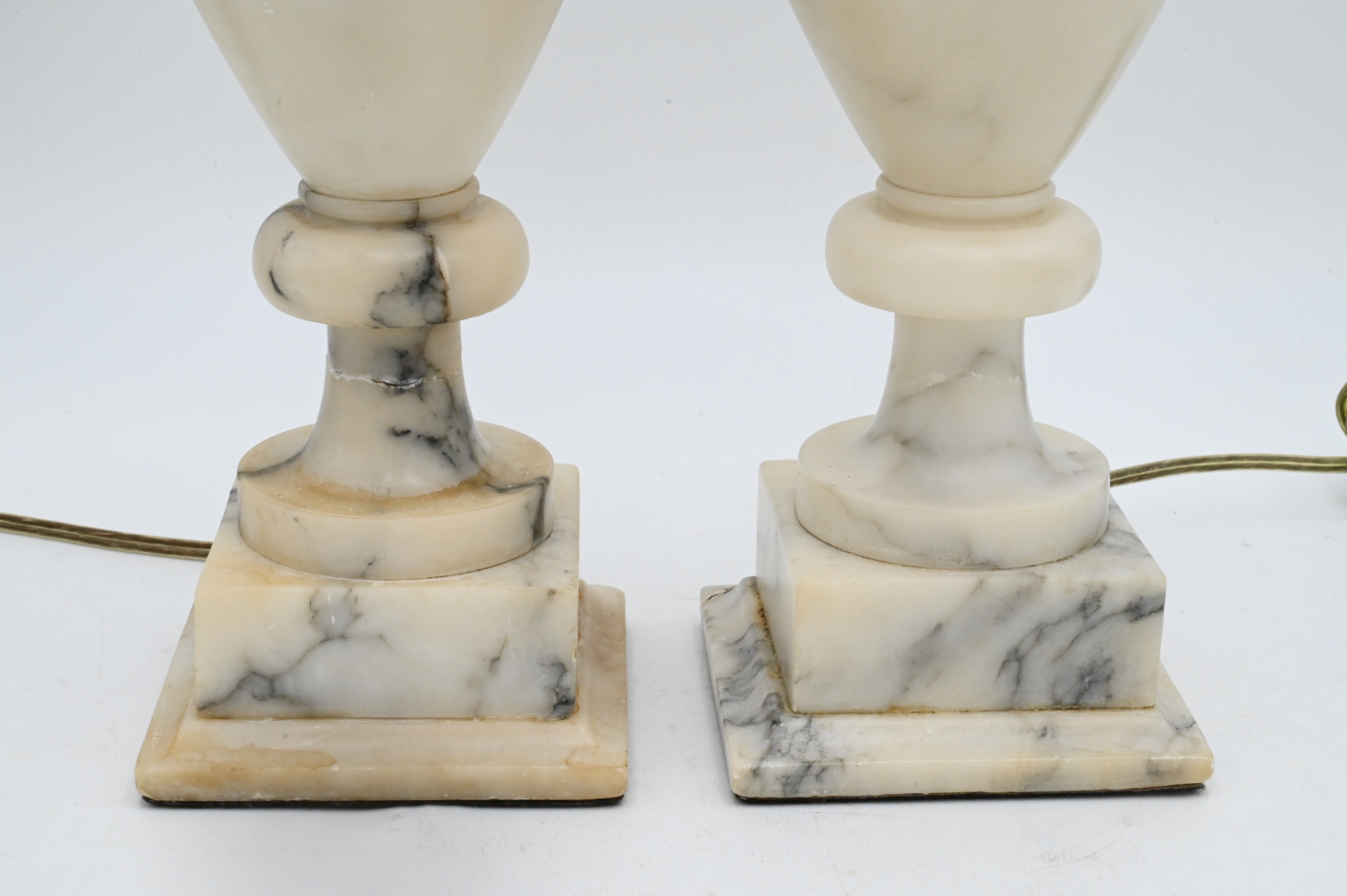 Pair of White Marble Urn Form Lamps on Stepped Bases