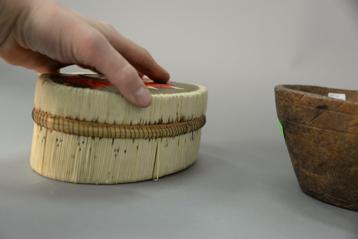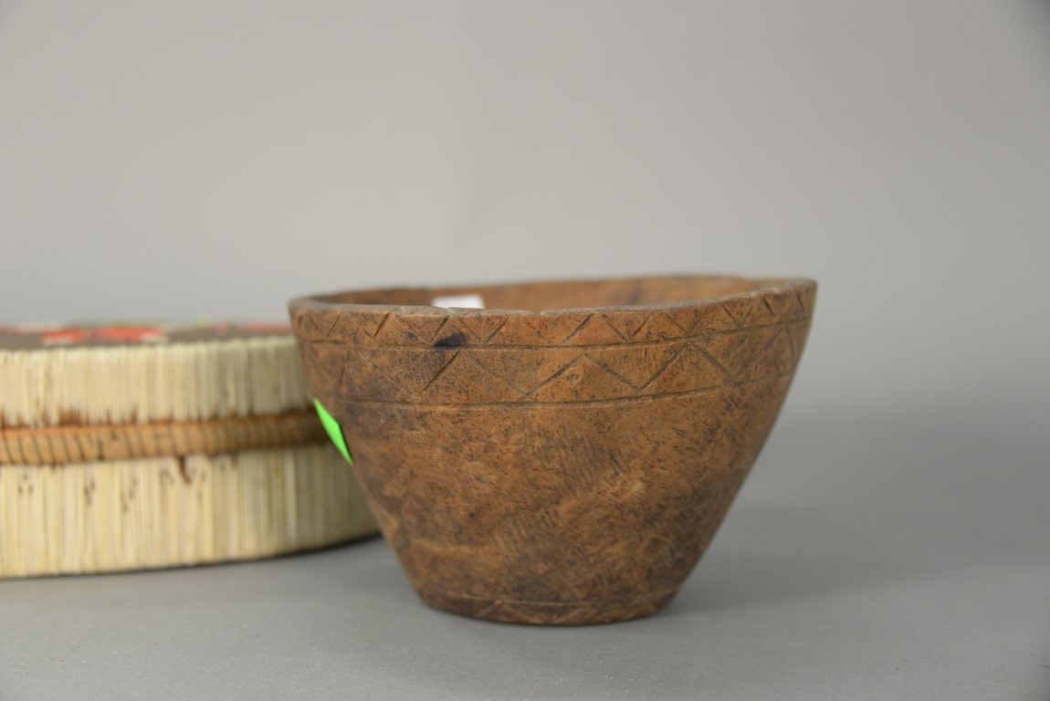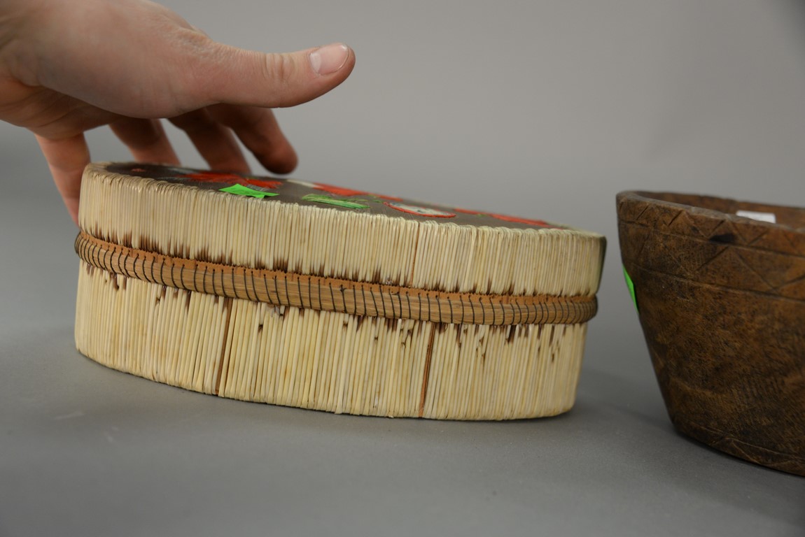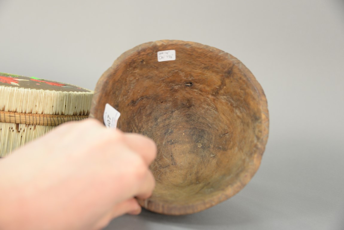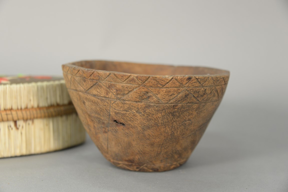 Lot 407: Two piece lot Woodlands Indian Burl bowl and bark quill decorated oval covered box. bowl: ht. 4 in. dia. 7 1/2 in., box: 5 1/2 x 9 1/2