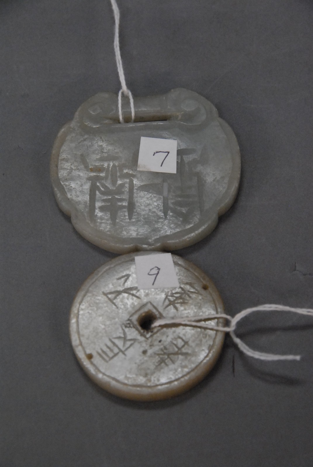 Two tomb pieces around 600 A.D, a jade baby lock and a round jade pendant.