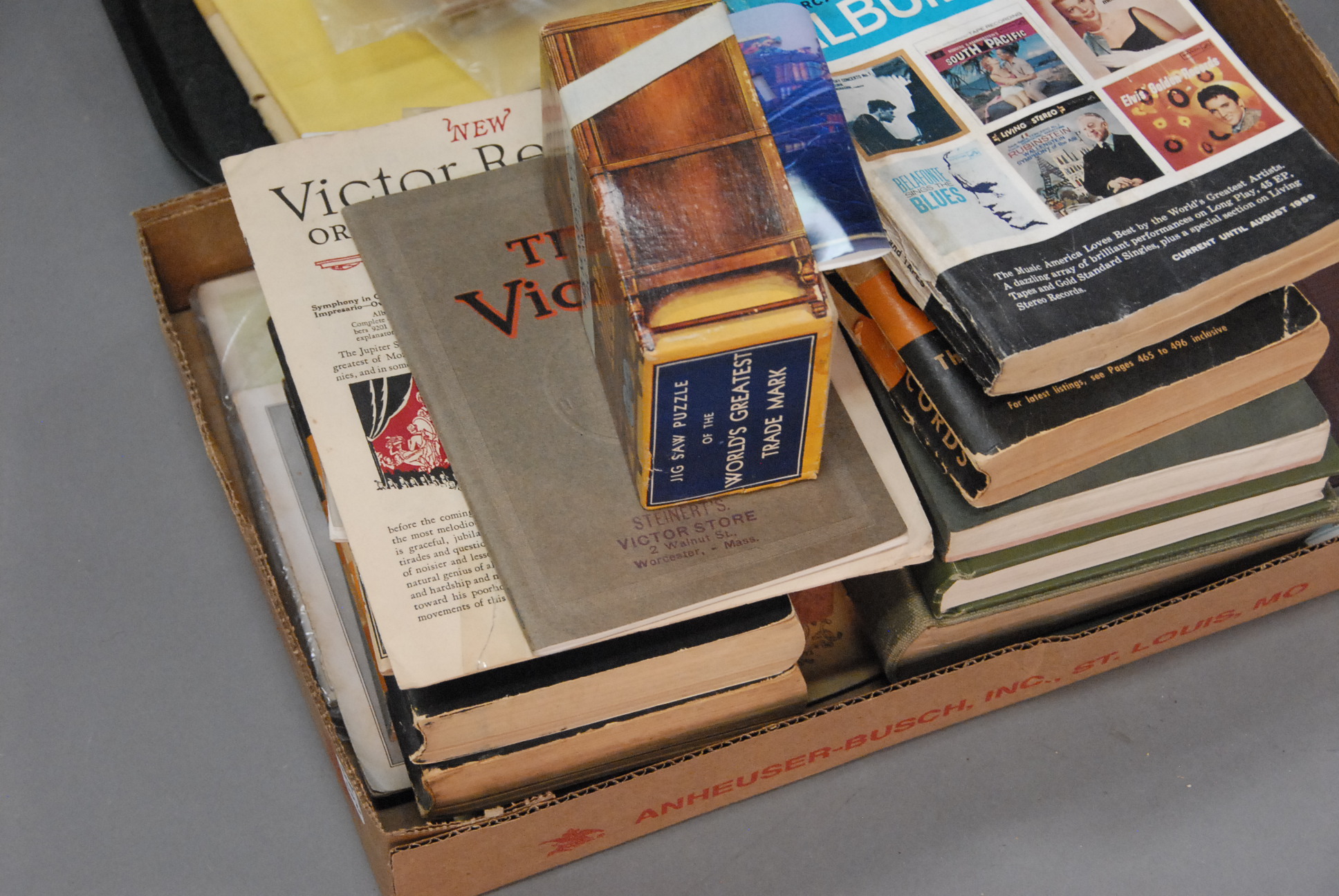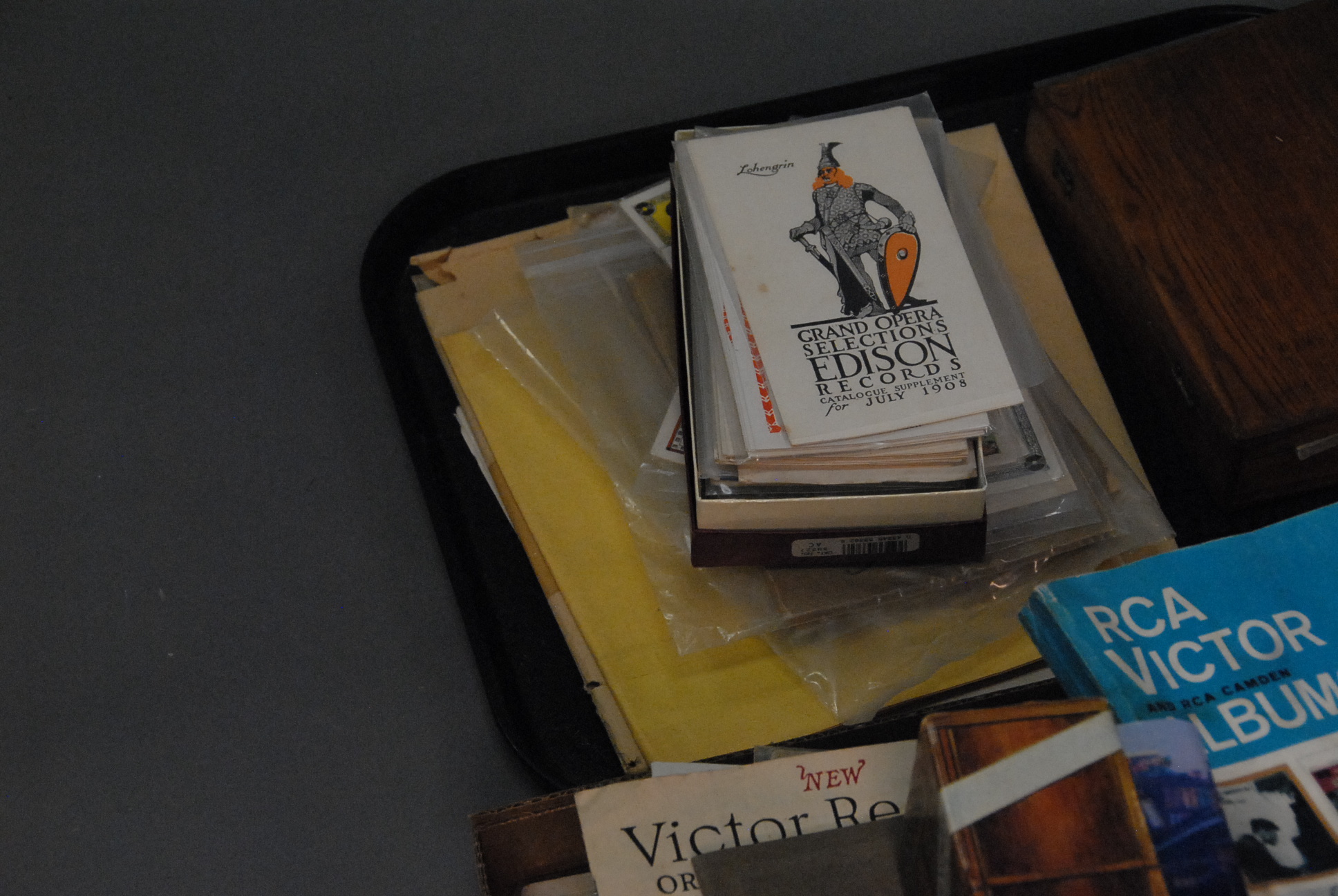 Two tray lot of Edison record catalogs and supplements, Victor catalogs, Victor puzzle, and record catalogs.