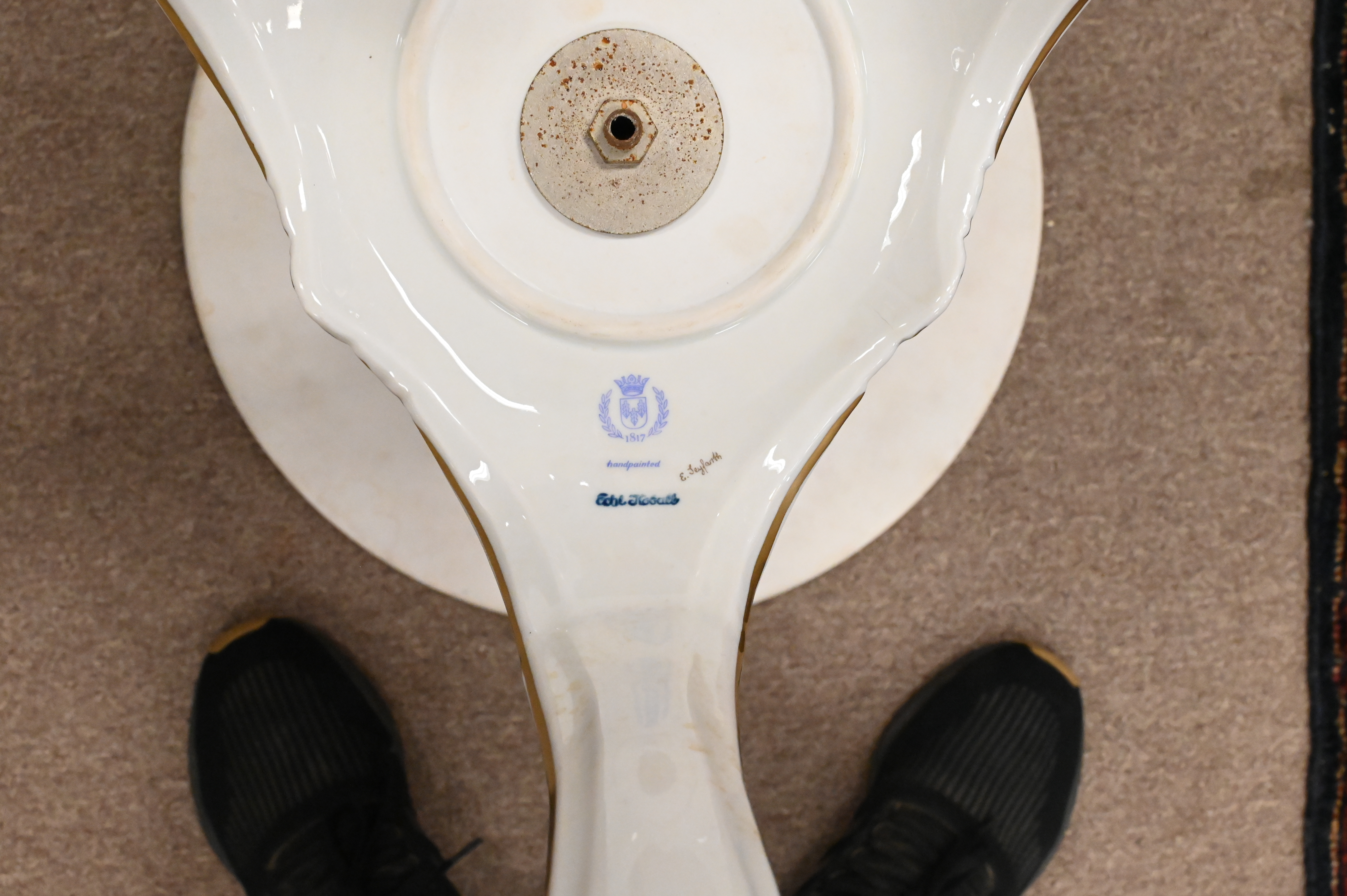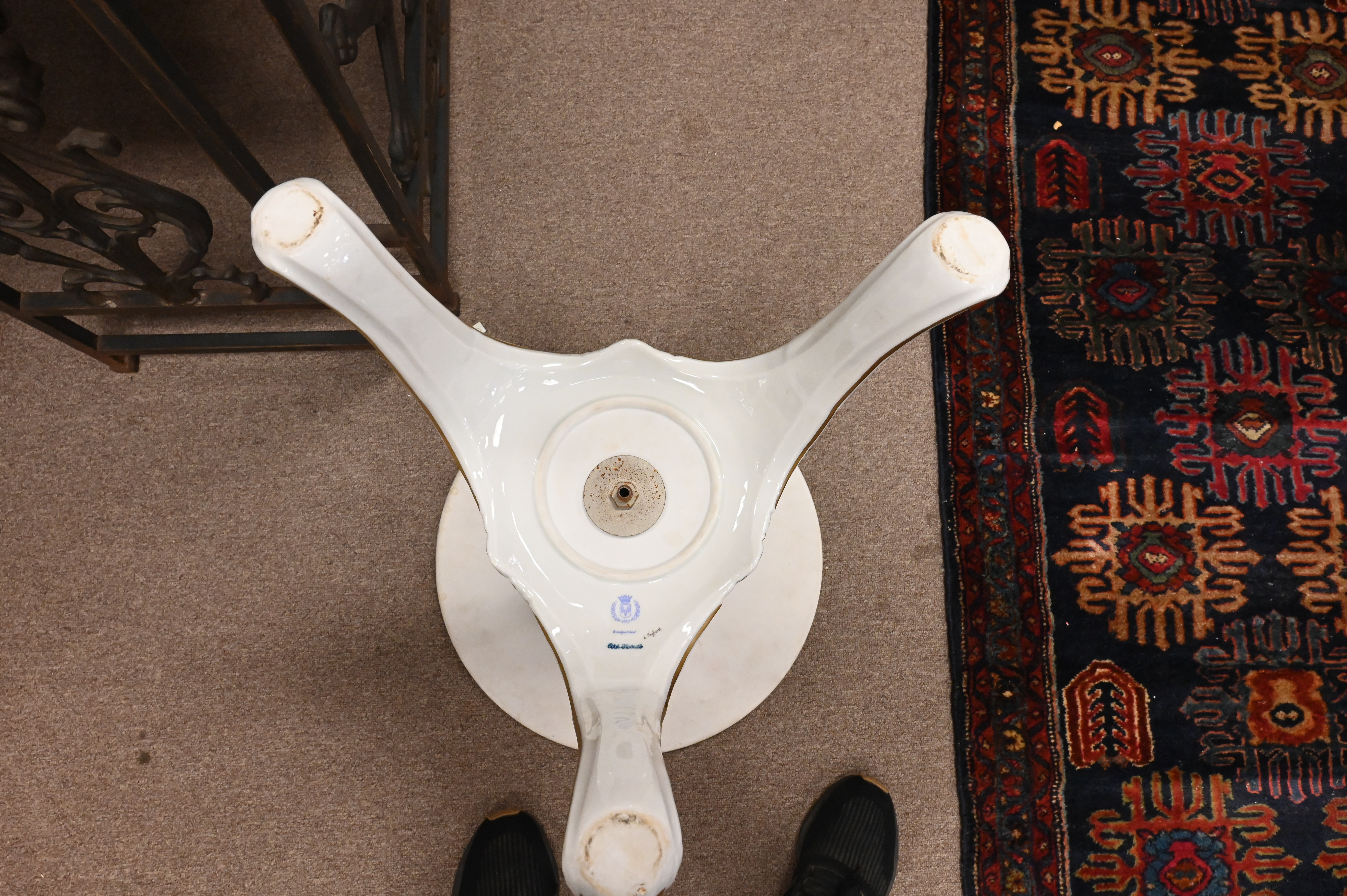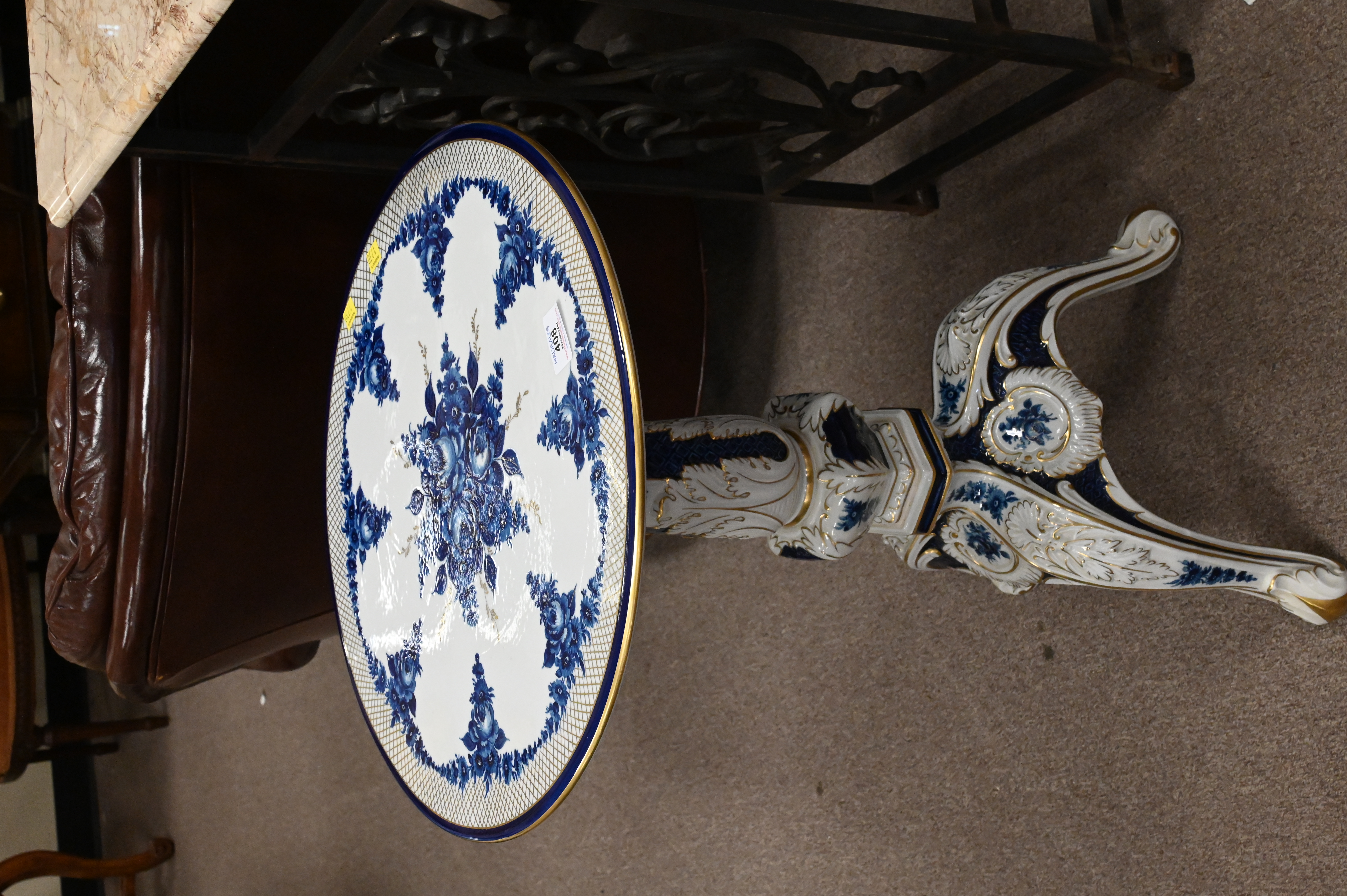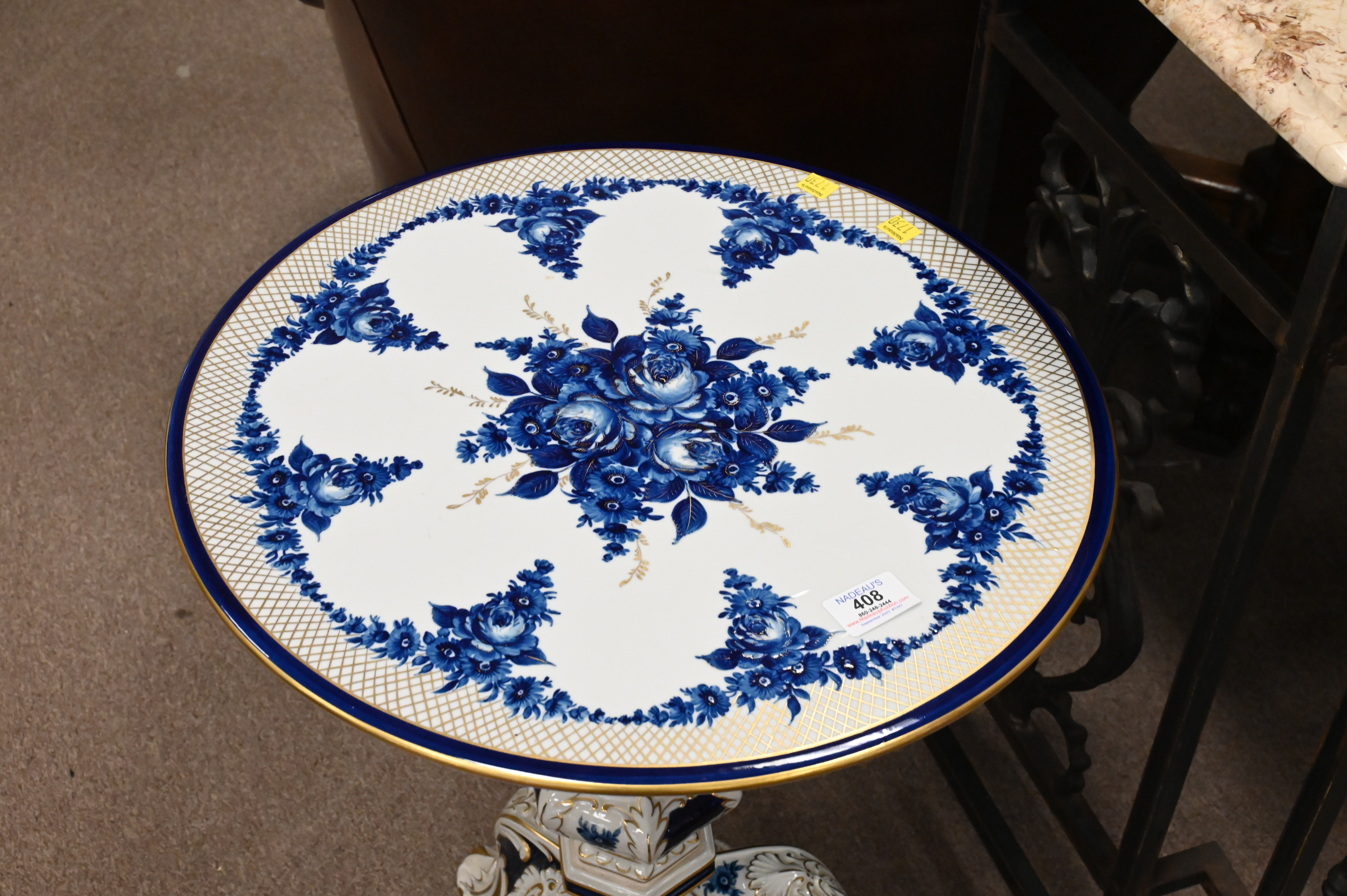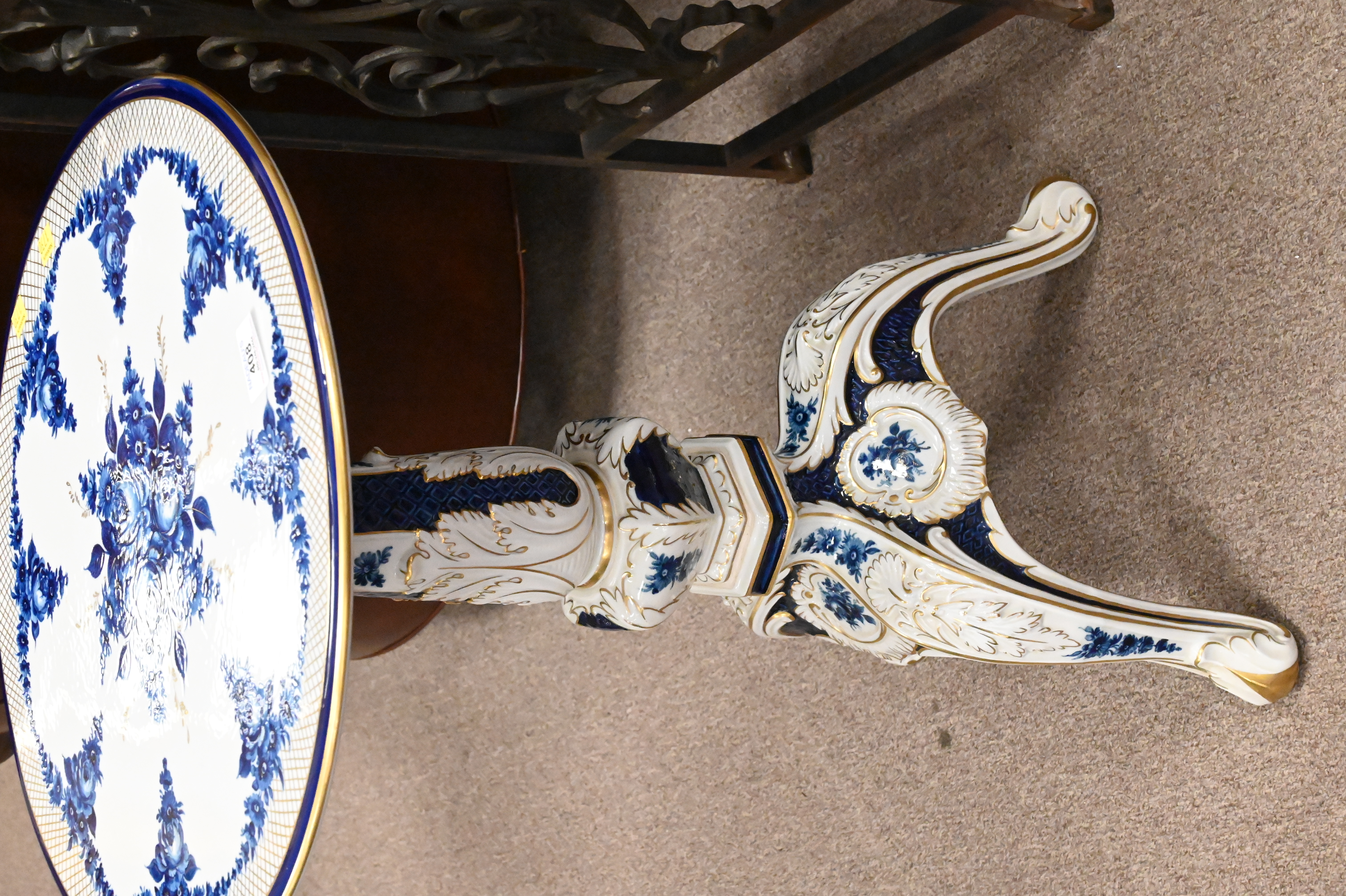 Blue Floral Capodimonte Style Porcelain Pedestal, having gilt accents, height 27 inches, diameter 18 inches.
