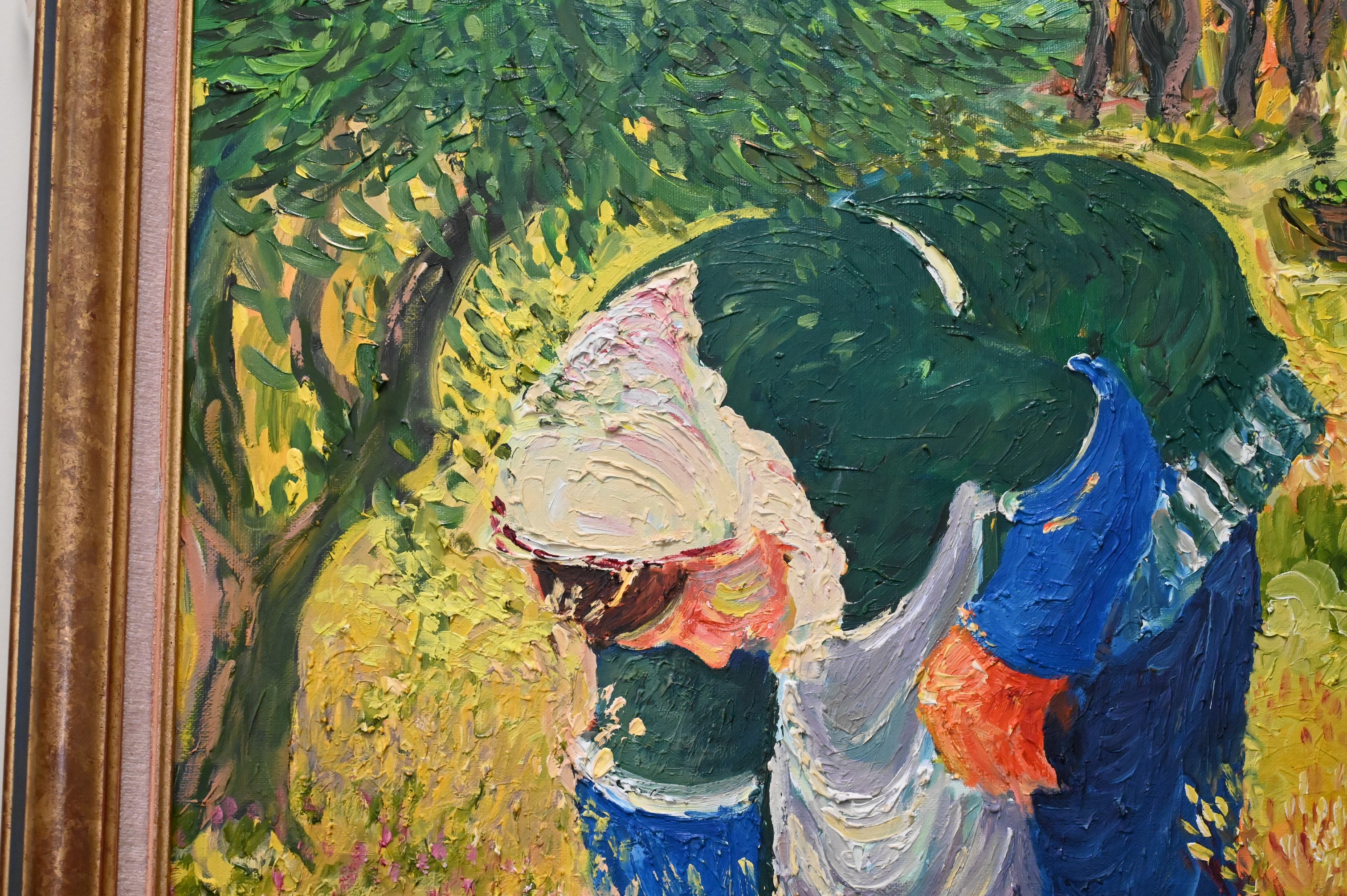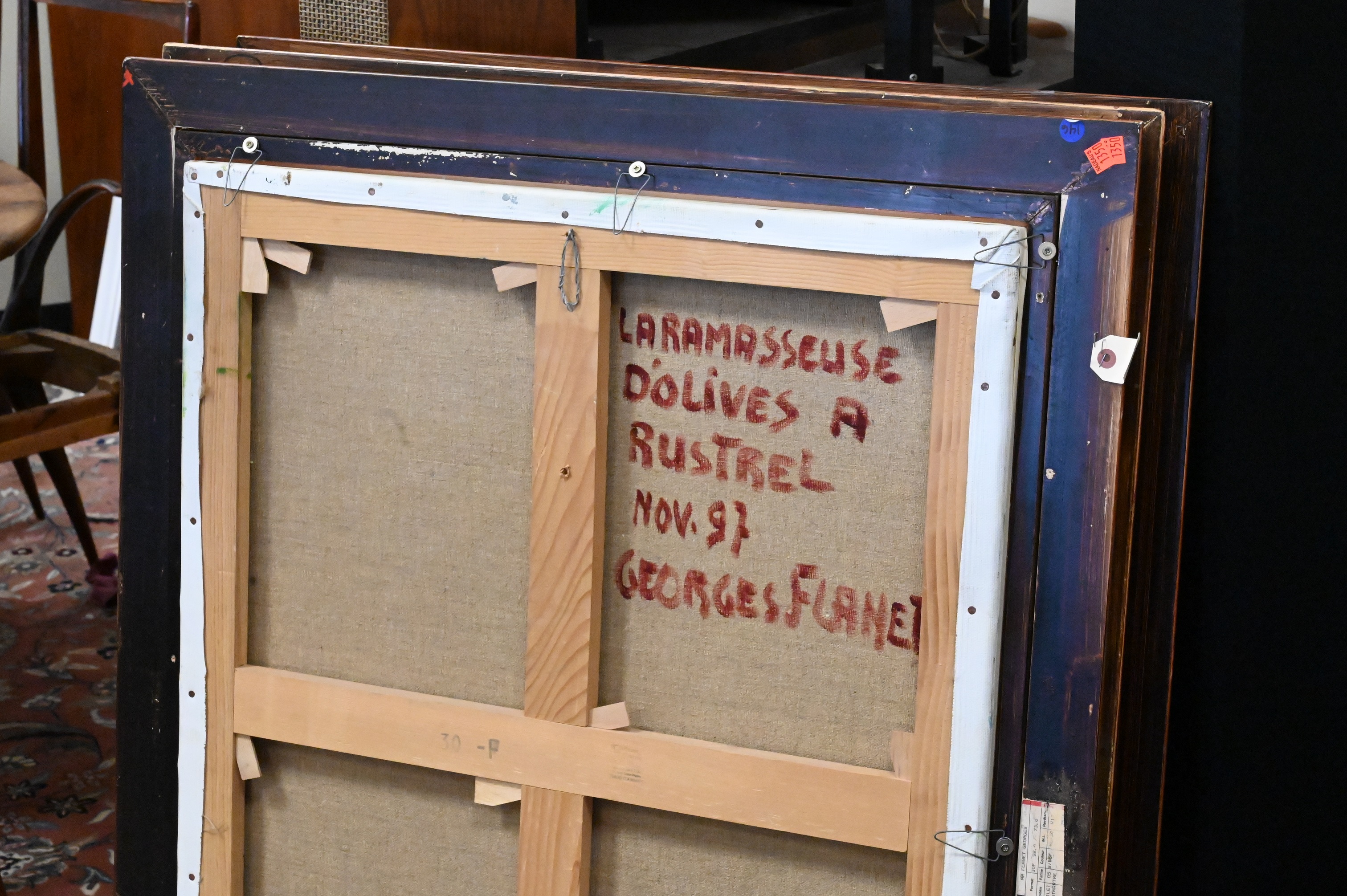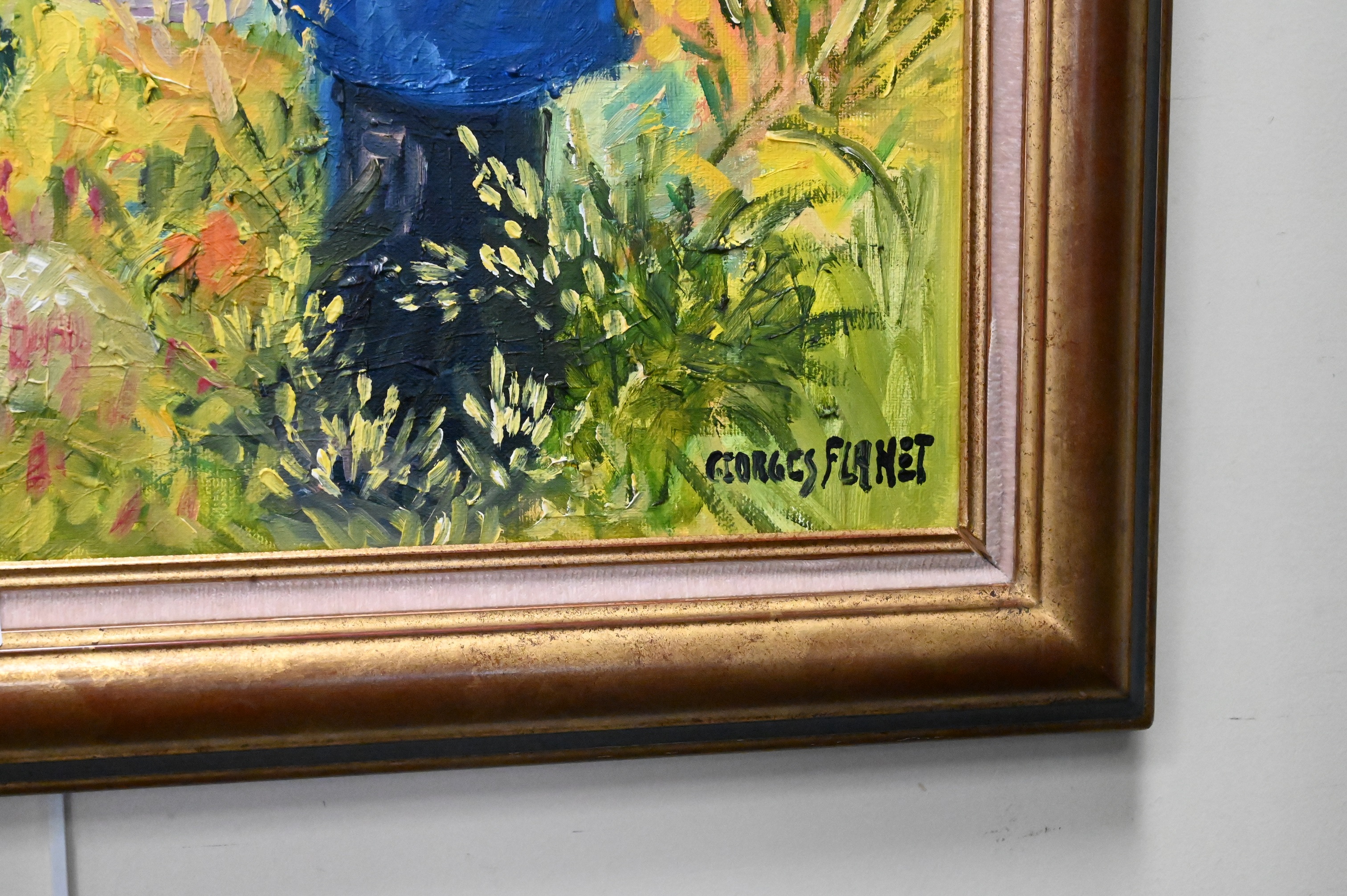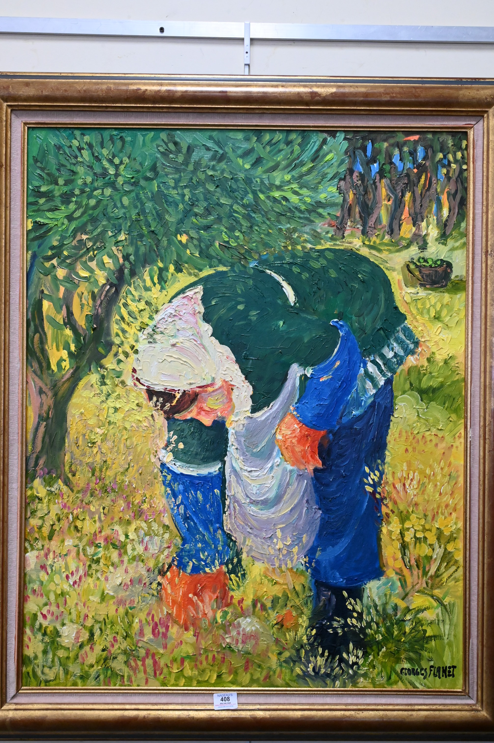 Georges Flanet (b. 1937), oil on canvas, A Woman in a Garden, 1997, Laramasseuse Dolives A Rustrel, titled, signed ‘Georges Flanet’ and dated on back, 36″ x 29″, overall good condition, original Delf Cadres d’Art label on back, along with copy of original receipt from artist gallery for $18,000 in 1998. Provenance: Property from a private New York collection sold to benefit charitable foundations.