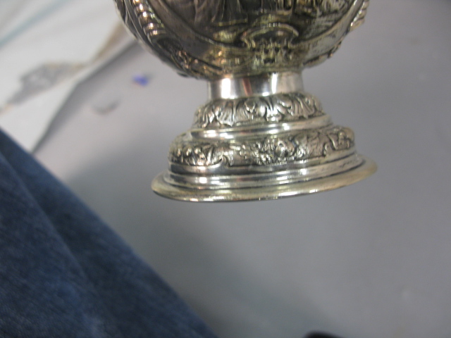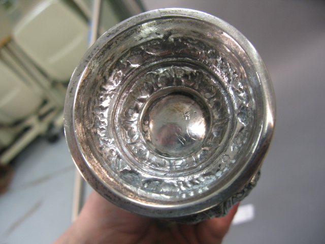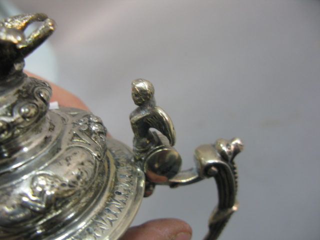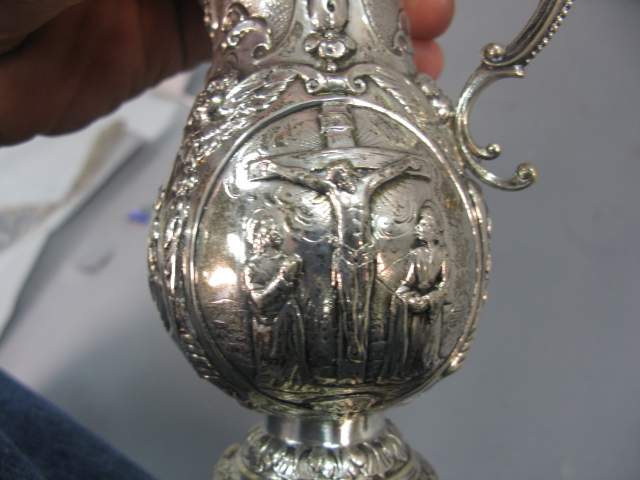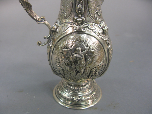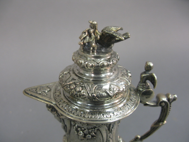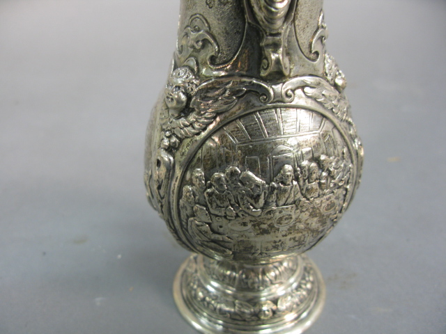 German silver ewer having three chased panels, The Resurrection, The Last Supper and The Crucifixion, top mounted with four birds along with letter from Fels Gallery Fifth Avenue New York to Mrs. Henry Roberts stating it is from Nurnberg circa 1600. Provenance: Governor Henry Roberts Edward Roberts 1110 Prospect Ave Hartford to present owner.