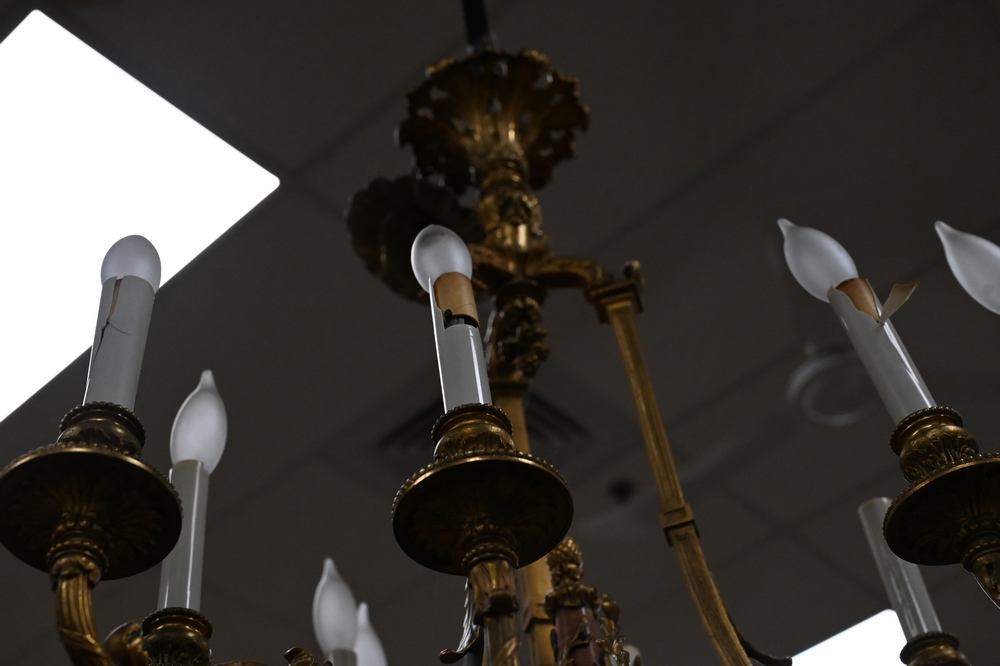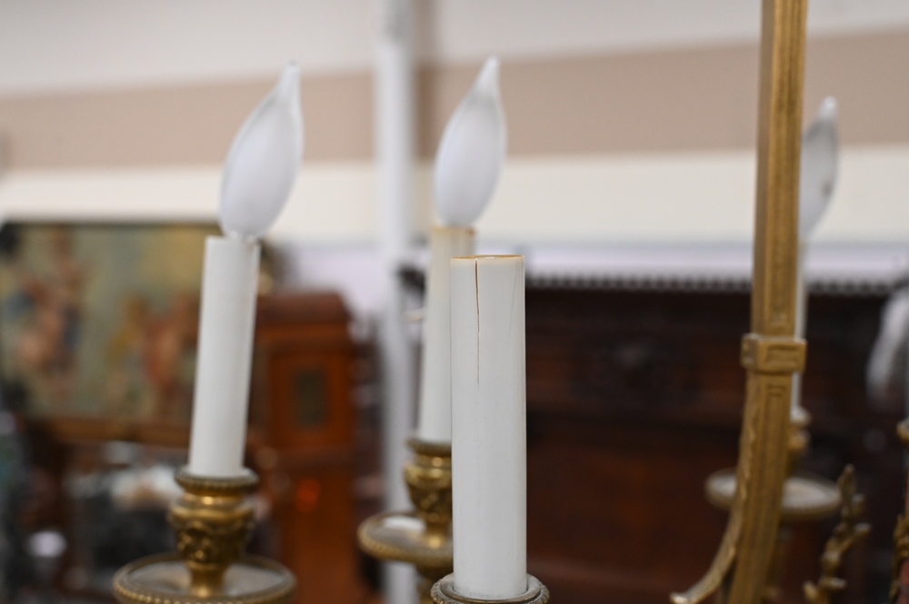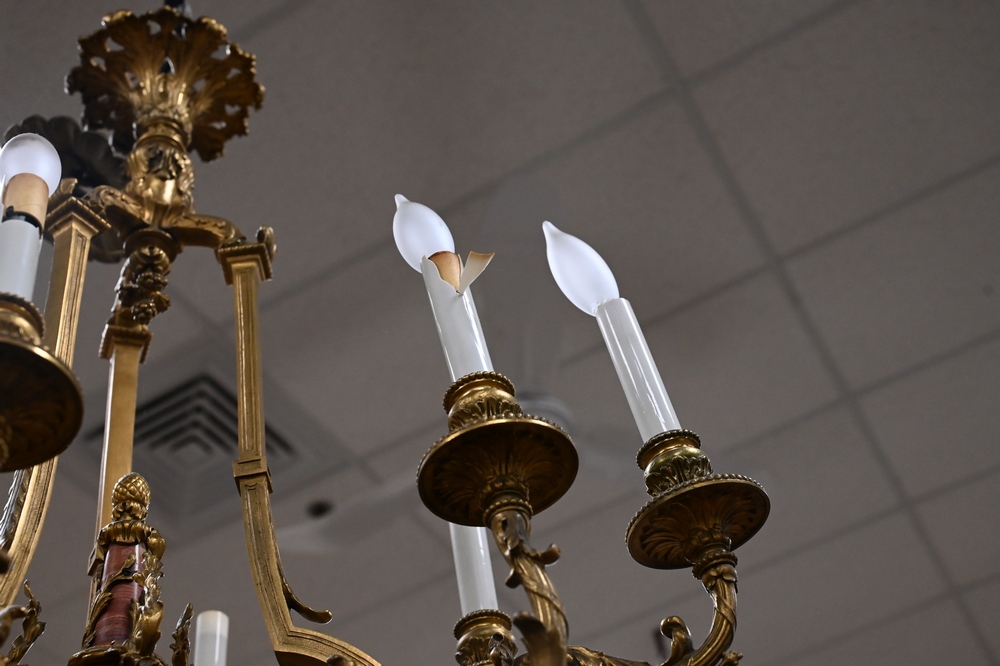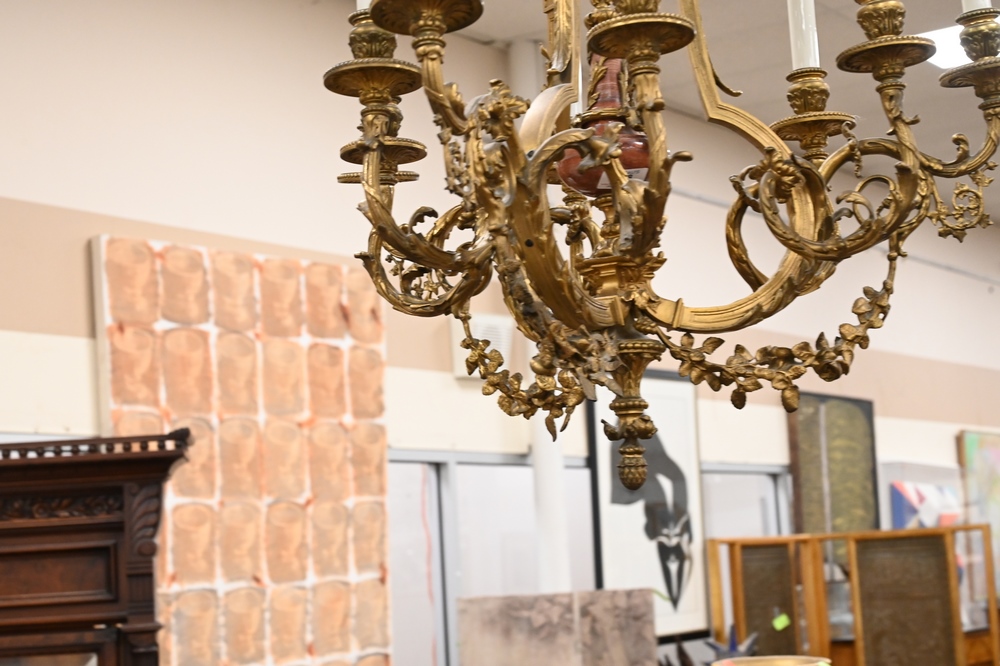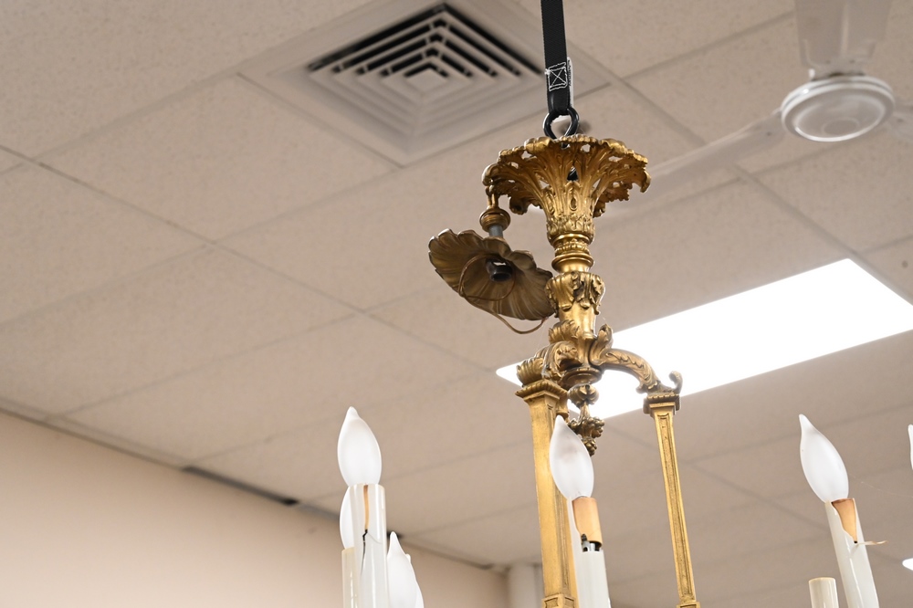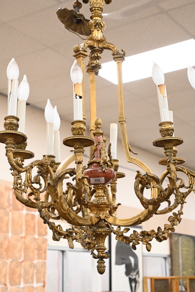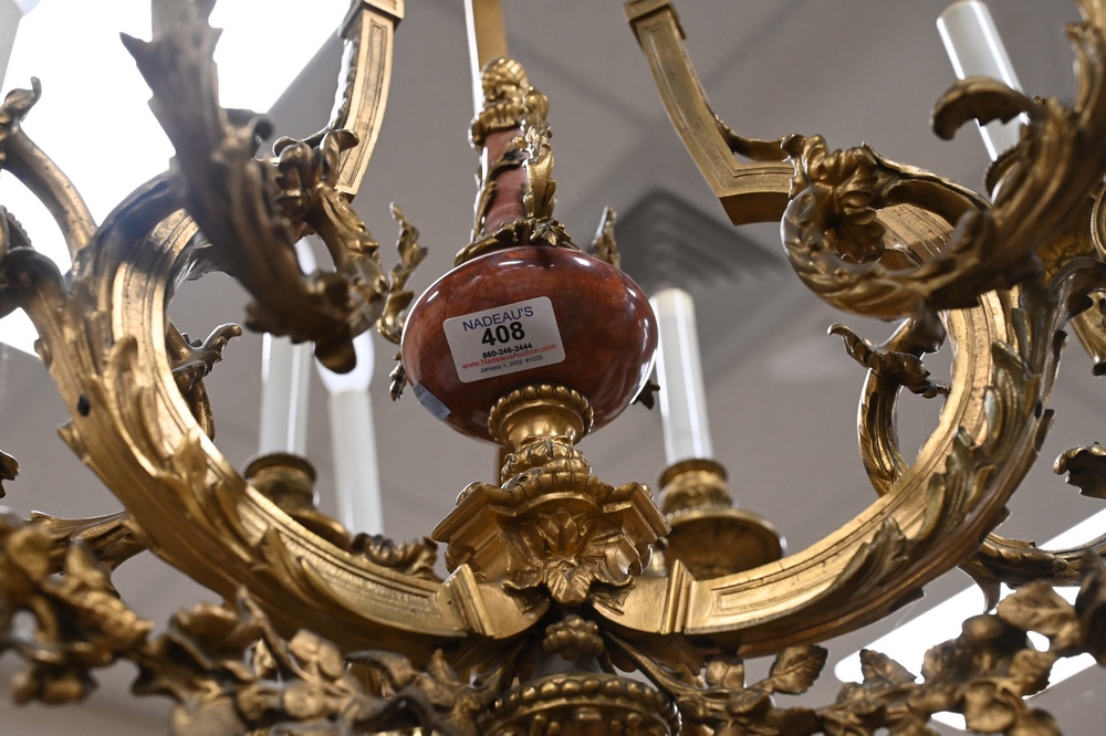 Lot 408: Gilt Bronze Louis XV Style Chandelier, having marble center with nine lights, height 40 inches, diameter 25 inches. Provenance: The …