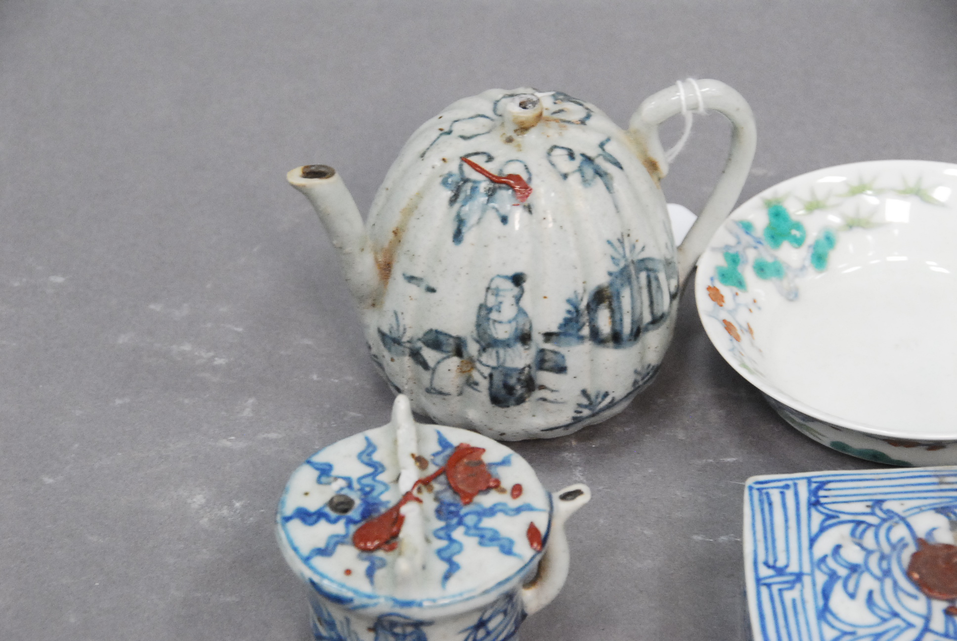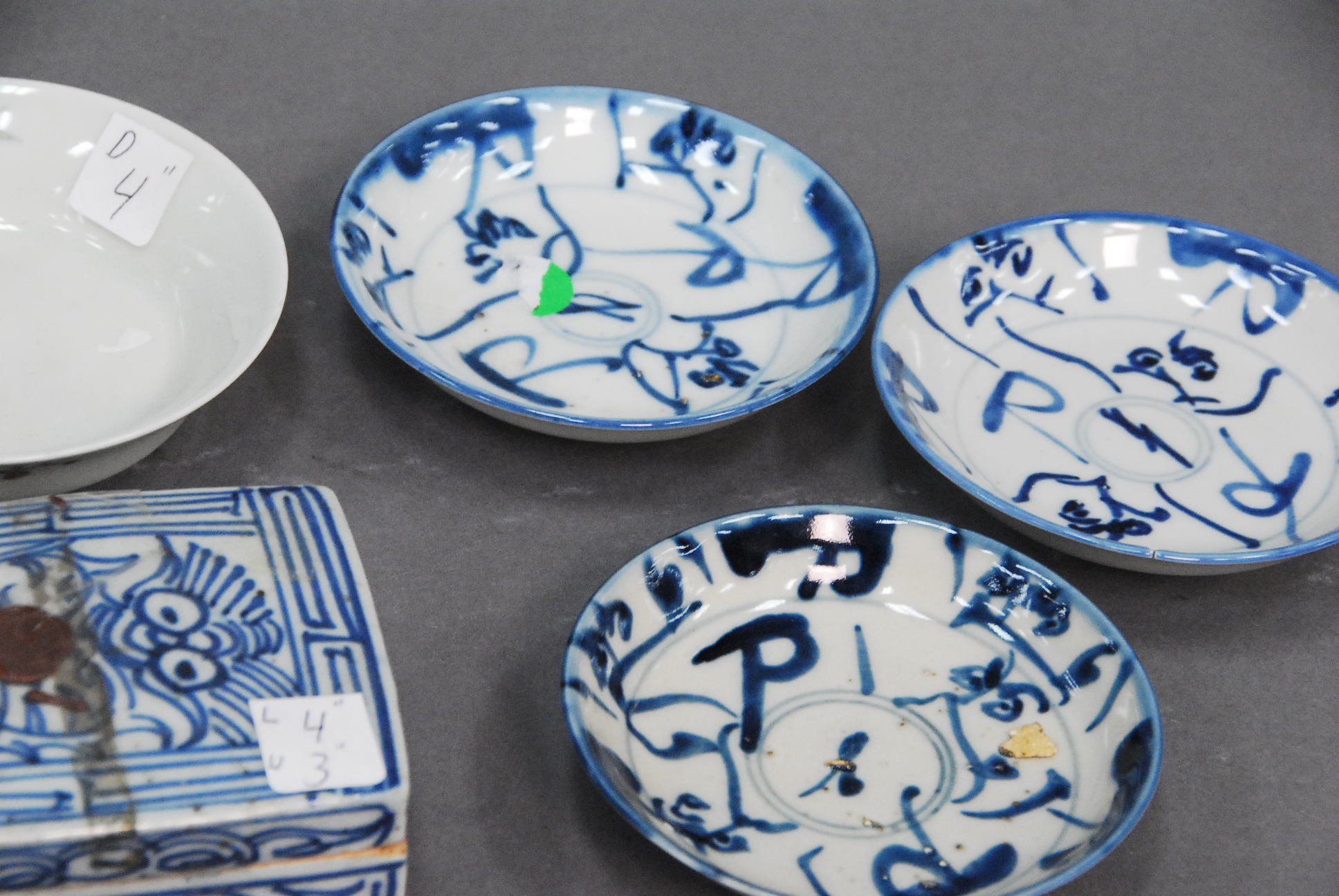 Group lot of seven pieces to include three small blue and white dishes dia. 4, a Famille Rose small dish dia. 4 1/2, two small tea pots both as is hts. 2 1/2 and 3 1/2, and a small blue and white covered box 3 x 4.