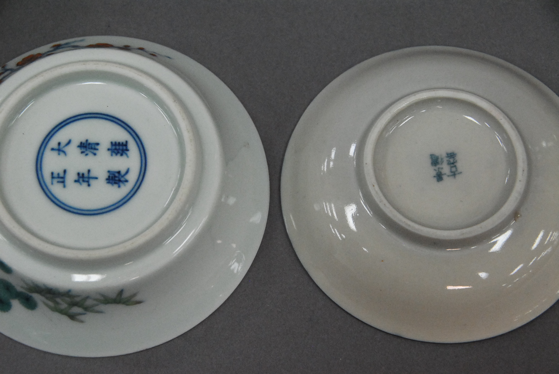 Lot 408: Group lot of seven pieces to include three small blue and white dishes dia. 4, a Famille Rose small dish dia. 4 1/2, two small te…