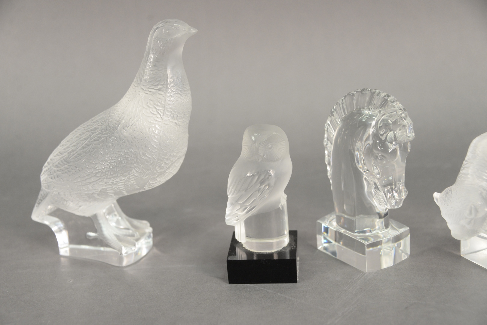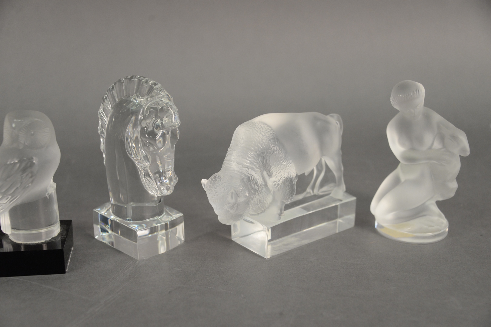 Group of Five Lalique and Steuben Paperweights, to include a crystal horse head marked Steuben to the underside, along with a Lalique bison, owl, pigeon, and female figure, all marked Lalique, tallest 6 3/4 inches. Provenance: Estate of James Wadhams