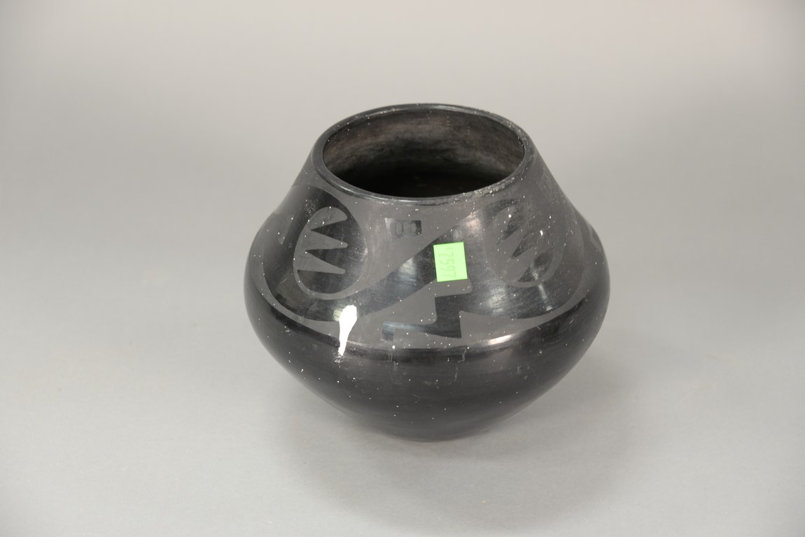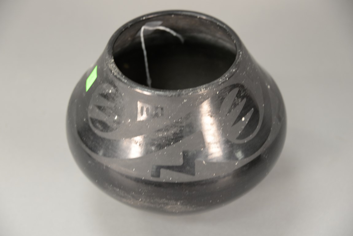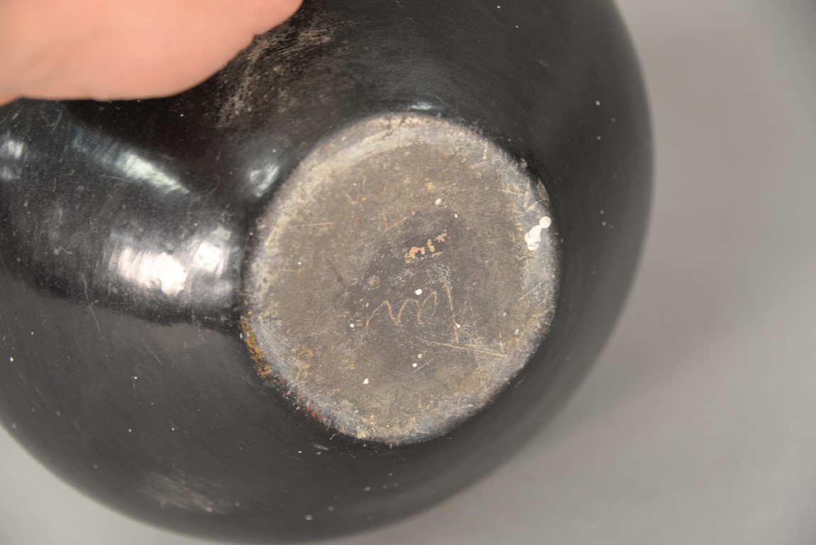 Maria black pottery bowl, small white paint spots. ht. 7 in. opening dia. 4 1/2 in.