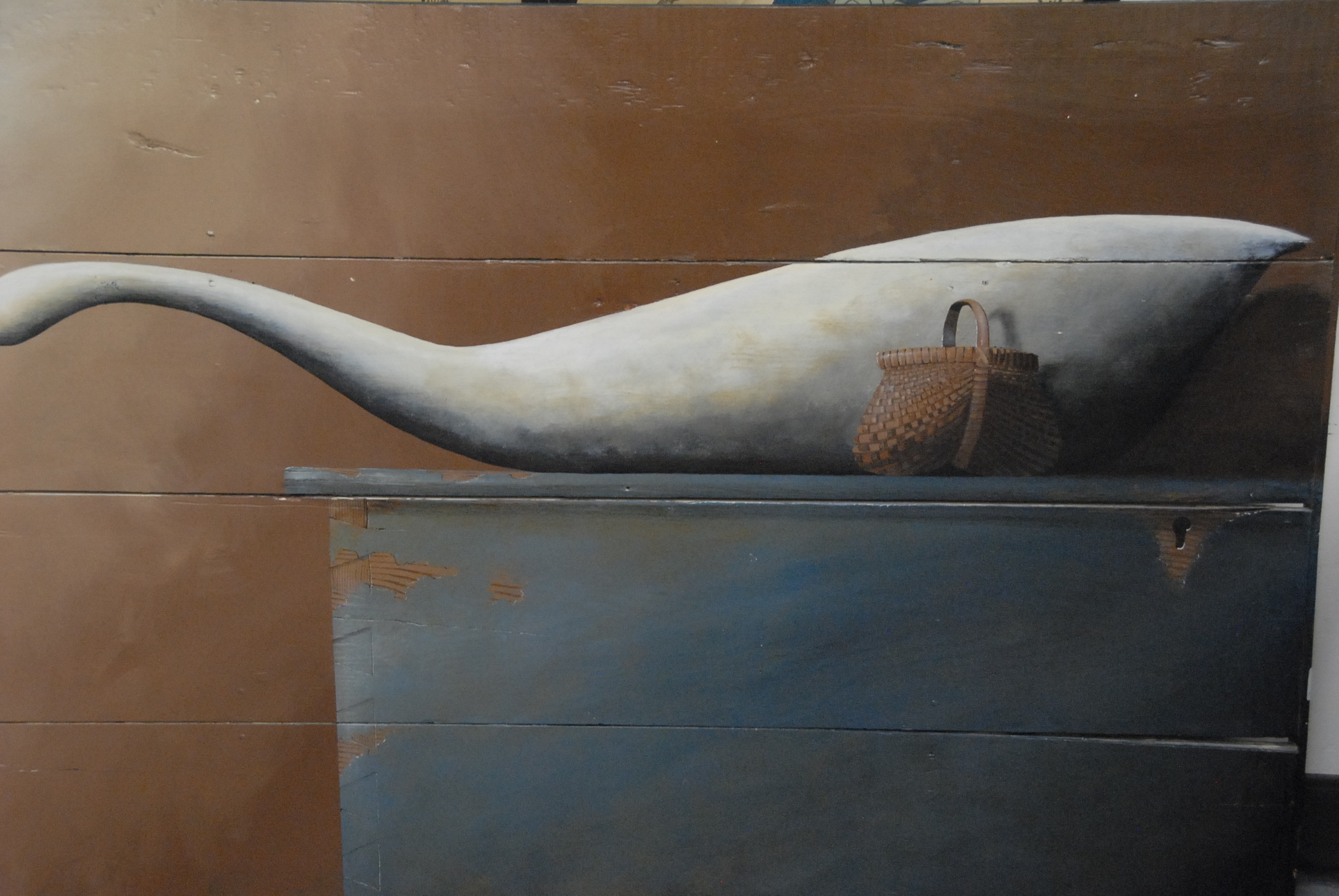 Lot 408: Mike Butler SWAN DECOY ON BLUE BLANKET CHEST oil on board still life signed lower right Mike Butler late 20th century 29 1/2 x 42 1/2