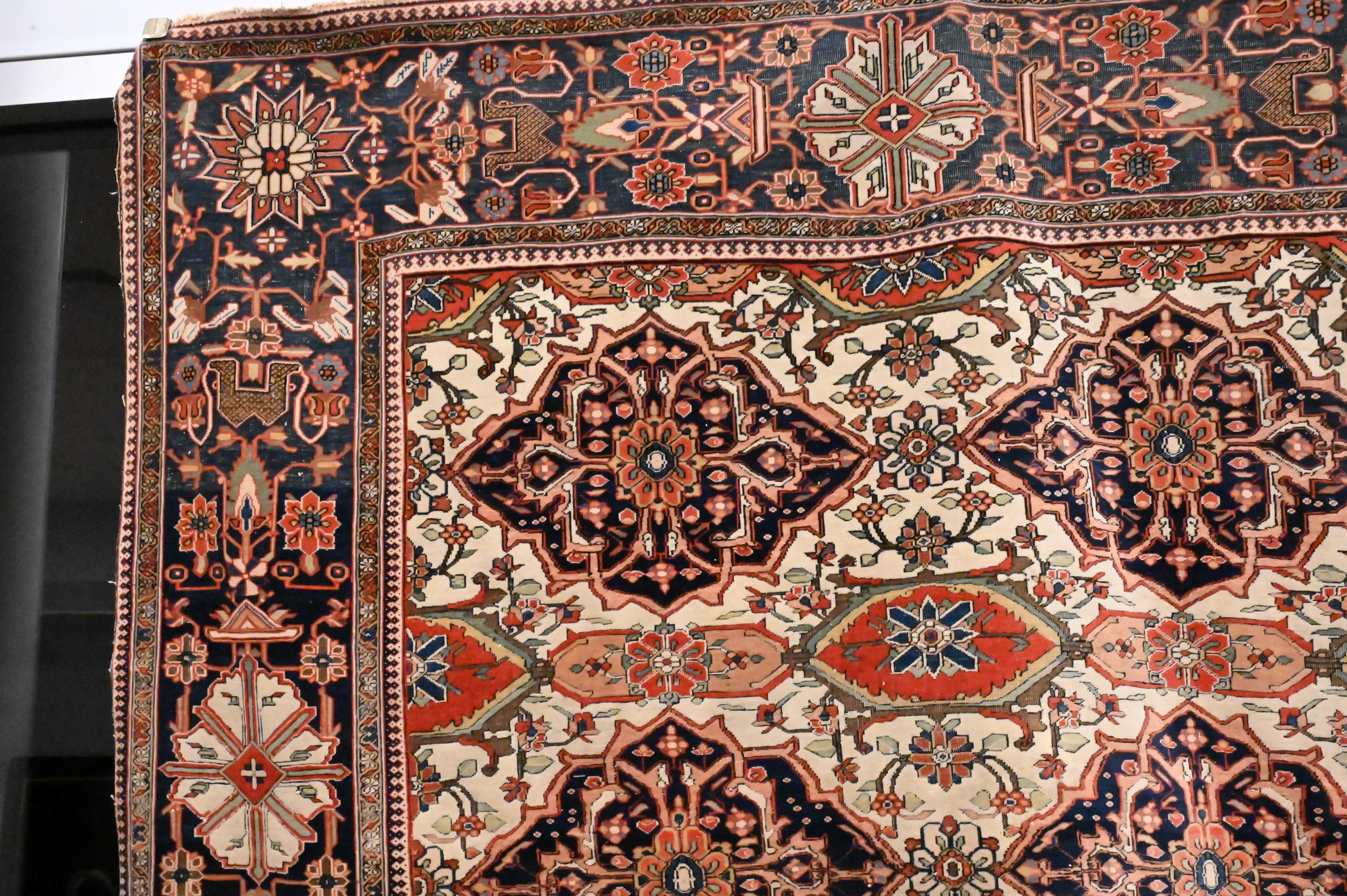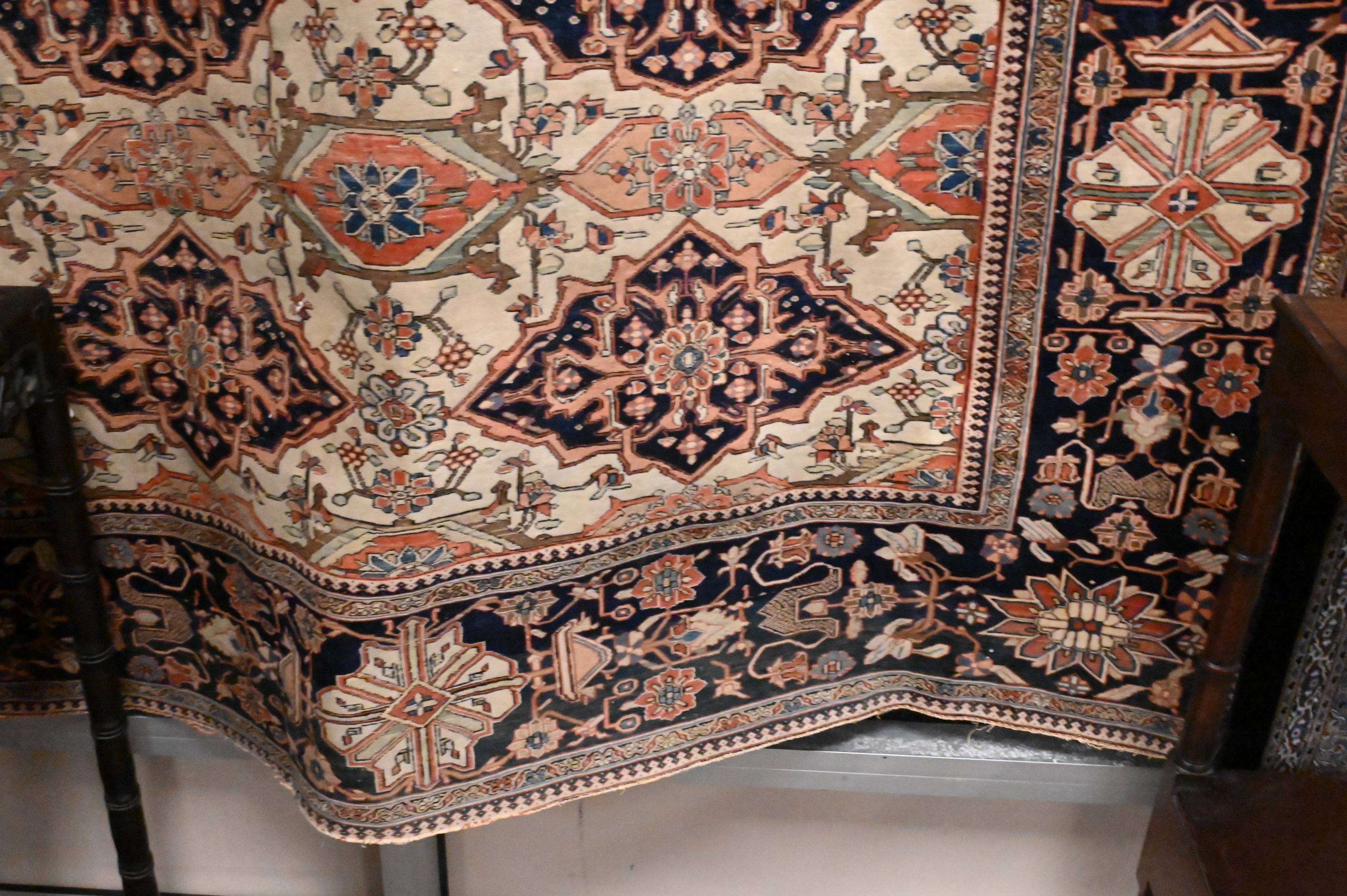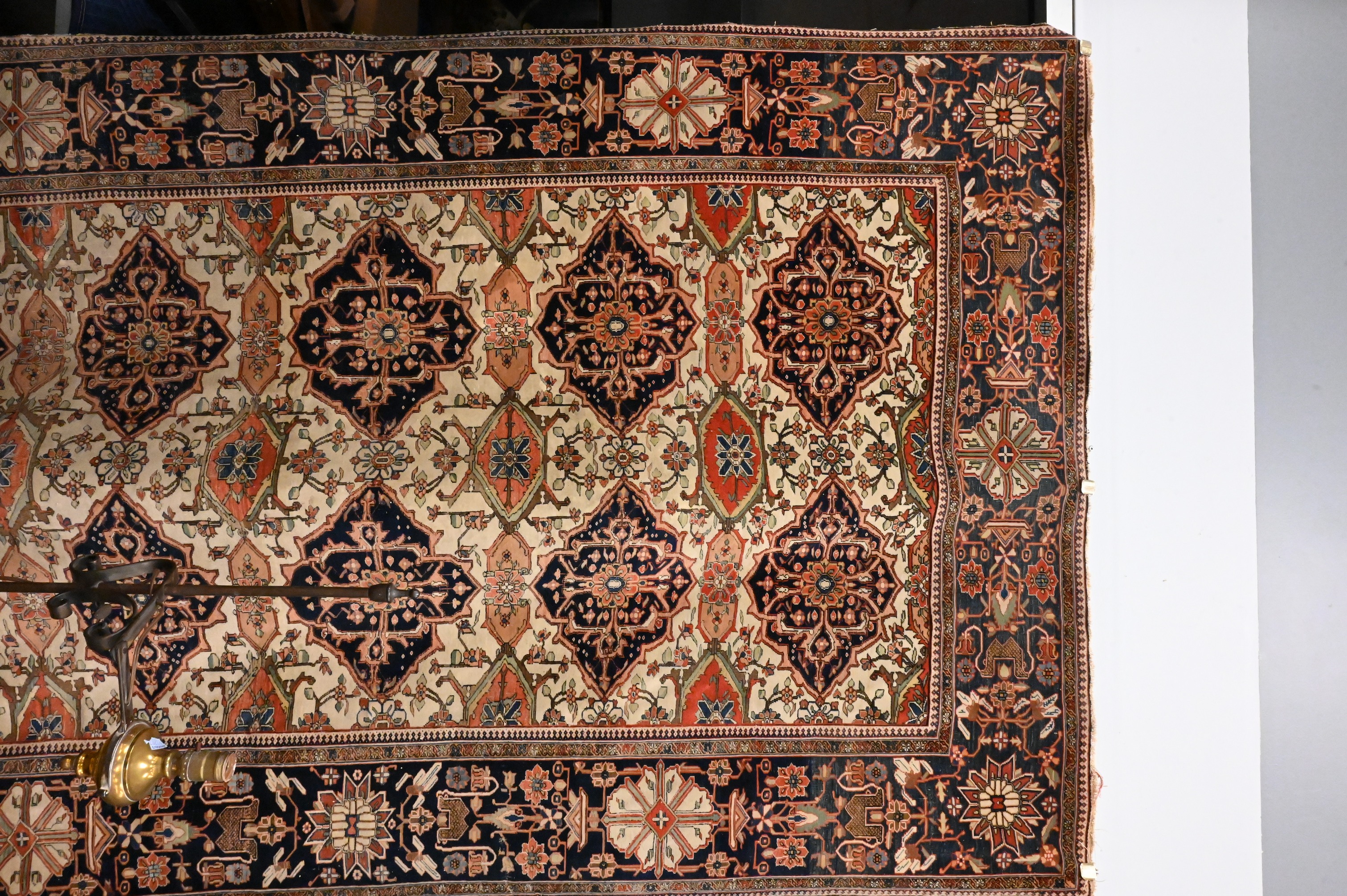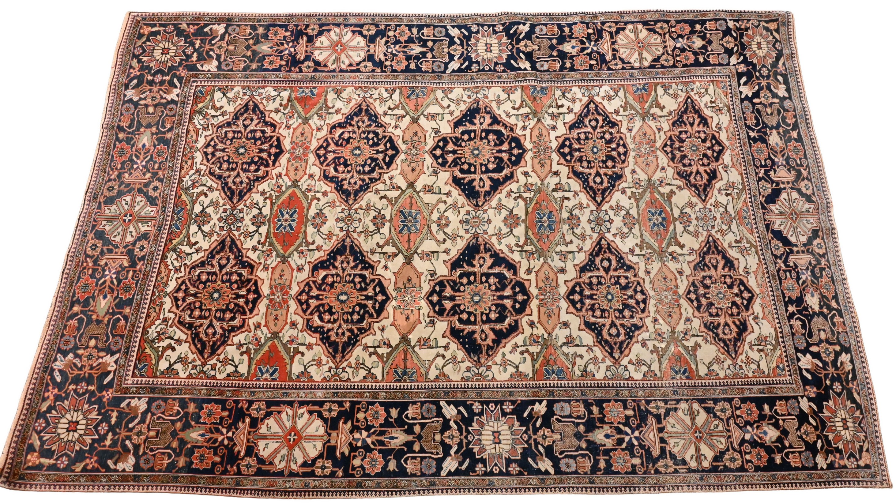 the cream-ground having two rows of five shaped diamond-form medallions surrounded by a stylized herati lattice, the outer cobalt blue-ground border with large rosettes and geometric vines