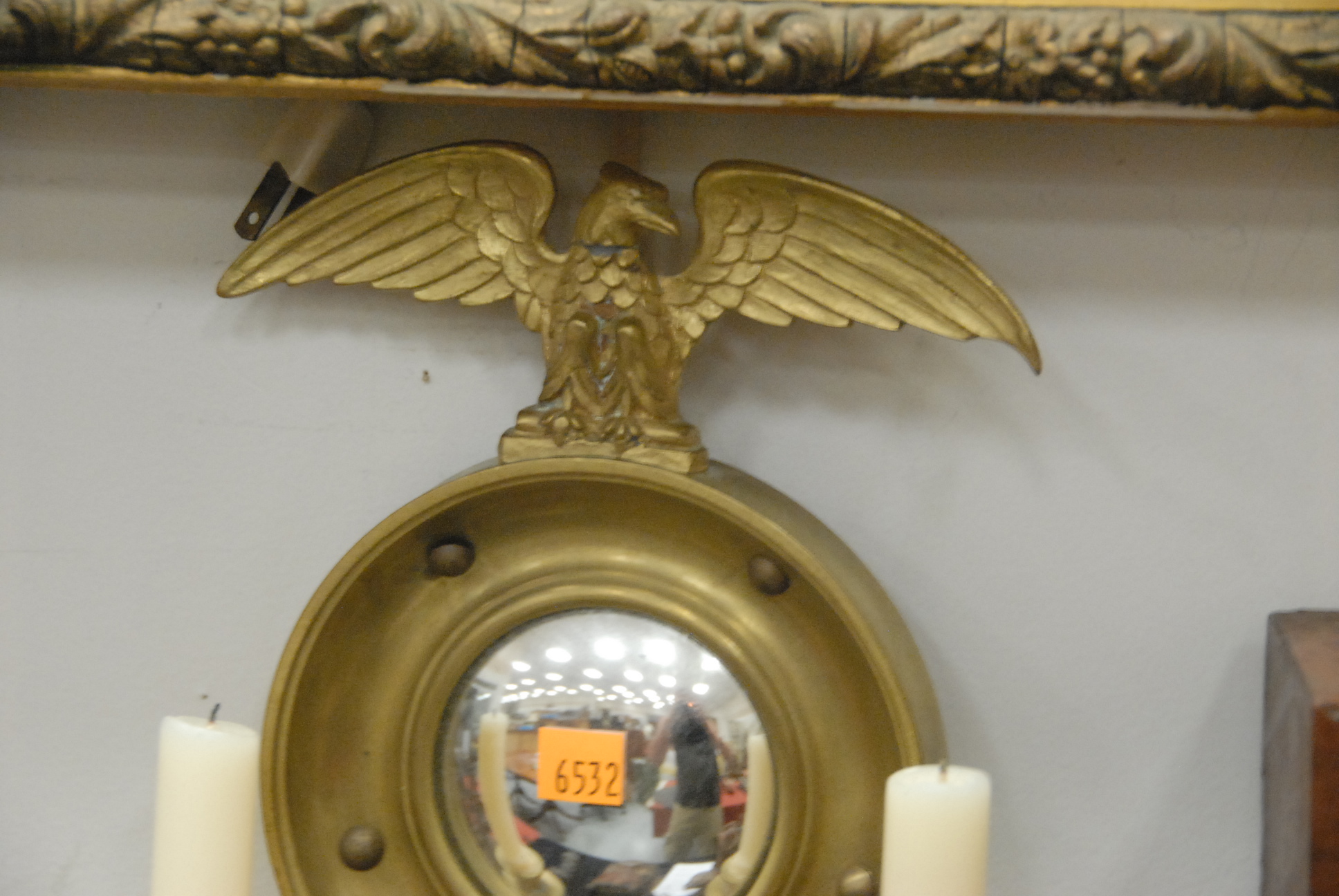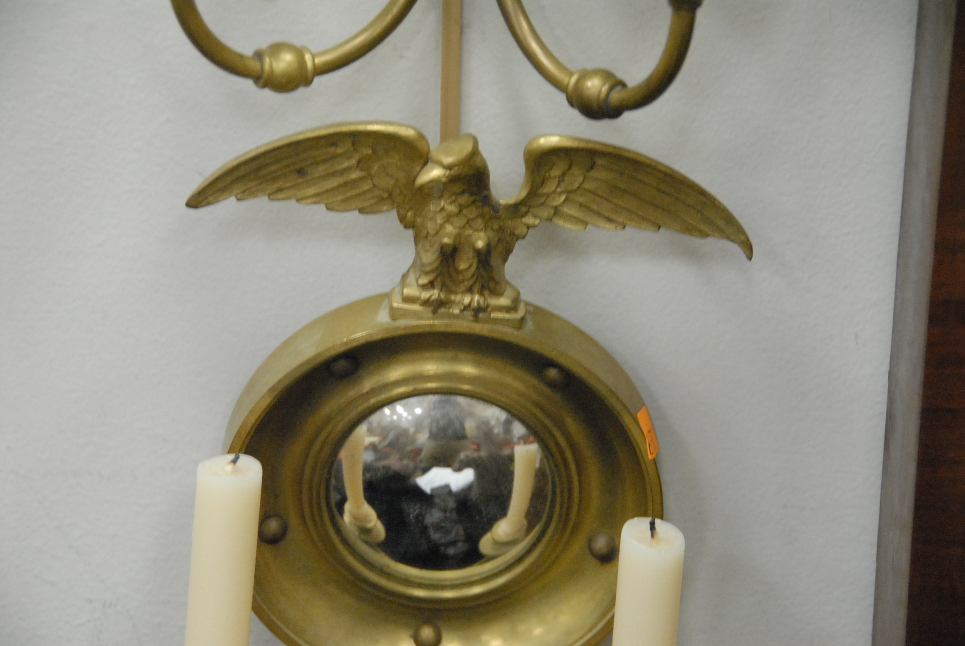 Pair of bulls eye mirrored brass sconces with eagle tops.