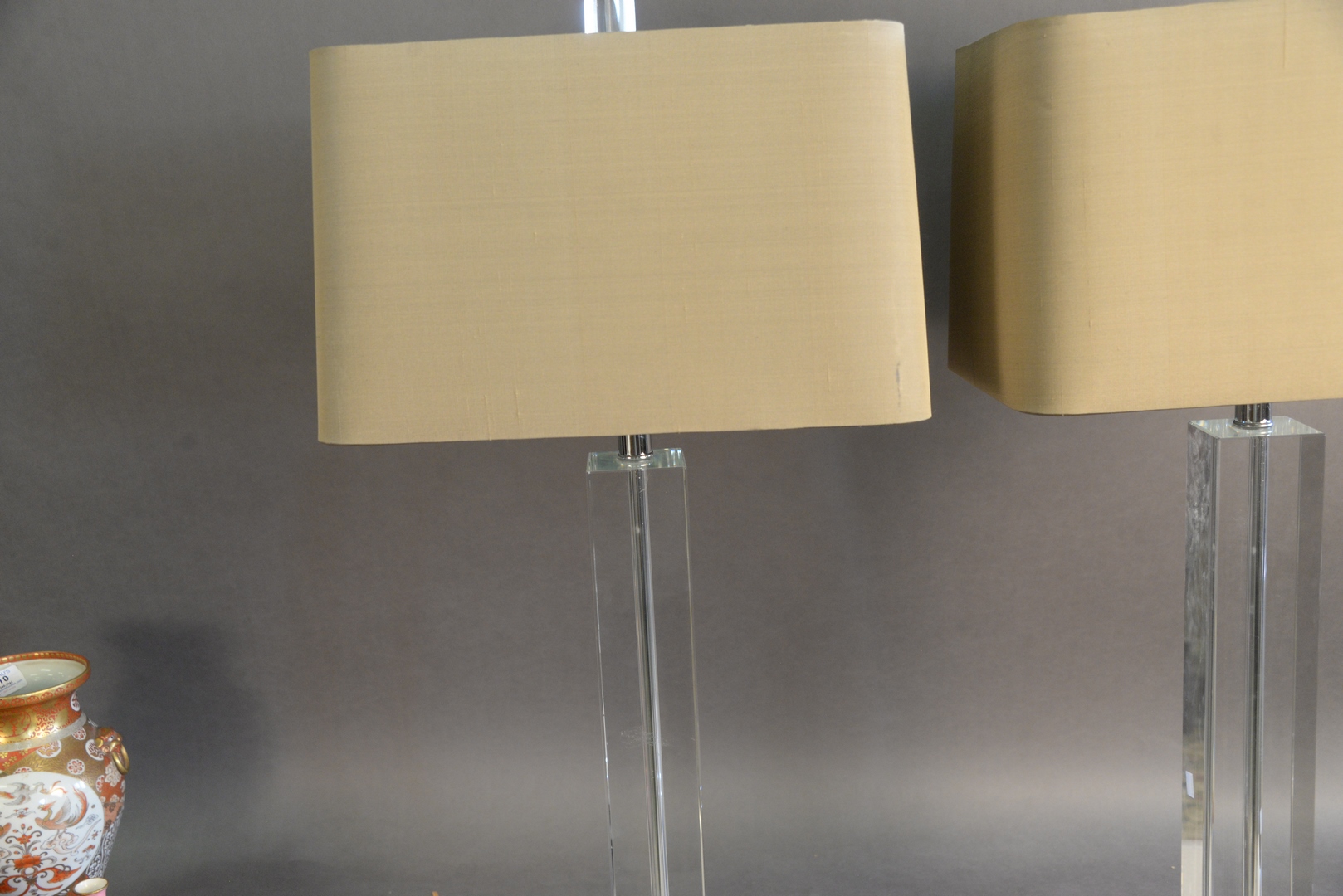 Lot 408: Pair of Contemporary Glass Table Lamps having square column form or granite bases with John RIchard silk shades, height 34 inches.