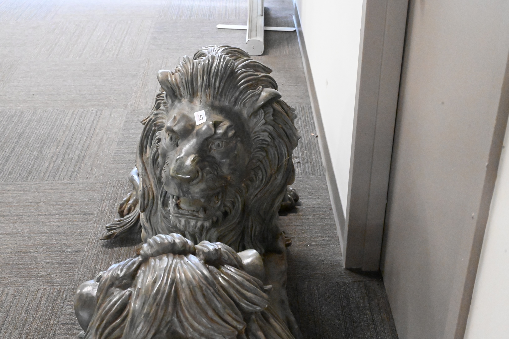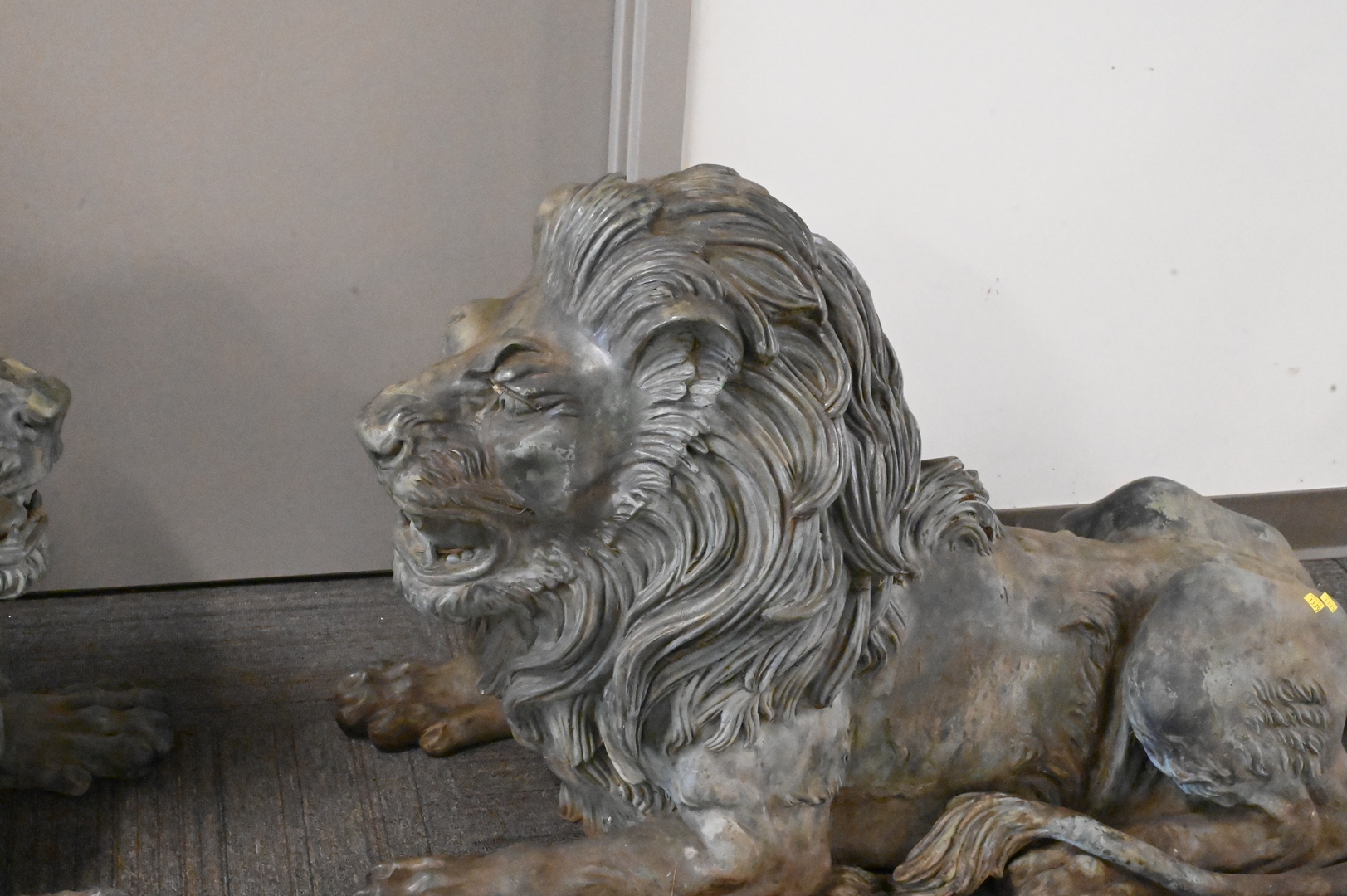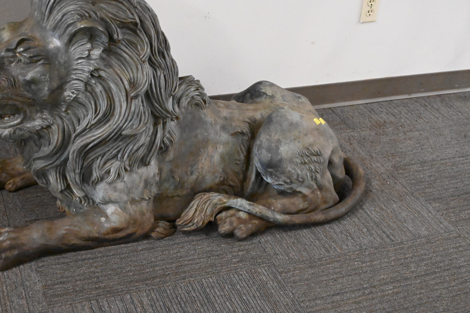 Pair of Outdoor Recumbent Bronze Lions, height 27 inches, length 46 inches.