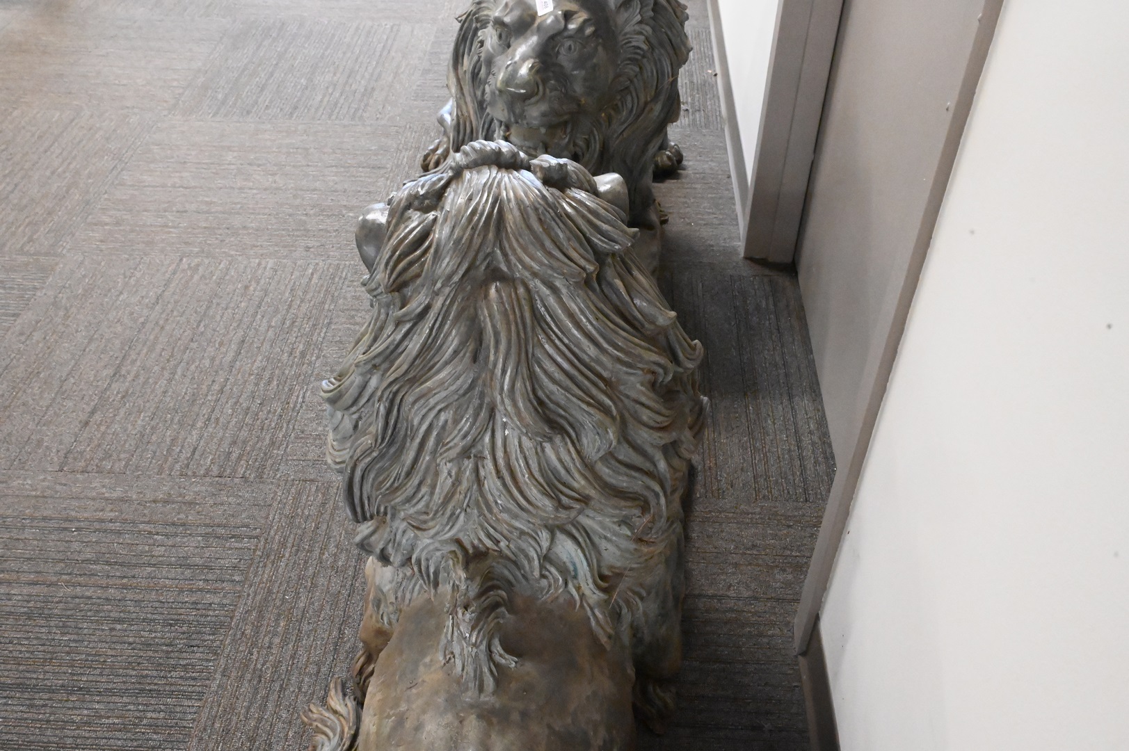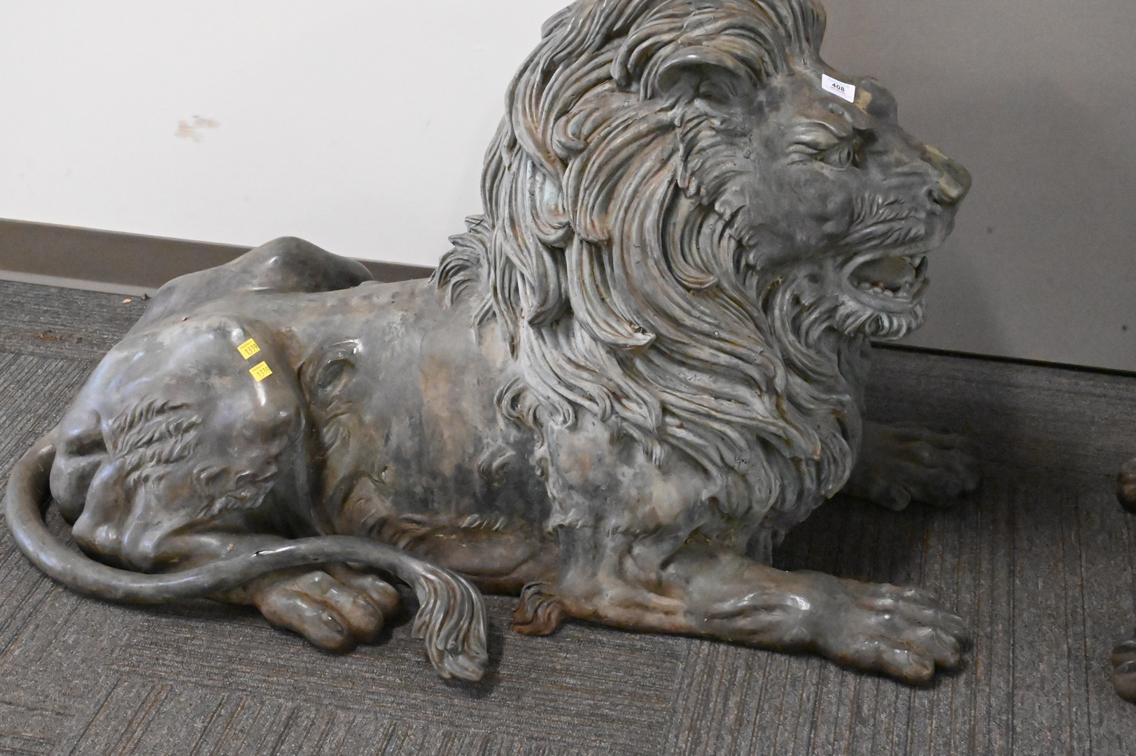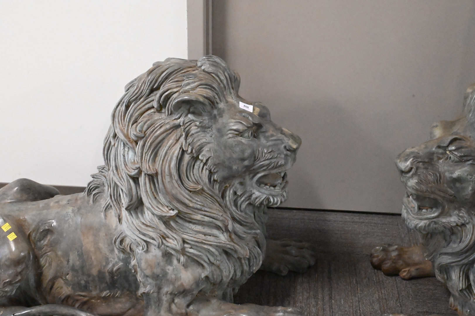 Pair of Outdoor Recumbent Bronze Lions, height 27 inches, length 46 inches.
