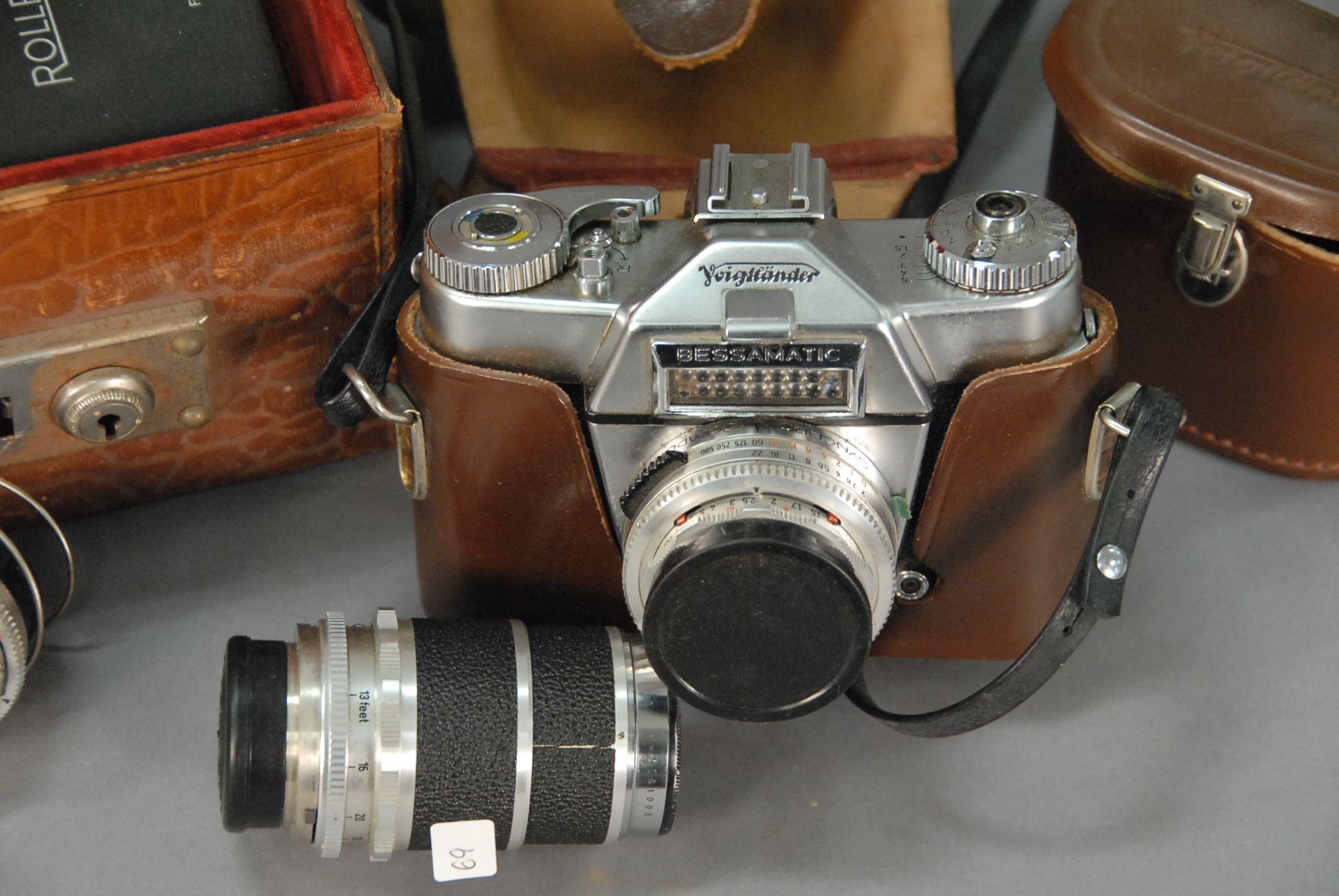 Lot 408: Rolleiflex camera in case with lenses along with Voigtlander Bessamatic camera with 35 mm 35/3.4 Voigtlander Skoparex lens and Super…