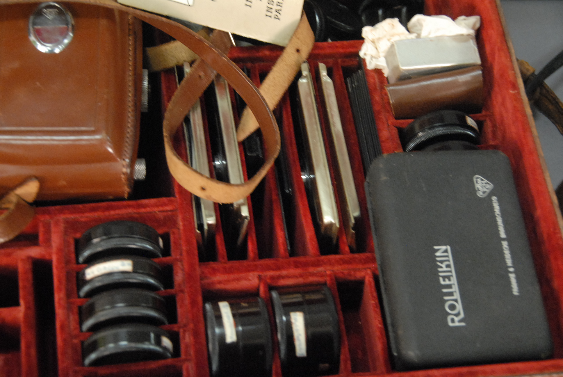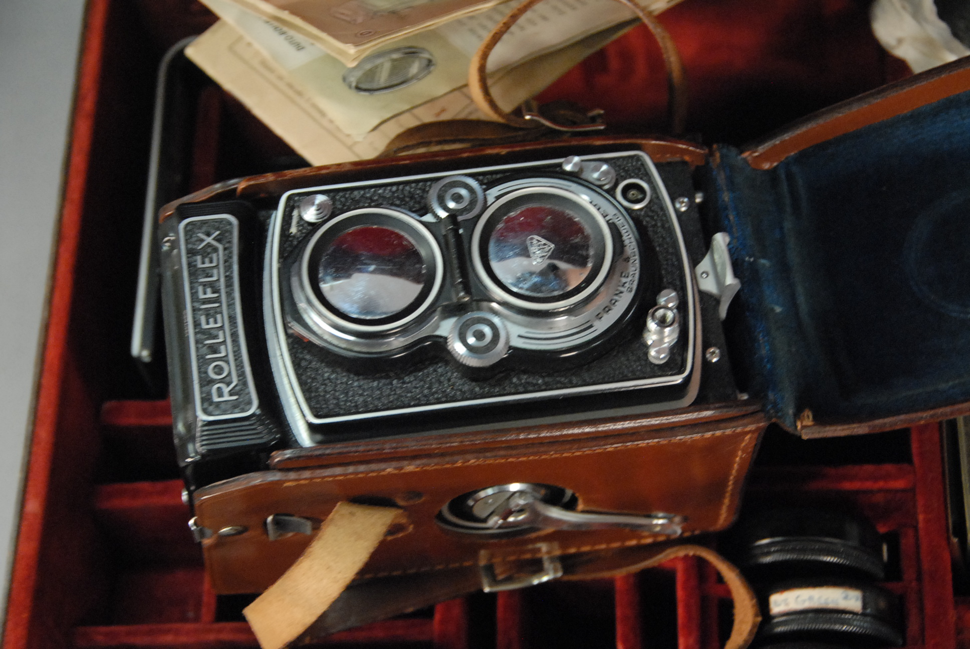 Rolleiflex camera in case with lenses along with Voigtlander Bessamatic camera with 35 mm 35/3.4 Voigtlander Skoparex lens and Super-Dynarex 135/4 lens.