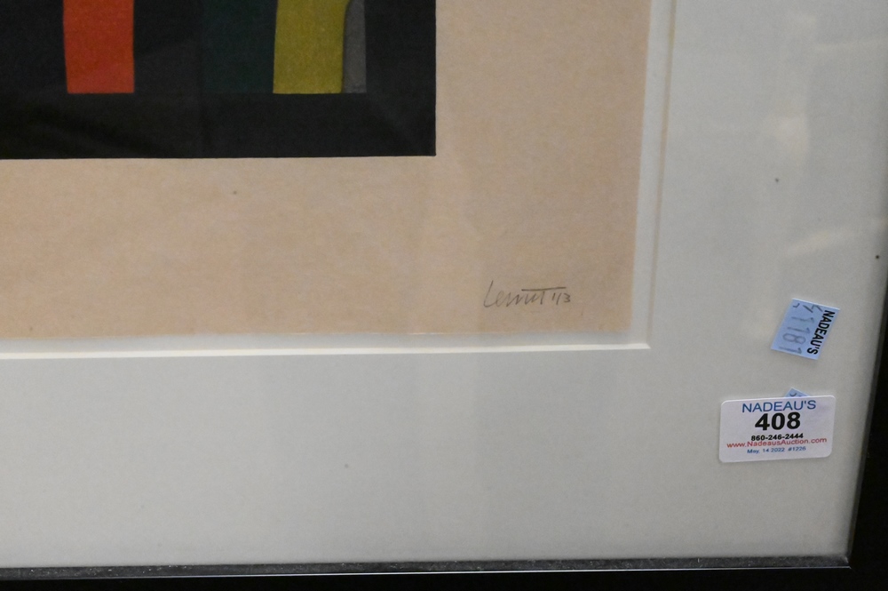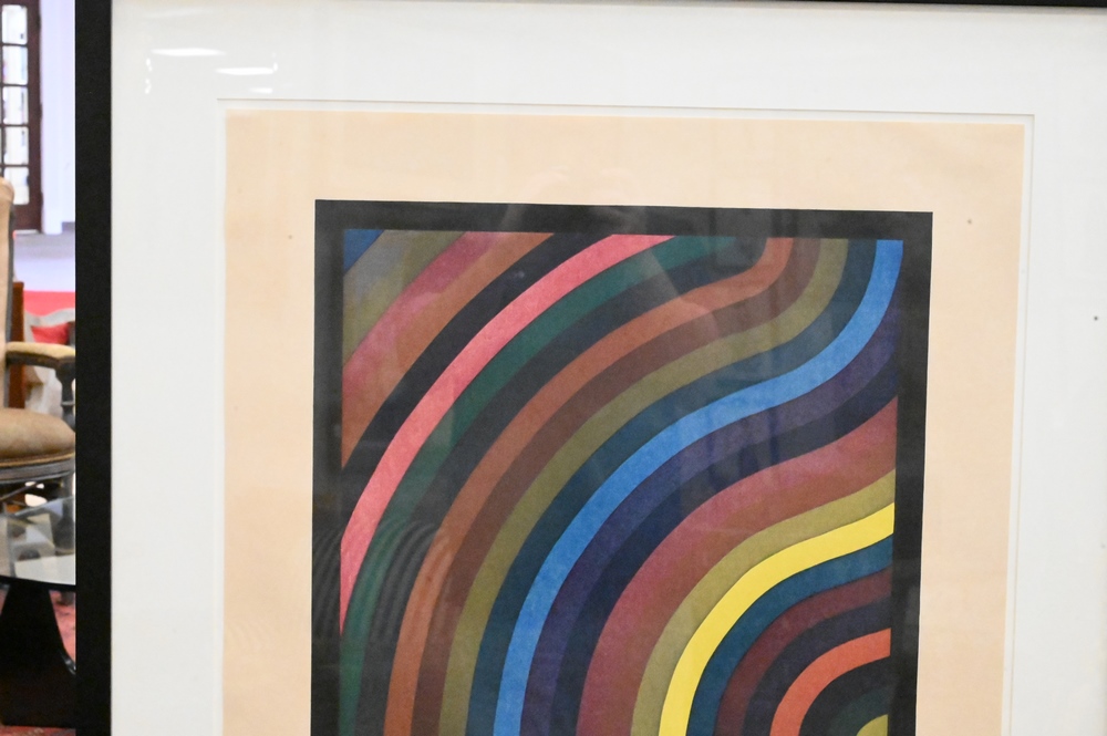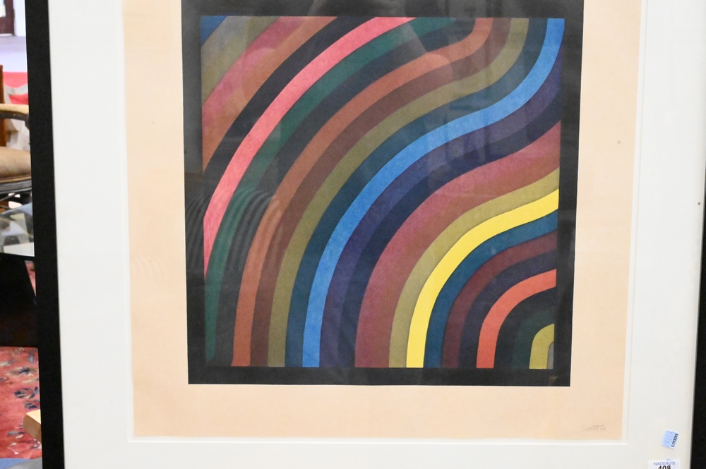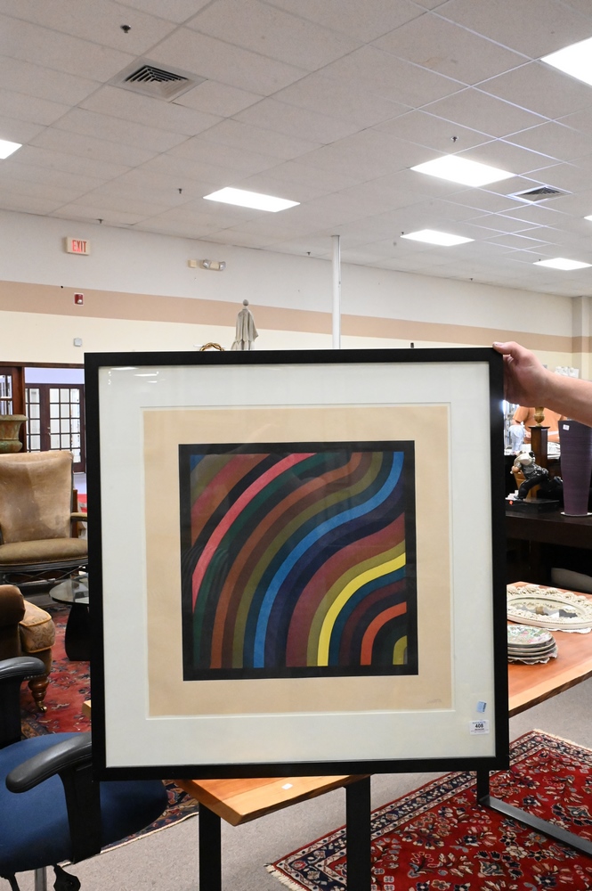 Lot 408: Sol LeWitt (1928 – 2007), Curved Bands, woodcut in colors, pencil numbered lower right third, pencil signed lower right LeWitt, matted in contemporary frame, paper size 22 1/2″ x 22 1/2″, image size 17 1/2″ x 17 1/2″.