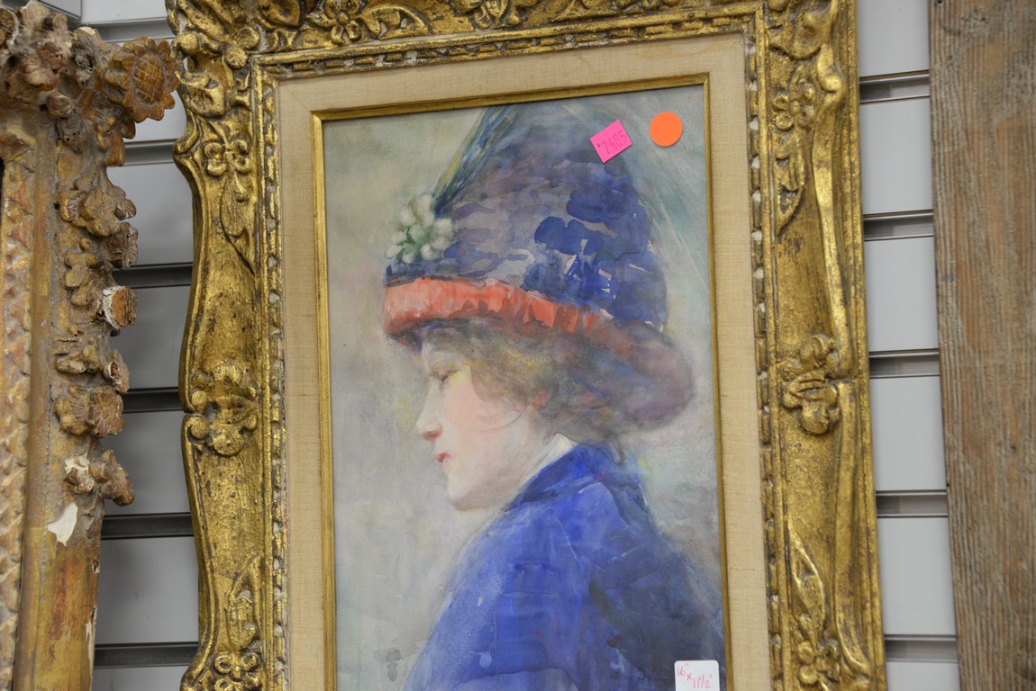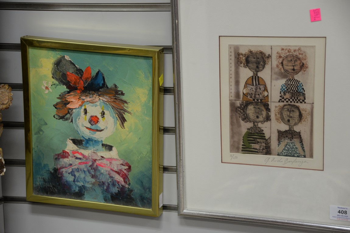 Three framed pieces to include Graciela Rodo Boulanger 1935 colored etching signed lower right G. Rodo Boulanger and numbered lower left 16/150, an oil on canvas Pablo Matania of a clown, and a watercolor of a girl with a hat.